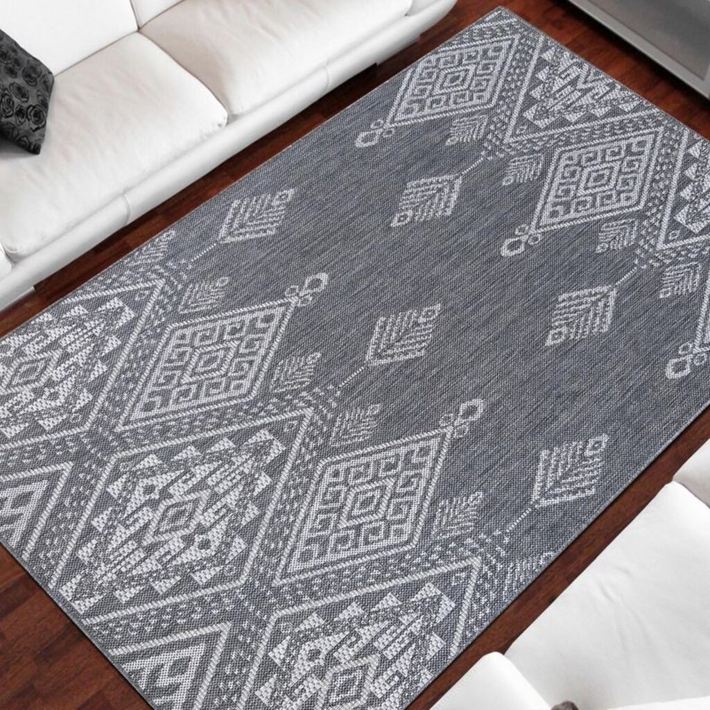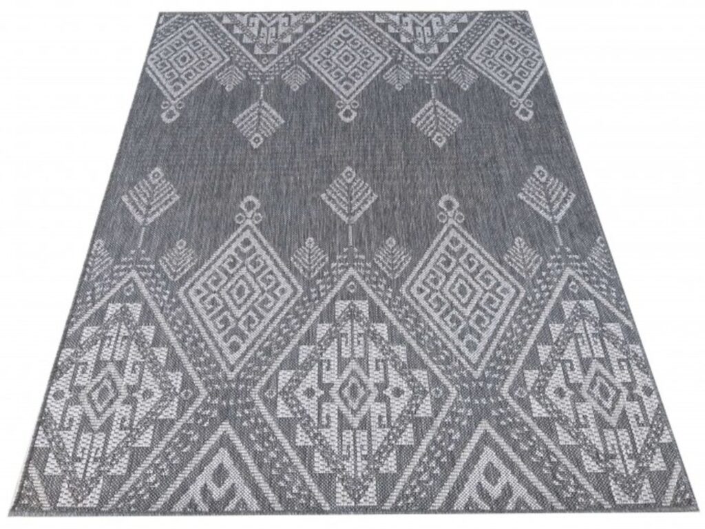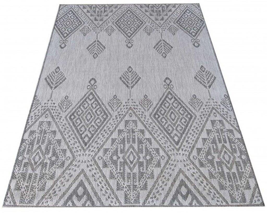 Dywan sznurkowy Carla 00.13 gray z kolekcji sznurkowy to prawdziwa perełka dla miłośników eleganckiego i nowoczesnego designu. Głównym kolorem dywanu jest głęboki, stonowany szary, który nadaje wnętrzu spokoju i harmonii. Dodatkowe kolory pojawiają się w postaci subtelnych, jaśniejszych odcieni szarości, które tworzą intrygujący wzór. Wzór dywanu jest niezwykle interesujący – składa się z geometrycznych kształtów, które przypominają tradycyjne wzory etniczne. Centralnym motywem są duże, romboidalne figury, wypełnione mniejszymi, skomplikowanymi wzorami, które przywodzą na myśl starożytne symbole i ornamenty. Na brzegach dywanu pojawiają się mniejsze, powtarzające się motywy, które dodają całości dynamiki i ruchu. Dywan nie posiada frędzli, co nadaje mu bardziej współczesny charakter.