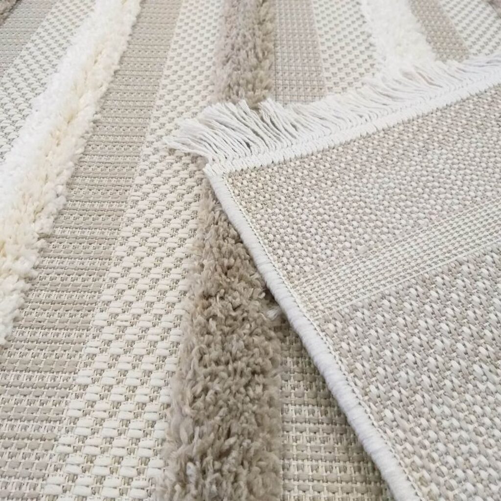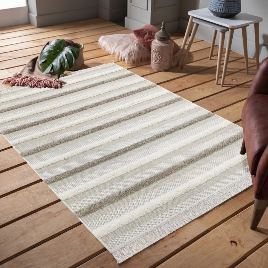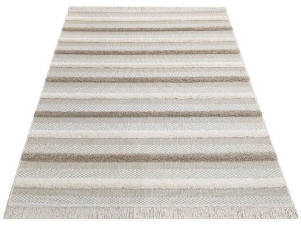 Dywan sznurkowy Dello 003 beige to prawdziwa perełka dla miłośników minimalistycznego designu i neutralnych barw. Jego główny kolor to delikatny beż, który doskonale komponuje się z dodatkowymi odcieniami szarości i bieli, tworząc harmonijną paletę barw. Wzór dywanu jest prosty, lecz niezwykle elegancki – składa się z regularnie powtarzających się poziomych pasów, które nadają mu nowoczesnego charakteru. Każdy pas jest subtelnie różny w odcieniu, co dodaje dywanowi głębi i dynamiki, mimo zachowania spójności kolorystycznej. Kształt dywanu jest klasycznie prostokątny, co sprawia, że łatwo dopasować go do różnych przestrzeni. Dodatkowym atutem są frędzle na obu krótszych bokach, które dodają mu rustykalnego uroku, łącząc w ten sposób nowoczesność z tradycją.