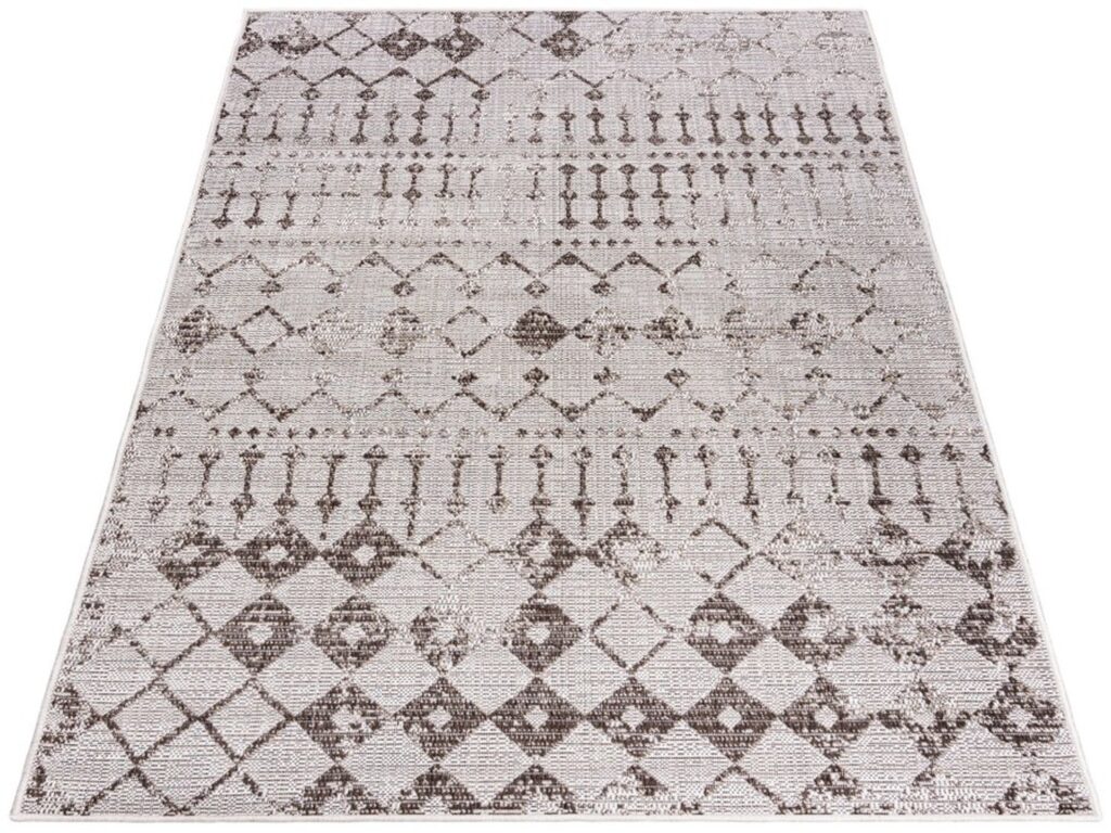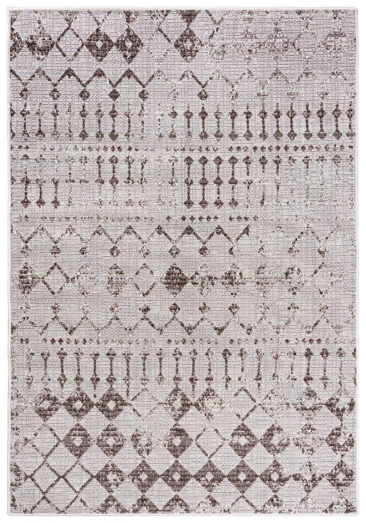 Dywan sznurkowy Toleo 00.71037 z kolekcji sznurkowy to prawdziwa perełka dla miłośników eleganckiego i nowoczesnego designu. Jego główny kolor to subtelny, jasny beż, który doskonale komponuje się z różnorodnymi wnętrzami, nadając im klasy i subtelności. Dodatkowe kolory, takie jak odcienie szarości i brązu, tworzą na dywanie intrygujący wzór, który przyciąga wzrok i dodaje głębi. Wzór dywanu jest geometryczny, złożony z powtarzających się rombów i linii, które tworzą harmonijną kompozycję. Centralna część dywanu wyróżnia się większymi, ciemniejszymi rombami, które kontrastują z jaśniejszym tłem, podczas gdy brzegi są zdobione delikatnymi, powtarzającymi się motywami, które subtelnie przechodzą w główny wzór. Dywan ma prostokątny kształt, co czyni go uniwersalnym wyborem do różnych pomieszczeń.