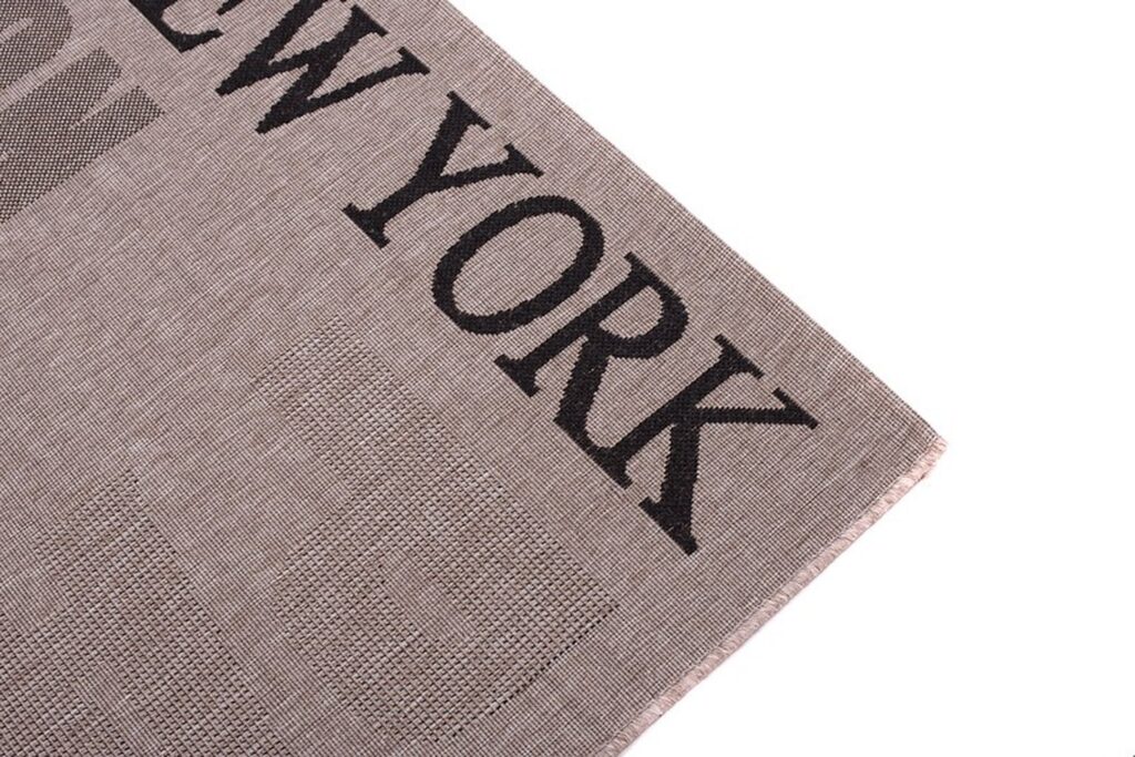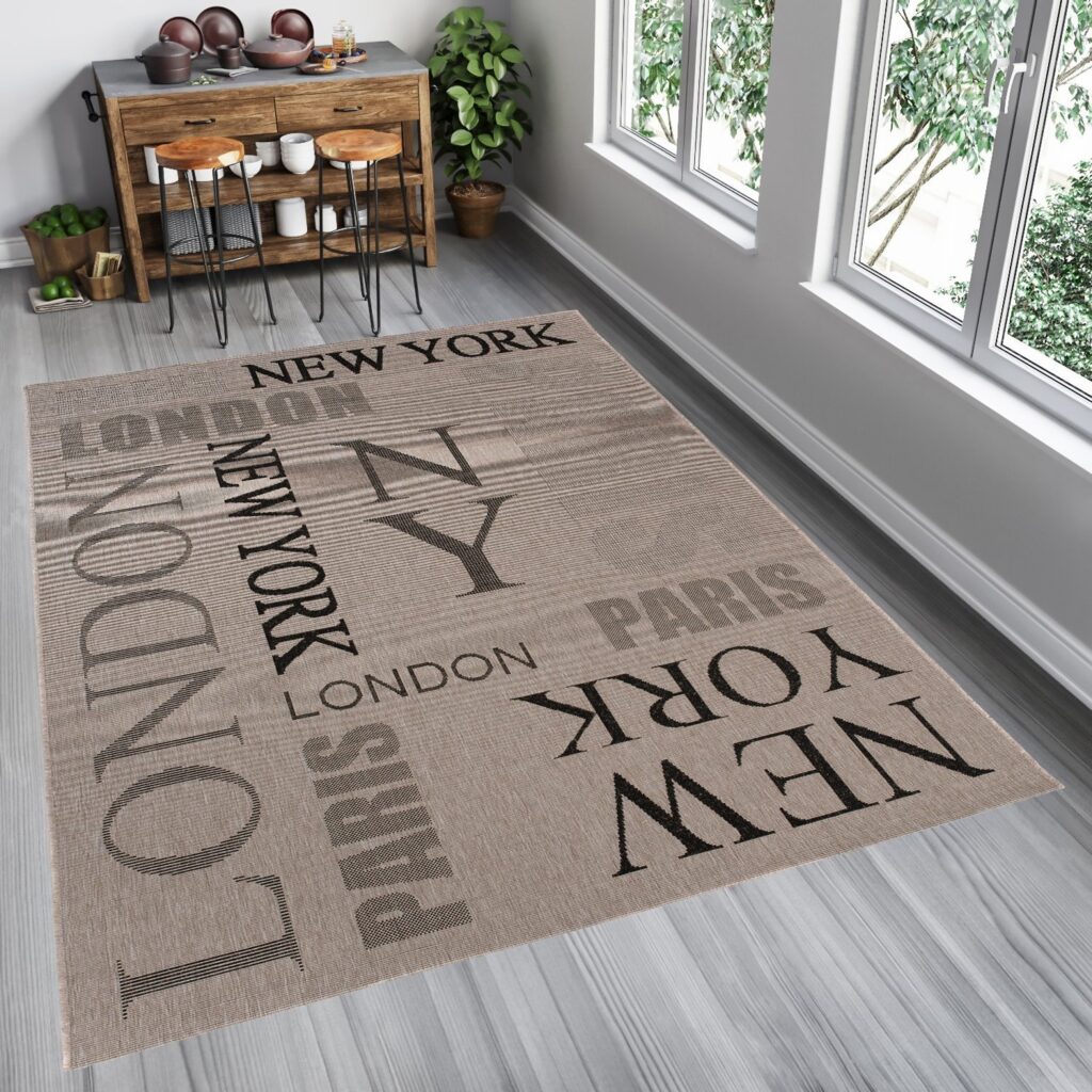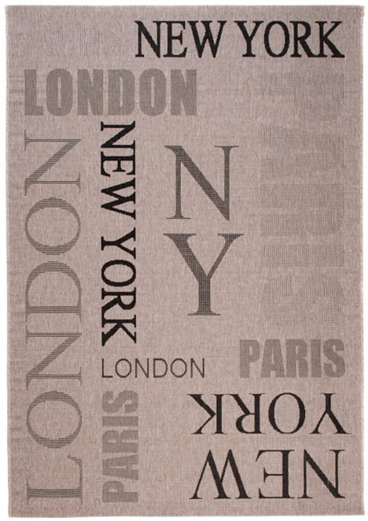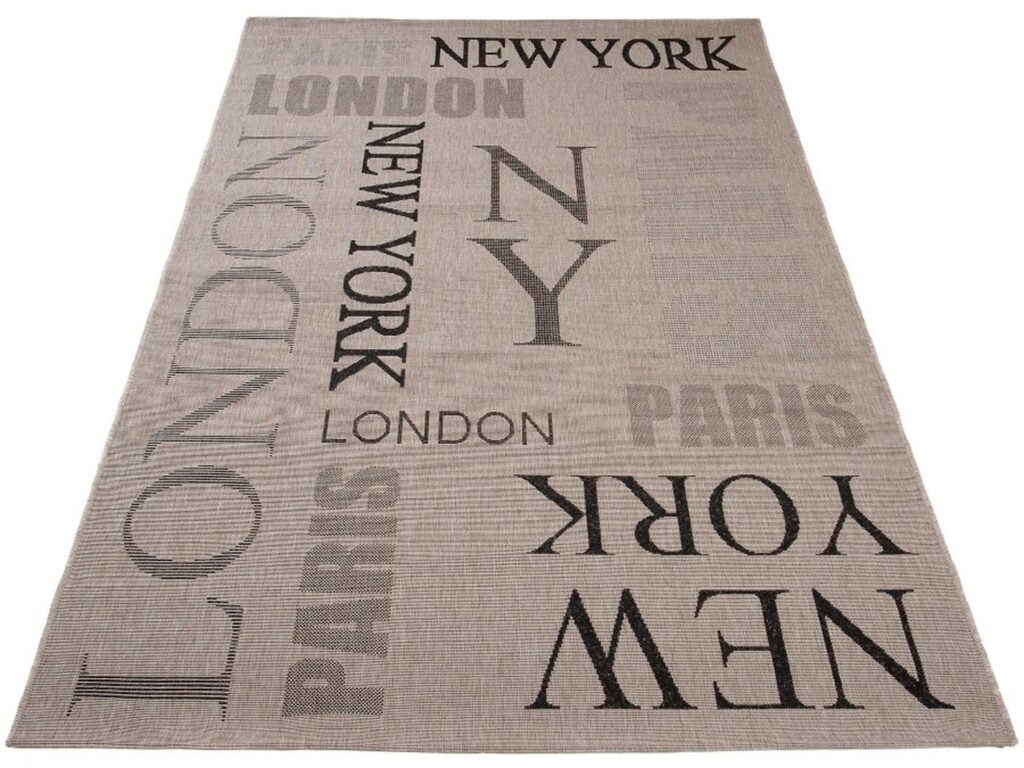 Dywan sznurkowy Sizal 00.224 silver black z kolekcji sznurkowy to prawdziwa perełka dla miłośników nowoczesnego designu i minimalistycznego stylu. Jego główny kolor to elegancki srebrny, który nadaje wnętrzu subtelnej klasy i harmonii. Dodatkowe akcenty w kolorze czerni dodają kontrastu i wyrazistości, sprawiając, że dywan staje się centralnym punktem aranżacji. Wzór dywanu jest wyjątkowo interesujący – na jego powierzchni widnieją nazwy miast: Londyn, Nowy Jork, Paryż, które są rozmieszczone w sposób nieregularny, co dodaje mu dynamiki i nowoczesnego charakteru. Litery są duże, wyraźne i mają lekko cieniowany efekt, co sprawia, że dywan nie tylko zdobi, ale również intryguje.