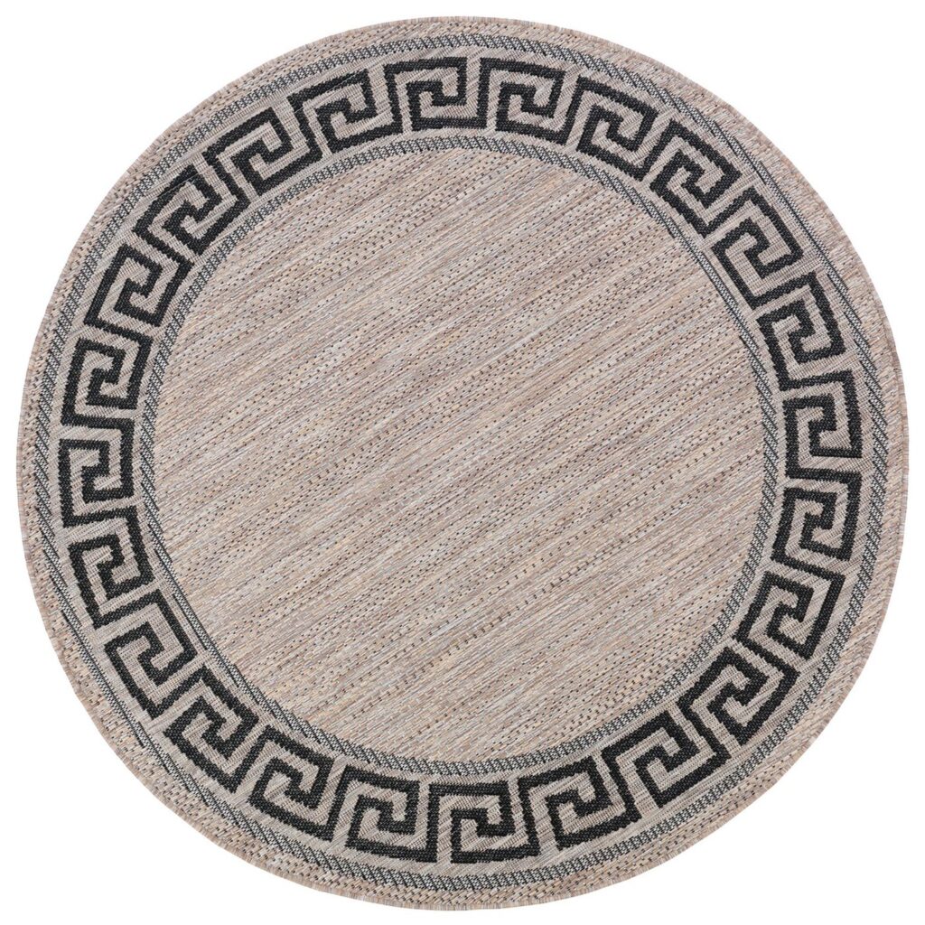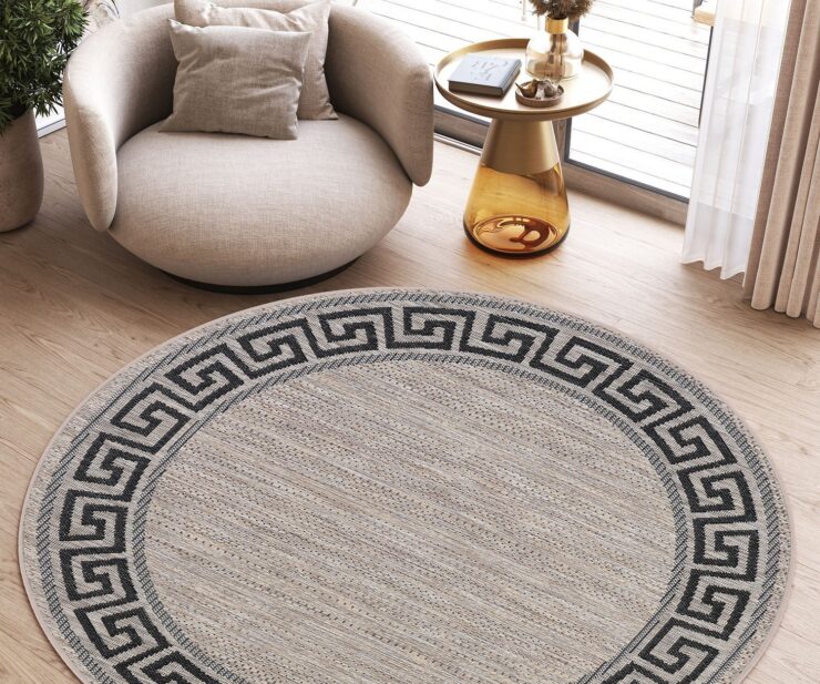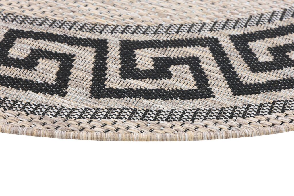 Dywan okrągły sznurkowy Meli 00.91 brown z kolekcji sznurkowy to prawdziwa perełka dla miłośników klasycznego designu z nutą nowoczesności. Jego głównym kolorem jest brąz, który nadaje wnętrzu przytulności i ciepła. Brąz ten jest delikatny, niemal beżowy, co sprawia, że dywan jest bardzo uniwersalny i łatwo dopasowuje się do różnych stylów aranżacji. Dodatkowymi kolorami są czarny i szary, które pojawiają się we wzorze obramowania dywanu. Wzór ten to klasyczny meander, znany również jako grecki klucz, który dodaje dywanowi elegancji i ponadczasowego charakteru. Meander jest symetryczny i równomiernie rozłożony wokół całego obwodu dywanu, co tworzy harmonijną ramę dla centralnej części dywanu, która jest gładka i pozbawiona dodatkowych wzorów.