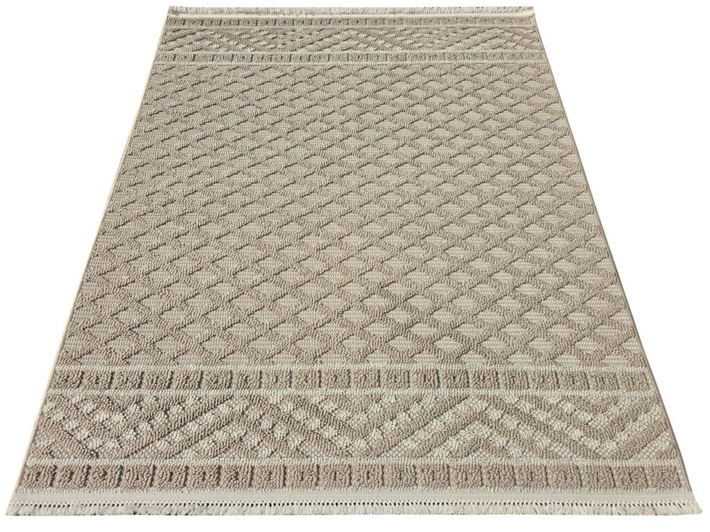 Piękno i uniwersalność spotykają się w dywan Milano 027 vizon beige, który zachwyca delikatnym beżowym odcieniem, idealnym dla miłośników subtelnej elegancji. Ten dywan prezentuje geometryczne wzory w formie romboidalnych kształtów, tworzących powtarzalną strukturę, która przechodzi od jaśniejszych tonów w centrum do ciemniejszych przy brzegach. Takie połączenie dodaje głębi i charakteru, a frędzle na krótszych bokach wprowadzają rustykalny akcent, nawiązujący do tradycyjnych perskich inspiracji. Jego prostokątny kształt sprawia, że łatwo go zaadaptować do różnych pomieszczeń, oferując ciepło i przytulność bez dominowania przestrzeni.