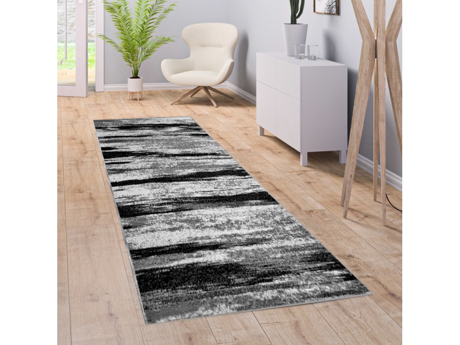 Dywan Chodnik PP new 014 gray z kolekcji PP to prawdziwa perełka dla miłośników nowoczesnego designu. Jego głównym kolorem jest szary, który nadaje wnętrzu subtelną elegancję i spokój. Szarość ta nie jest jednolita, lecz składa się z różnych odcieni, od jasnych, prawie białych, po ciemne, niemal czarne, co tworzy dynamiczny efekt wizualny. Wzór dywanu jest abstrakcyjny, przypominający smugi farby na płótnie, co dodaje mu artystycznego charakteru. Linie i plamy różnej grubości i intensywności koloru przeplatają się ze sobą, tworząc wrażenie ruchu i głębi. Dywan nie posiada frędzli, jego krawędzie są gładko wykończone, co dodaje mu nowoczesnego wyglądu. Kształt dywaniu jest prostokątny, co sprawia, że idealnie wpasuje się w różne przestrzenie, zarówno te minimalistyczne, jak i te bardziej eklektyczne.
