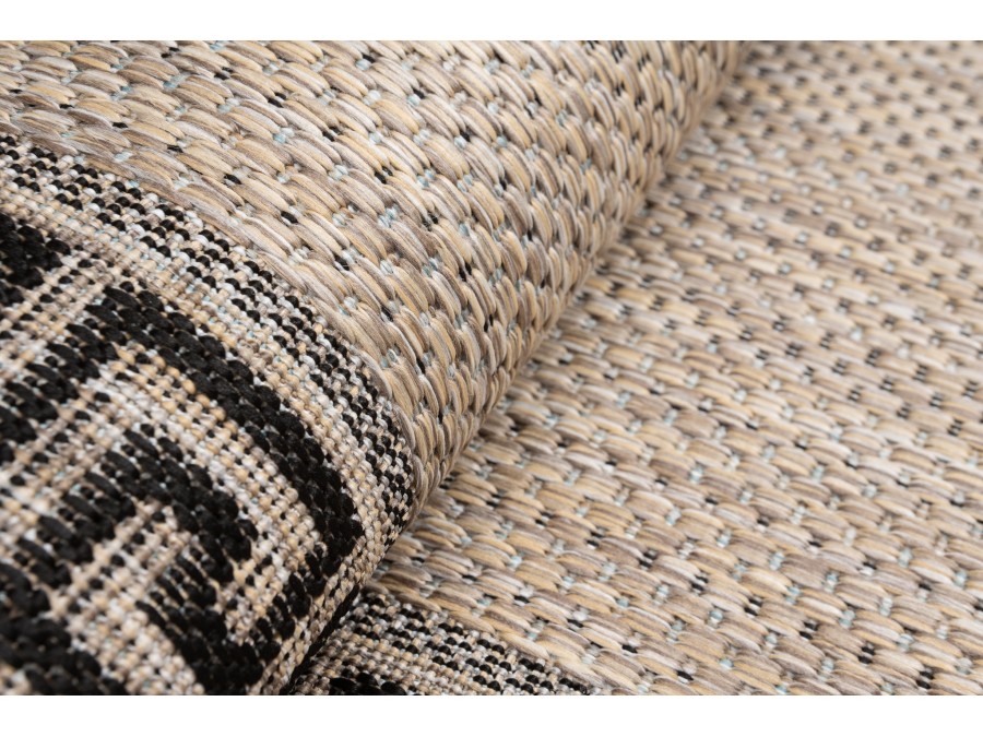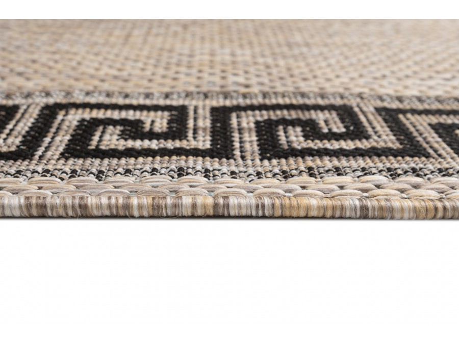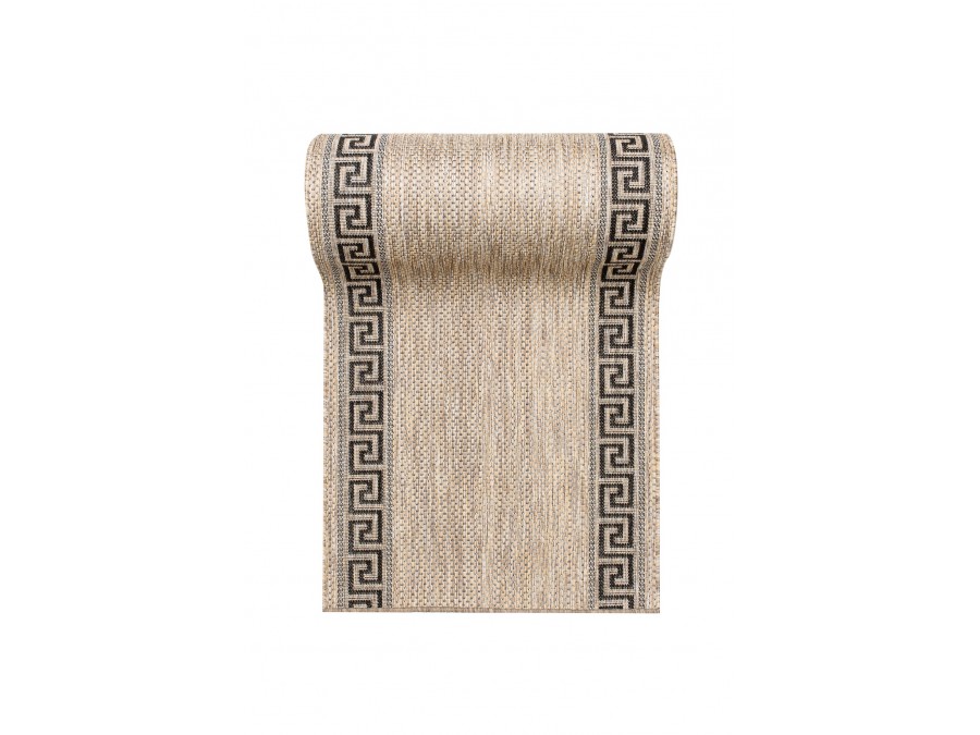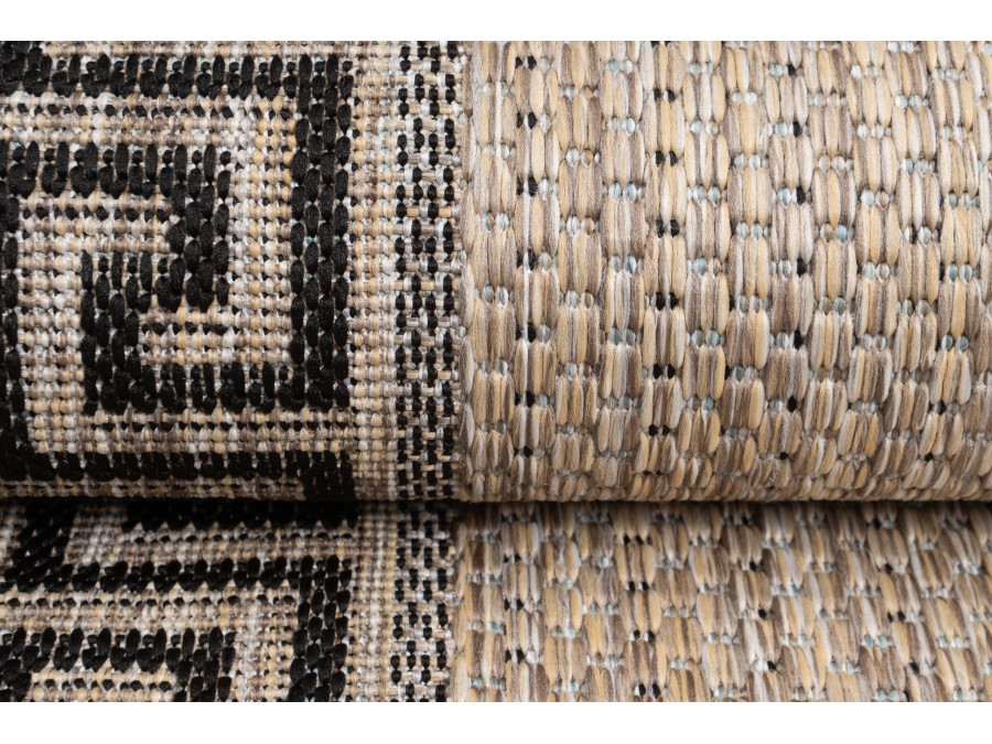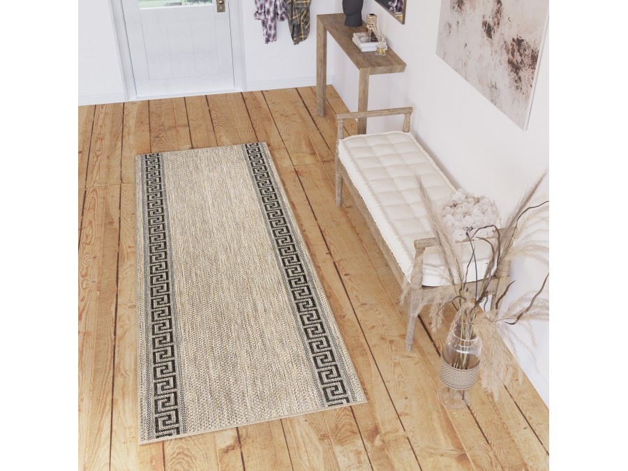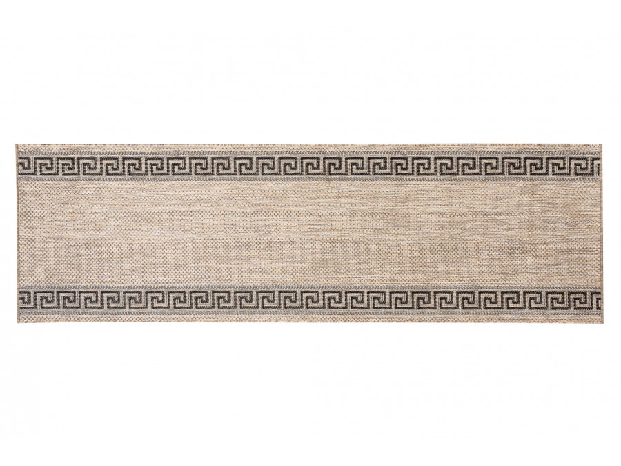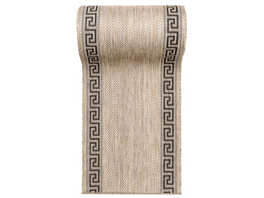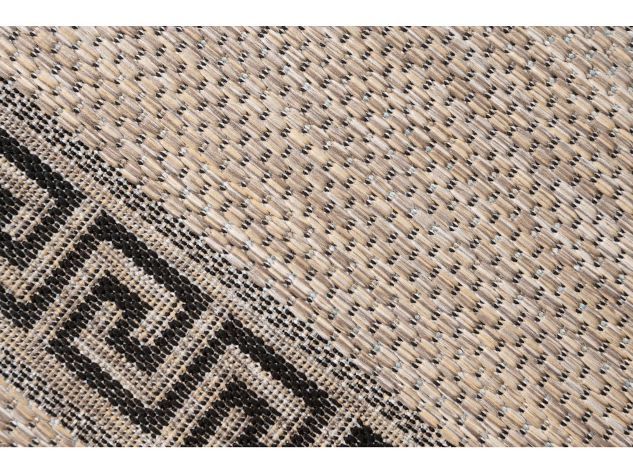 Dywan Chodnik sznurkowy Meli 00.91a brown z kolekcji sznurkowy to prawdziwa perełka dla miłośników klasycznego designu z nowoczesnym twistem. Jego głównym kolorem jest ciepły, naturalny brąz, który idealnie komponuje się z różnymi stylami wnętrzarskimi. Brąz ten jest stonowany, co sprawia, że dywan nie przytłacza przestrzeni, a jednocześnie dodaje jej przytulności. Na brzegach dywanu znajdują się charakterystyczne czarne pasy zgeometrycznym wzorem, przypominającym starożytne greckie meandry. Te czarne akcenty dodają dywanowi elegancji i wyrazistości, kontrastując z delikatnym beżem środkowej części.