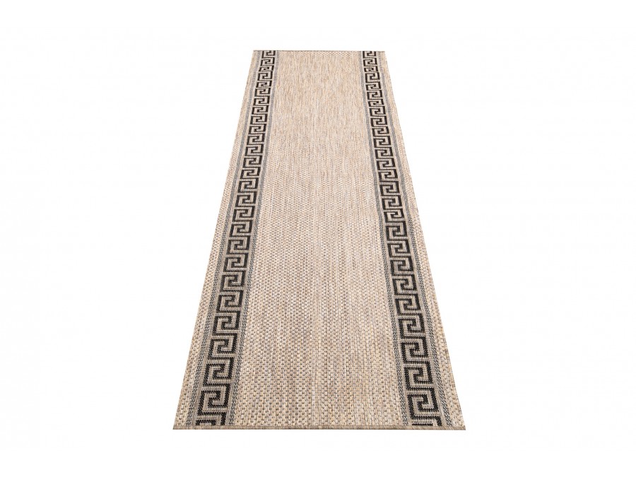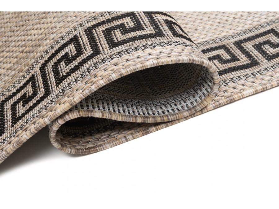 Wzór dywanu jest prosty, ale niezwykle efektowny. Środkowa część dywanu jest gładka, co daje wrażenie spokoju i harmonii, podczas gdy czarne pasy z meandrami po bokach wprowadzają dynamikę i klasyczną nutę. Kształt dywanu jest prostokątny, co sprawia, że idealnie nadaje się do wąskich przestrzeni, takich jak korytarze czy przedpokoje. Dywan nie posiada frędzli, co dodaje mu nowoczesnego charakteru, jednocześnie zachowując klasyczny urok.