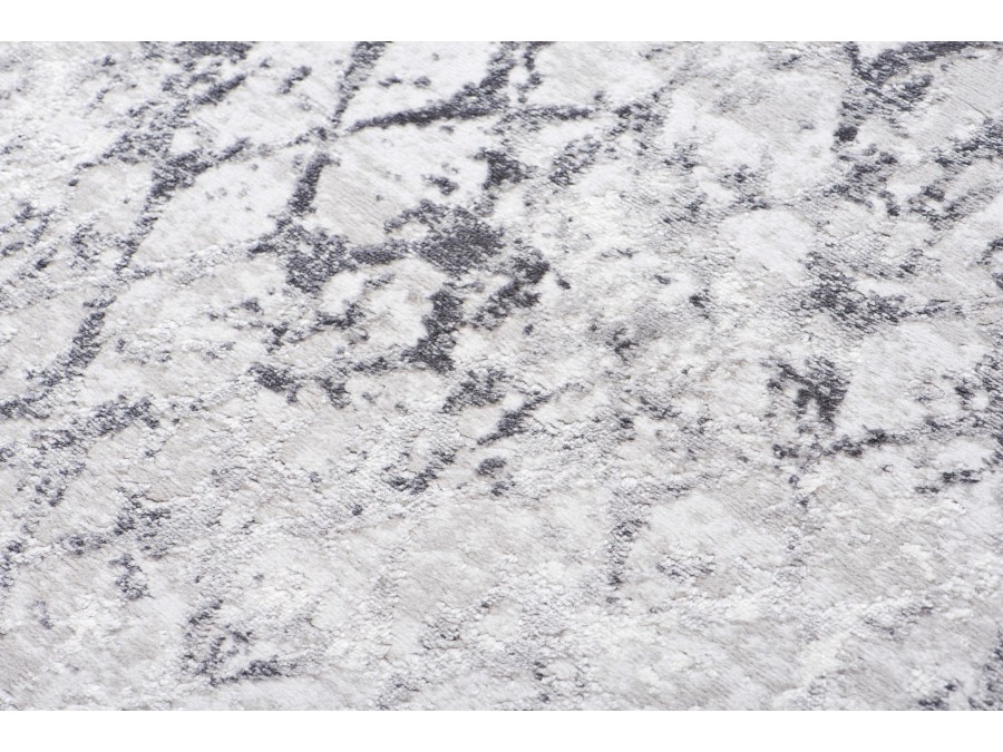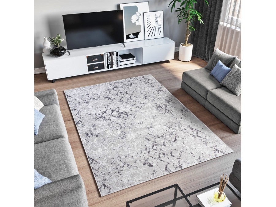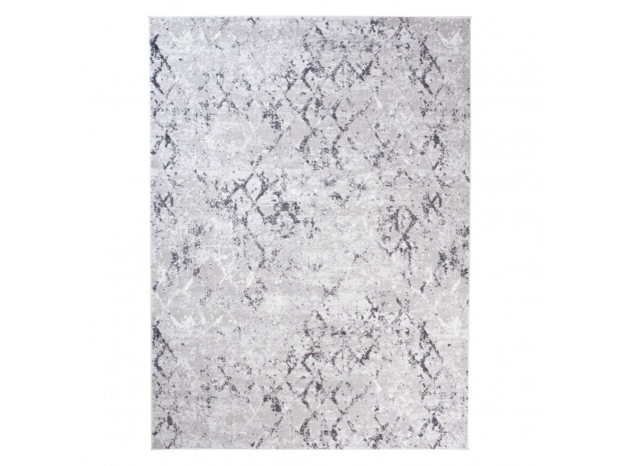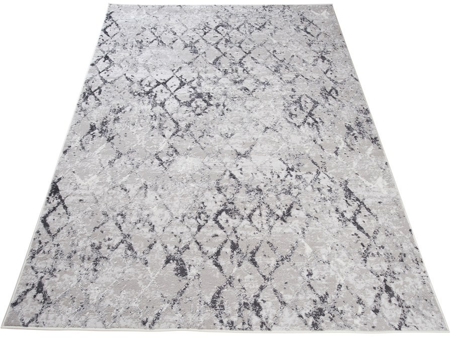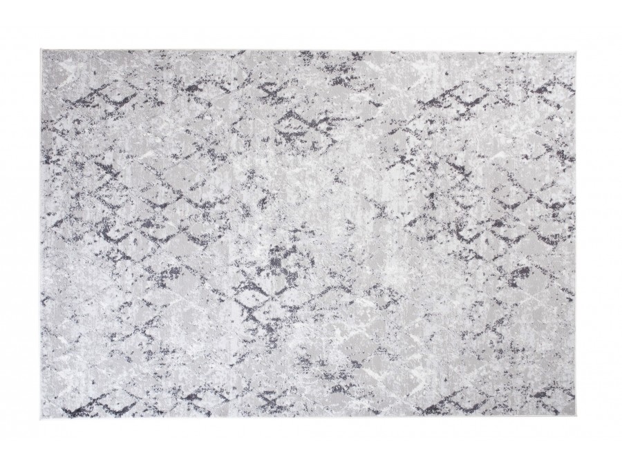 Wzór dywanu jest wyjątkowo interesujący i przyciąga wzrok. Składa się z geometrycznych kształtów, które przypominają delikatnie rozrzucone diamenty lub kamienie, tworząc efekt rozproszonego światła. Te wzory są rozmieszczone w sposób nieregularny, co dodaje dywanowi unikalności i artystycznego wyrazu. Kształt dywanu jest klasycznie prostokątny, co sprawia, że jest on uniwersalny i łatwy do dopasowania do różnych przestrzeni. Dywan nie posiada frędzli, co nadaje mu nowoczesny i minimalistyczny charakter.