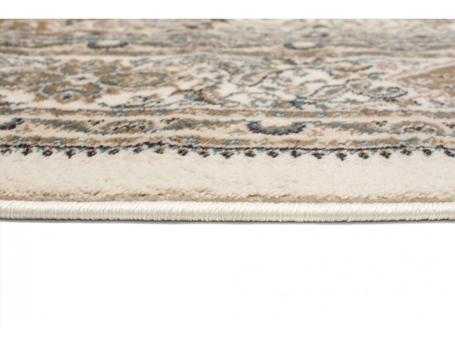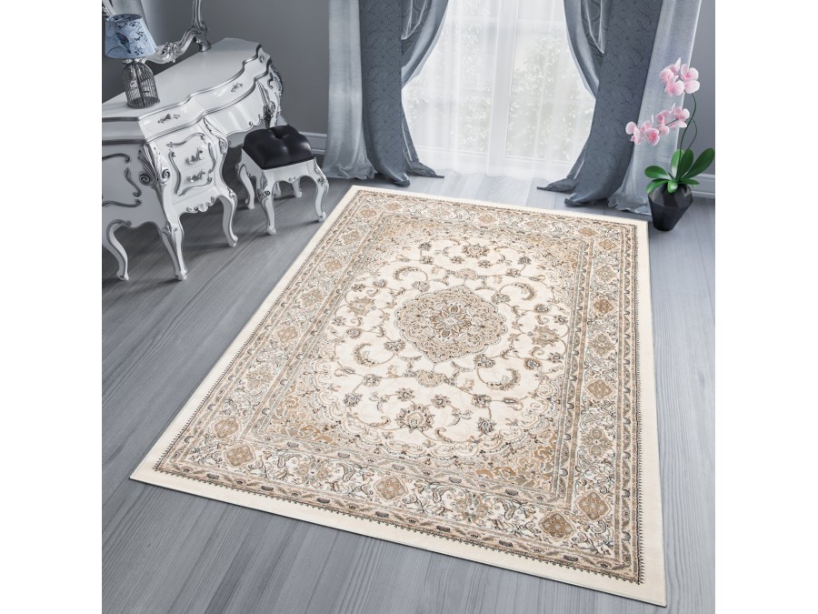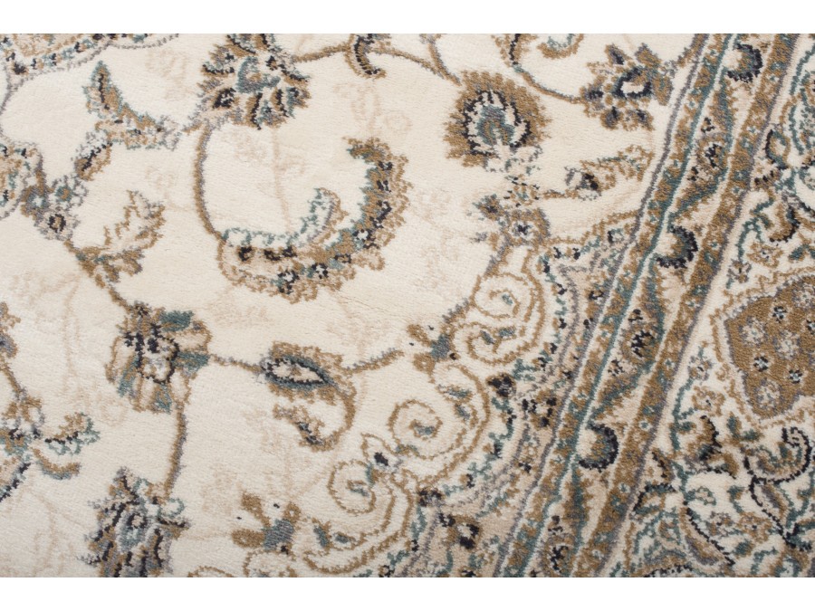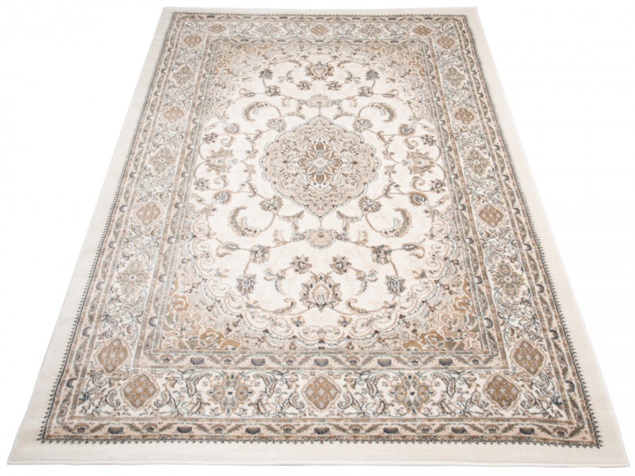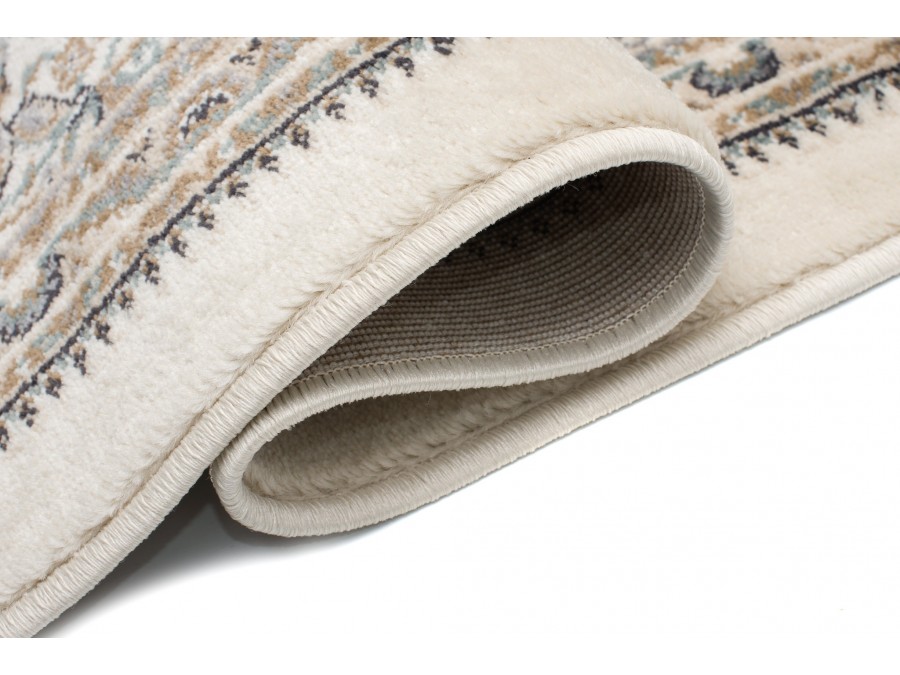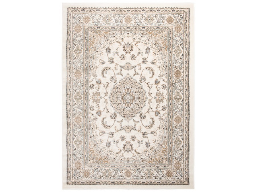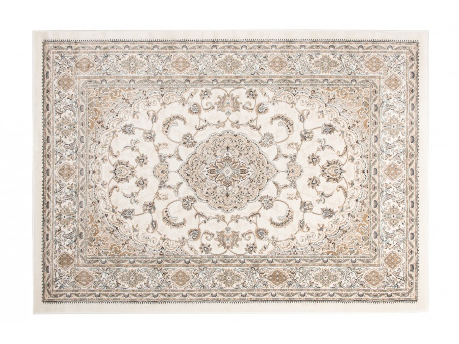 Dywan Dubaj 00.6956 white z kolekcji Dubaj to prawdziwa perełka dla miłośników klasycznego piękna i elegancji. Dominującym kolorem tego dywanu jest delikatna, kremowa biel, która nadaje wnętrzu subtelności i lekkości. Kolory dodatkowe, takie jak beż, złamana biel oraz subtelne odcienie brązu, tworzą harmonijną kompozycję, która nie przytłacza, a jednocześnie dodaje wnętrzu głębi. Wzór dywanu jest niezwykle bogaty i szczegółowy, inspirowany tradycyjnymi perskimi motywami. Centralnym punktem jest duży, misternie wykonany medalion, otoczony przez delikatne, kwiatowe ornamenty orazgeometryczne wzory. Całość jest obramowana bordiurą, która dodaje dywanowi wyrazistości i podkreśla jego kształt.