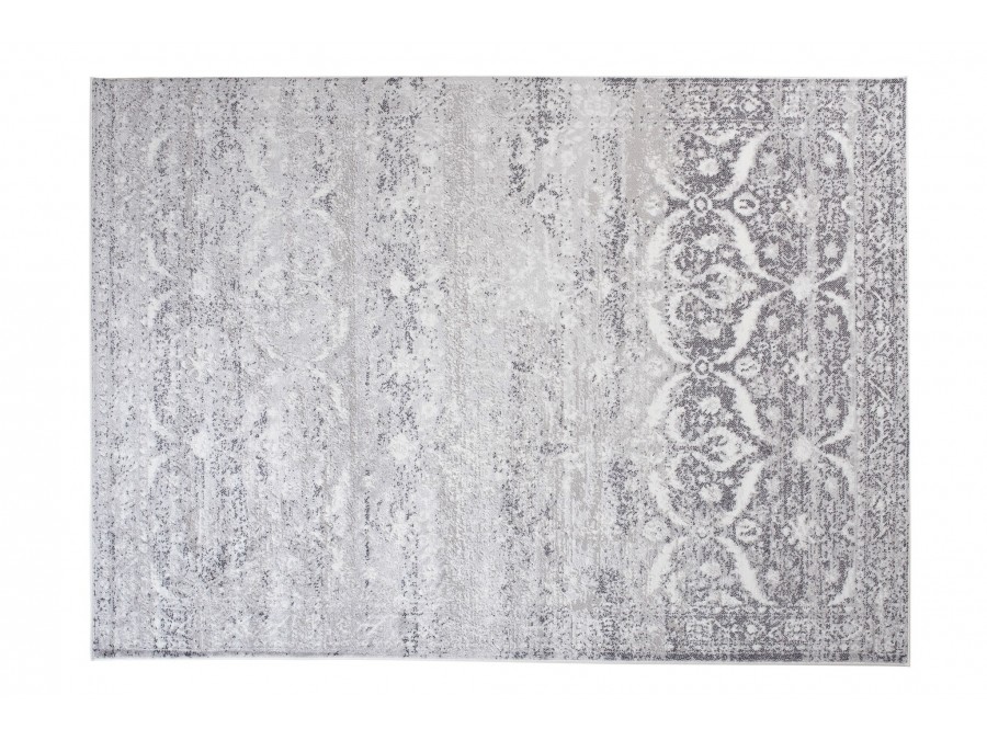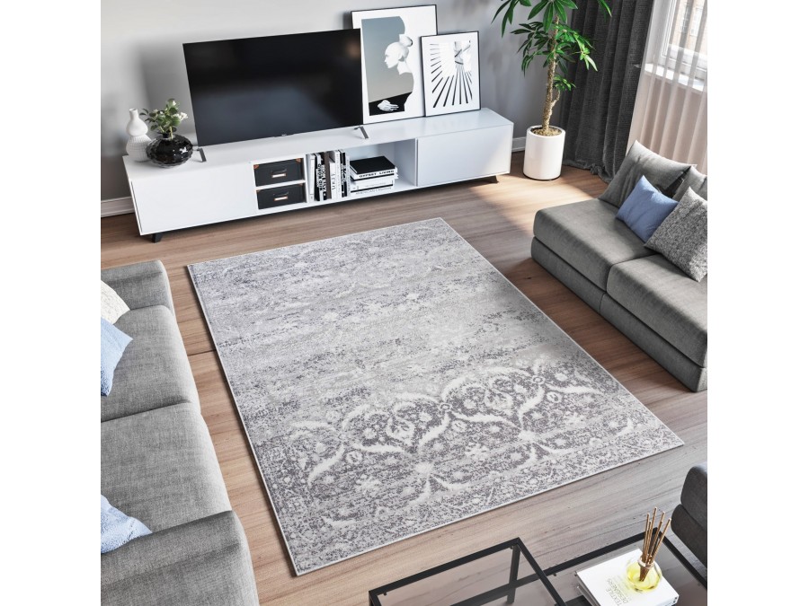 Dywan Senso 00449a l.gray z kolekcji Senso to prawdziwa perełka dla miłośników eleganckiego i subtelnego designu. Jego głównym kolorem jest jasny szary, który nadaje wnętrzu spokoju i harmonii. Kolory dodatkowe, takie jak ciemny szary i biel, dodają dywanowi głębi i kontrastu, sprawiając, że wzór staje się bardziej wyrazisty. Wzór dywanu jest niezwykle bogaty i złożony, przypominając tradycyjne perskie motywy, jednak w nowoczesnym wydaniu. Centralną część dywanu zdobią duże, symetryczne ornamenty, które przypominają kwiatowe bukiety lub mandale, otoczone delikatnymi, koronkowymi wzorami. Te główne motywy są otoczone przez mniejsze, powtarzające się elementy, które tworzą wrażenie ruchu i dynamiki. Kształt dywanu jest klasycznie prostokątny, co sprawia, że łatwo wkomponuje się w różne przestrzenie, zarówno te minimalistyczne, jak i te bardziej zdobione.