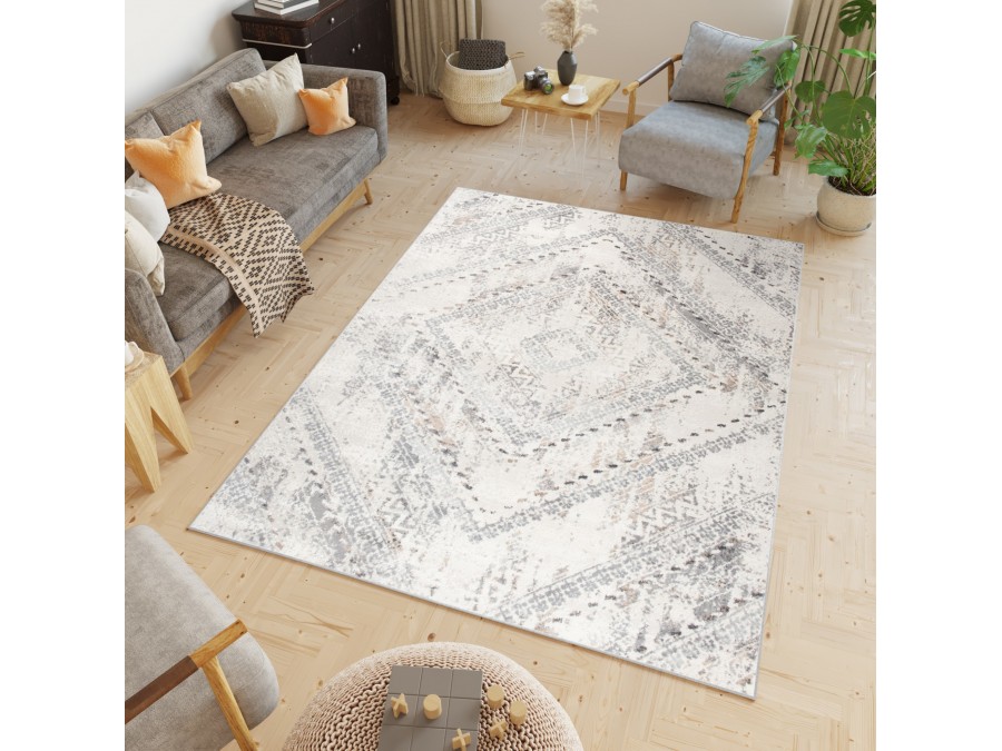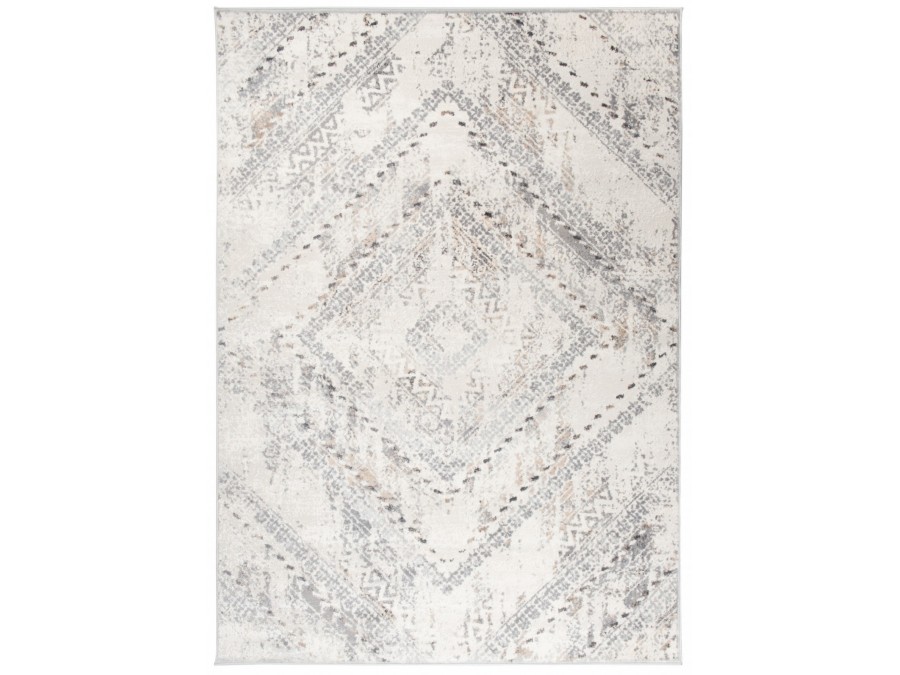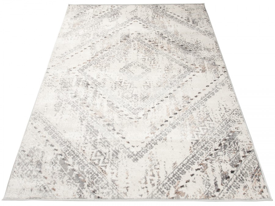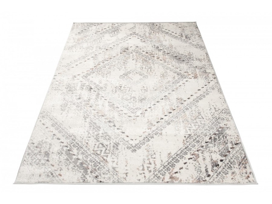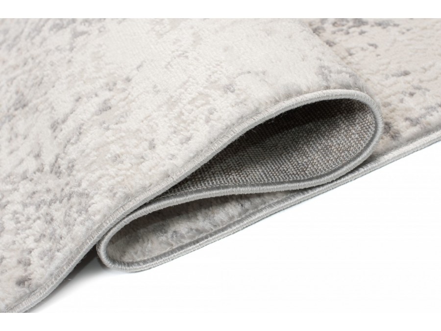 Dywan Villson 00.176d light gray z kolekcji Villson to prawdziwa perełka dla miłośników subtelnych i eleganckich wnętrz. Jego głównym kolorem jest jasny szary, który nadaje wnętrzu spokoju i harmonii. Kolor ten jest doskonale uzupełniony przez ciemniejsze szare akcenty, które dodają dywanowi głębi i kontrastu. Wzór dywanu jest wyjątkowo intrygujący - centralnie umieszczony geometryczny motyw przypomina diament, który rozszerza się ku brzegom dywanu. Wewnątrz tego diamentu znajdują się delikatne, abstrakcyjne kształty, które mogą przywodzić na myśl starożytne wzory lub mapy gwiazdozbiorów. Brzegi dywanu zdobią linie i kształty przypominające fale lub liście, co dodaje całości dynamiki i ruchu. Dywan ma kształt prostokąta, co sprawia, że jest uniwersalny i łatwy do dopasowania do różnych przestrzeni. Nie posiada frędzli, co nadaje mu nowoczesny i minimalistyczny wygląd.