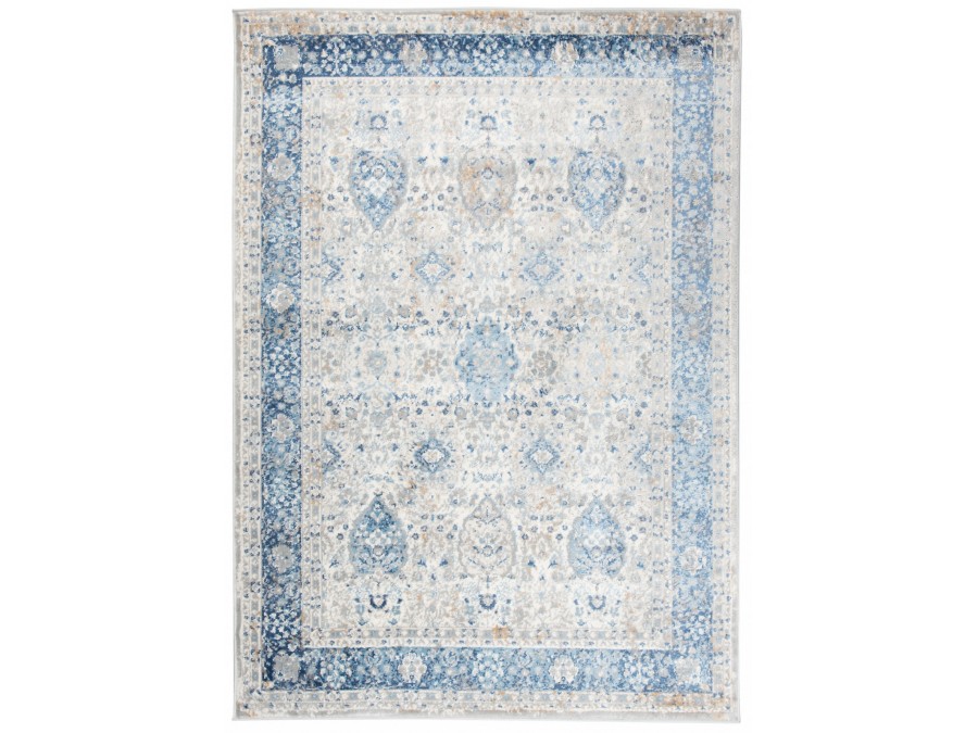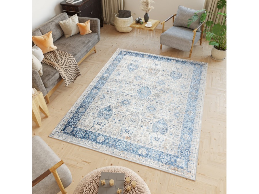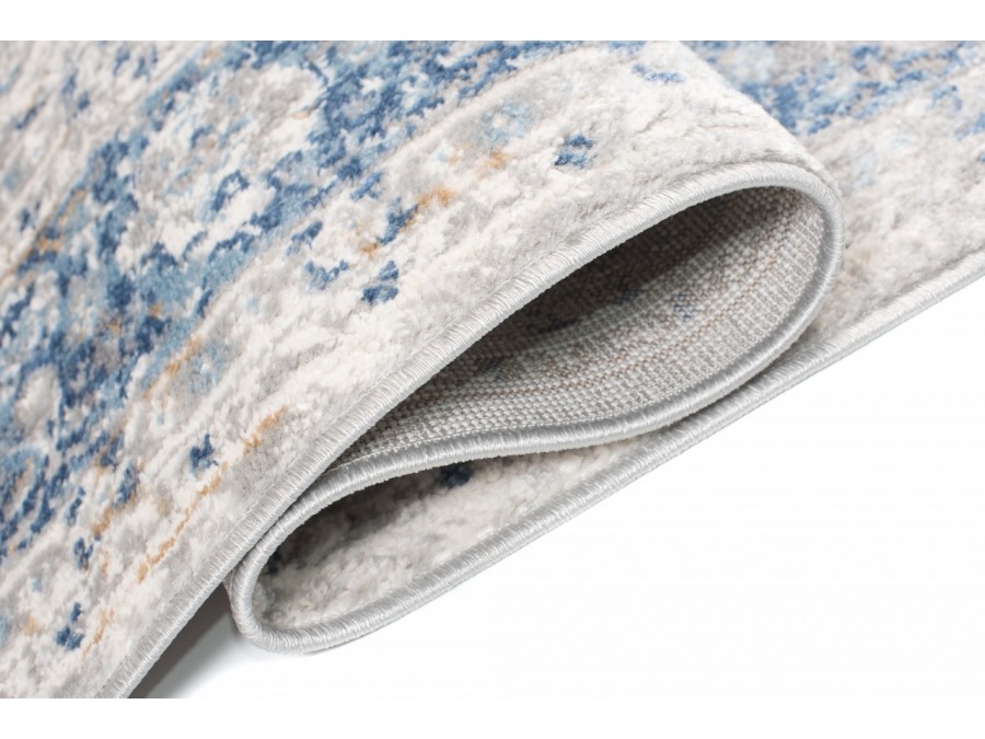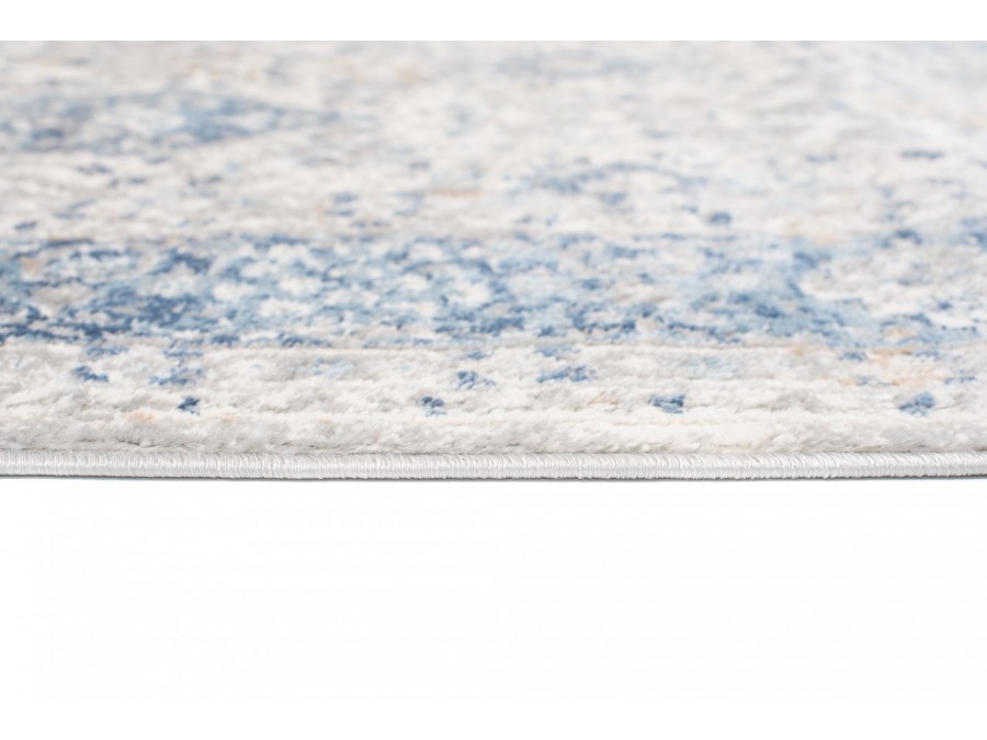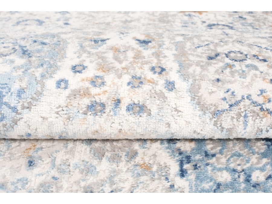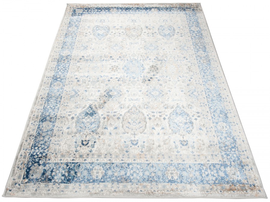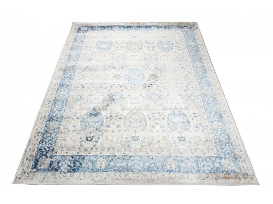 Dywan Villson 00.713b blue z kolekcji Villson to prawdziwa perełka dla miłośników eleganckiego i subtelnego designu. Dominującym kolorem tego dywanu jest delikatny, pastelowy błękit, który nadaje mu spokojny i harmonijny charakter. Kolor ten jest idealnie zbalansowany z dodatkowymi odcieniami bieli oraz różnymi tonacjami niebieskiego, które pojawiają się w subtelnych wzorach. Wzór dywanu jest niezwykle wysmakowany i klasyczny, składający się z dużych, okrągłych motywów kwiatowych, które są rozmieszczone równomiernie na całej powierzchni. Te motywy są otoczone delikatnymi, geometrycznymi ornamentami, które dodają dywanowi głębi i złożoności. Brzegi dywanu są obramowane grubszym pasem, który również jest zdobiony delikatnymi, niebieskimi wzorami, co dodaje całości eleganckiego wykończenia. Dywan ma kształt prostokąta, a jego rogi są delikatnie zaokrąglone, co dodaje mu miękkości. Nie posiada frędzli, co sprawia, że jego wygląd jest bardziej nowoczesny i minimalistyczny.