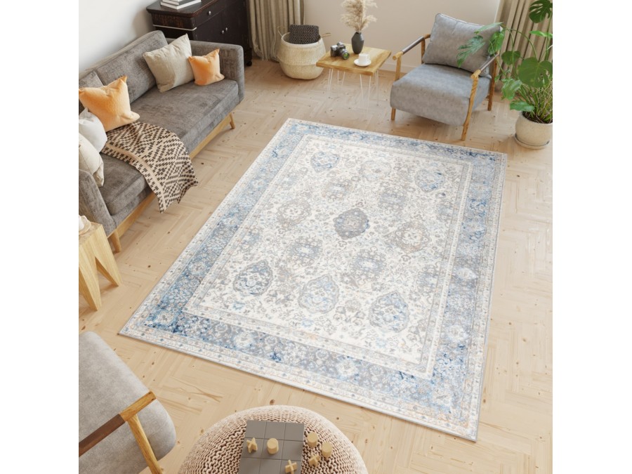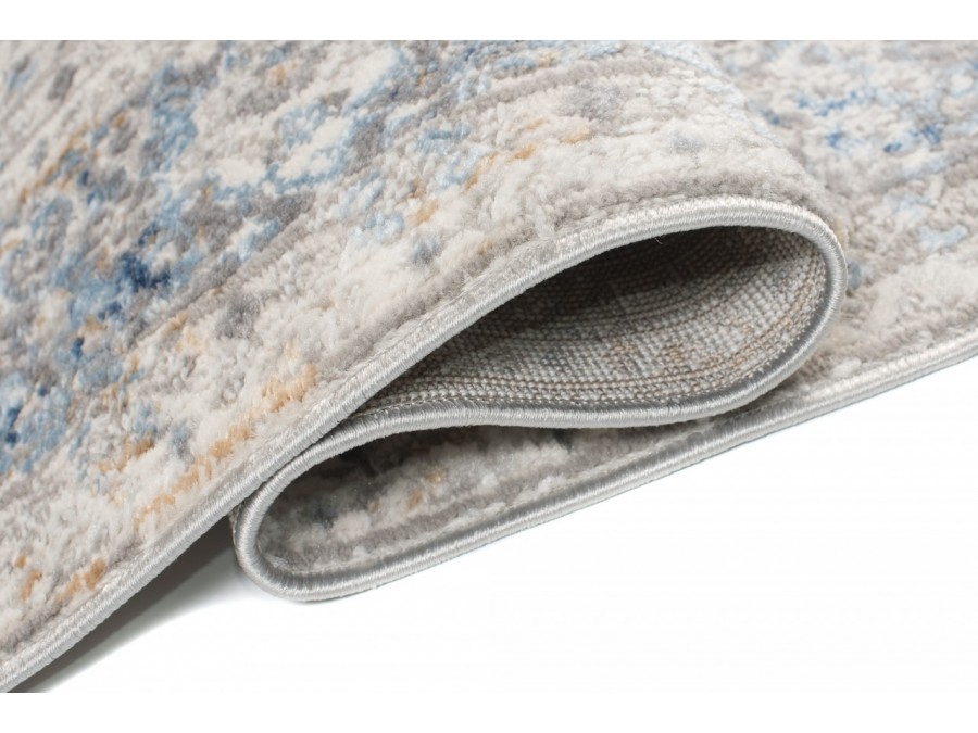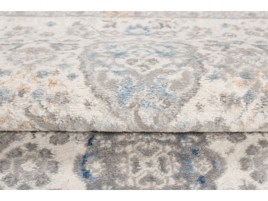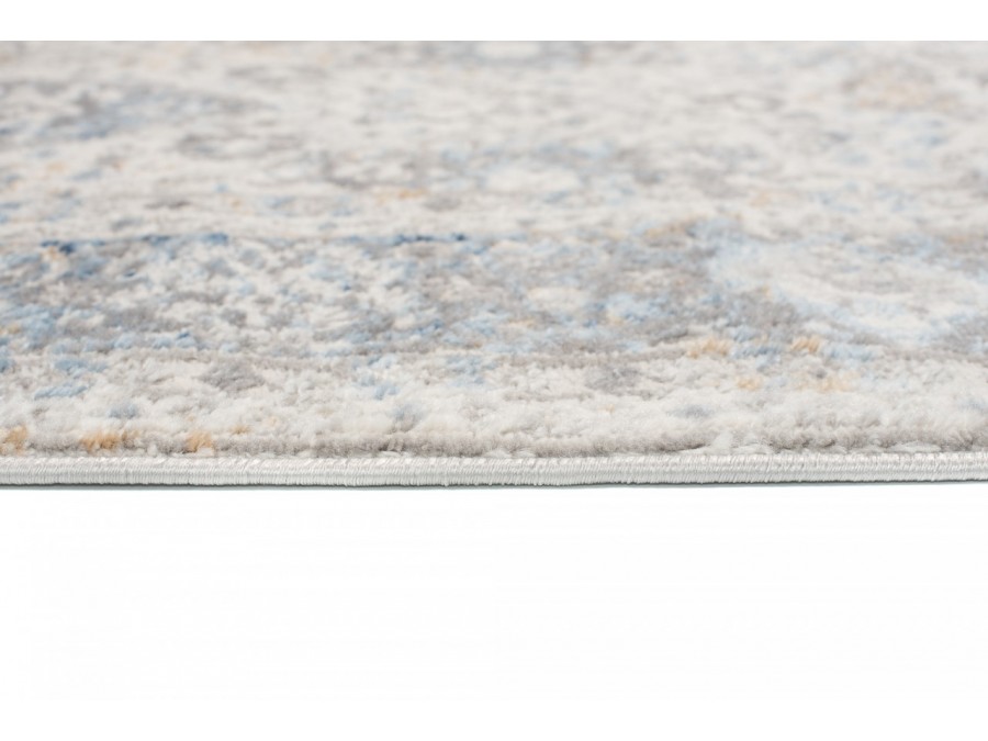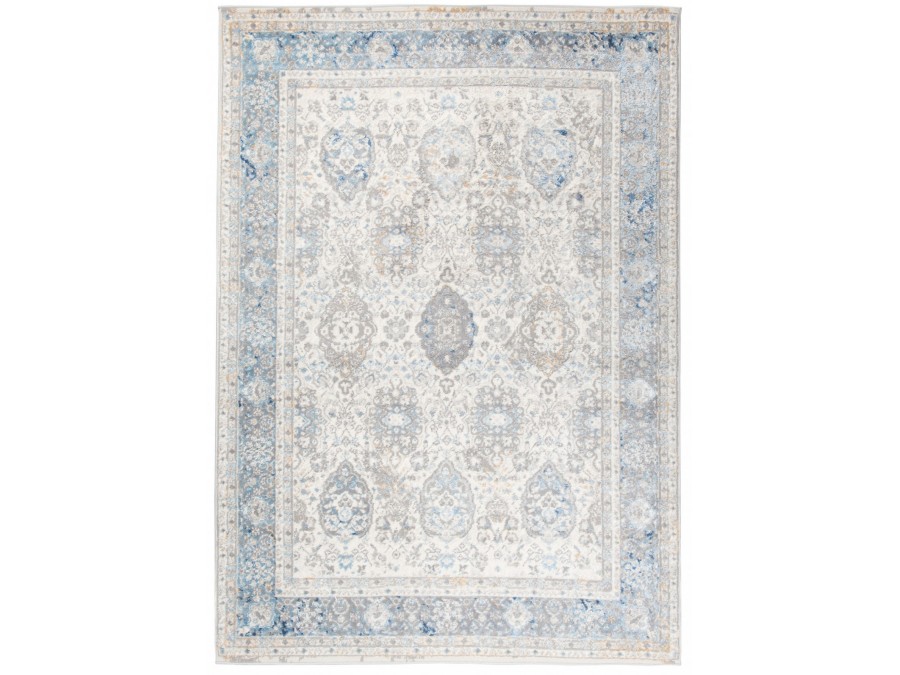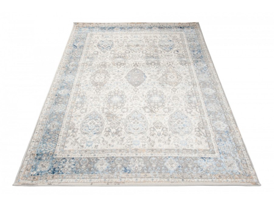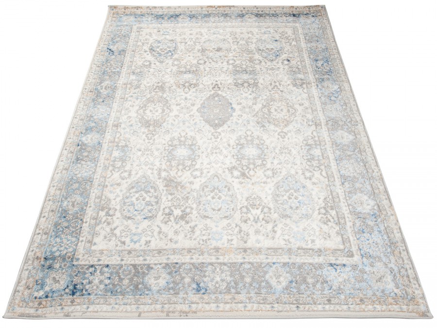 Dywan Villson 00.890b blue z kolekcji Villson to prawdziwa perełka dla miłośników klasycznego piękna połączonego z nowoczesnym designem. Dominującym kolorem tego dywanu jest delikatny, pastelowy niebieski, który nadaje wnętrzu spokoju i harmonii. Kolor ten jest subtelnie przełamany przez różne odcienie szarości, które dodają głębi i charakteru. Wzór dywanu jest niezwykle bogaty i złożony, inspirowany tradycyjnymi perskimi motywami, co sprawia, że dywan ten jest nie tylko funkcjonalnym elementem wnętrza, ale również dziełem sztuki. Centralnym punktem wzoru jest duży, romboidalny medalion, otoczony przez mniejsze, symetryczne ornamenty, które tworzą wrażenie ruchu i dynamiki. Brzegi dywanu zdobią delikatne, geometryczne wzory, które płynnie przechodzą w głębsze odcienie niebieskiego, tworząc piękną ramę dla centralnego motywu. Dywan ma kształt prostokąta, co czyni go idealnym do większości pomieszczeń, a jego brzegi są wykończone bez frędzli, co nadaje mu nowoczesny wygląd.