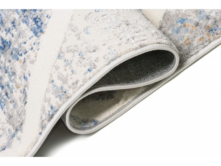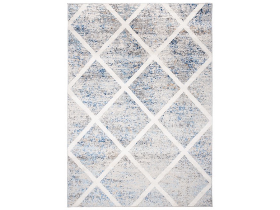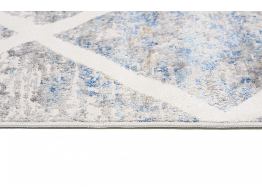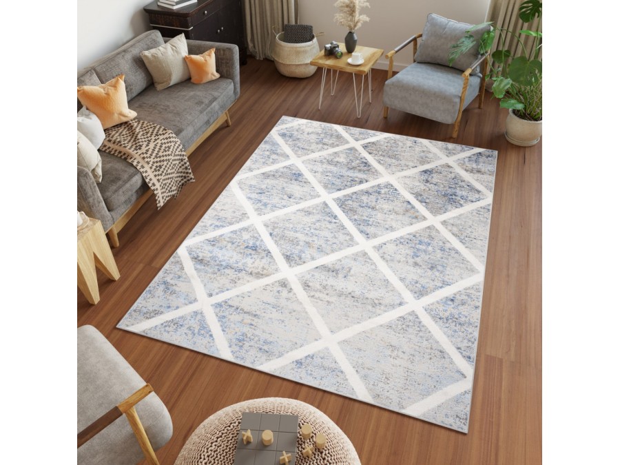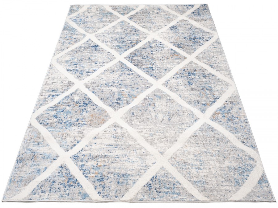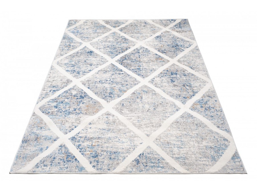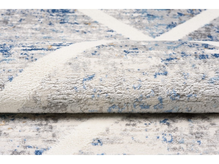 Dywan Villson 00.873e dark blue z kolekcji Villson to prawdziwa perełka dla miłośników eleganckich i subtelnych wnętrz. Dominującym kolorem tego dywanu jest ciemny błękit, który nadaje mu głębi i klasy. Kolor ten jest idealnie zrównoważony przez szarości oraz delikatne beżowe akcenty, które dodają całości harmonii i łagodności. Wzór dywanu jestgeometryczny, składający się z dużych, romboidalnych kształtów, które są obramowane białymi liniami. Te romby tworzą interesującą, powtarzalną strukturę, która przyciąga wzrok i dodaje wnętrzu dynamiki. Każdy romb ma nieco inny odcień, co sprawia, że dywan nie jest monotonny, a jego wygląd zmienia się w zależności od kąta padania światła. Dywan nie posiada frędzli, co nadaje mu nowoczesny i minimalistyczny wygląd.
