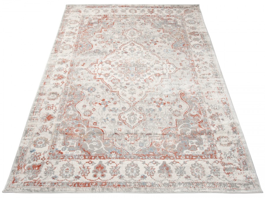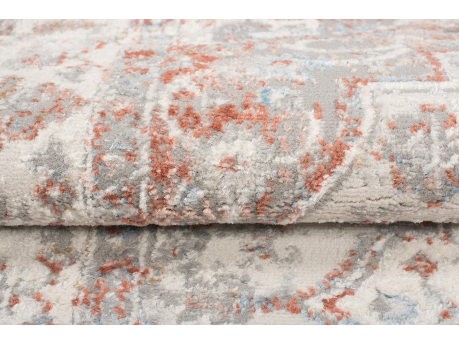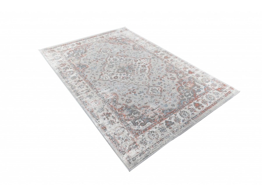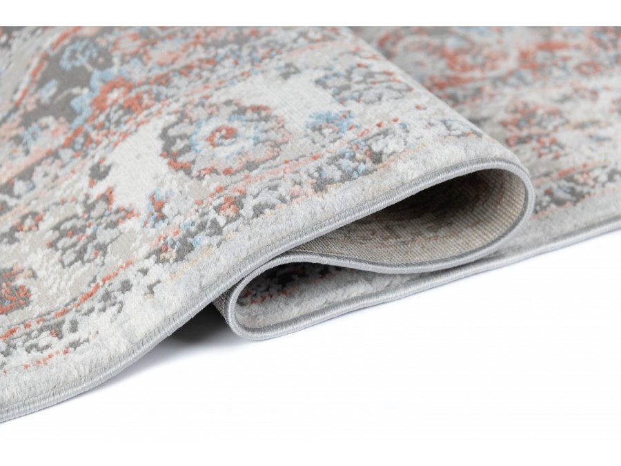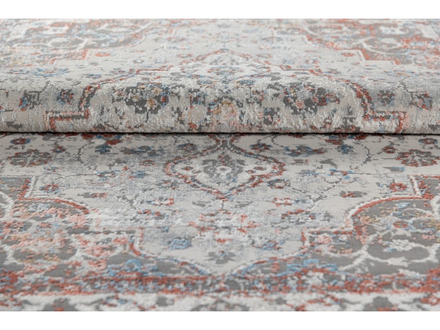 Dywan Villson 00.172c light gray z kolekcji Villson to prawdziwa perełka dla miłośników eleganckich i subtelnych wnętrz. Jego główny kolor to delikatny, jasnoszary, który nadaje dywanowi spokojny i harmonijny charakter. Kolory dodatkowe wprowadzają subtelne akcenty w postaci różnych odcieni beżu, kremu oraz delikatnych, przydymionych różów i brązów, które dodają dywanowi głębi i różnorodności. Wzór dywanu jest niezwykle bogaty i złożony, przypominając tradycyjne perskie dywany, jednak w nowoczesnym wydaniu. Centralnym motywem jest duży, symetryczny ornament w kształcie rozety, otoczony przez mniejsze, geometryczne wzory oraz kwiatowe motywy. Brzegi dywanu zdobią delikatne, powtarzające się wzory, które płynnie przechodzą w centralny motyw, tworząc spójną całość.