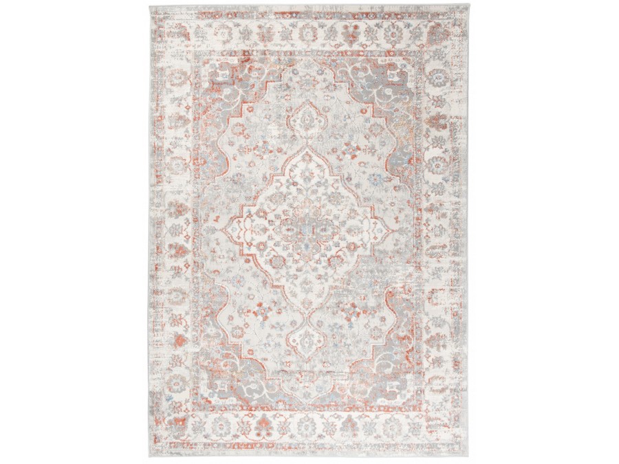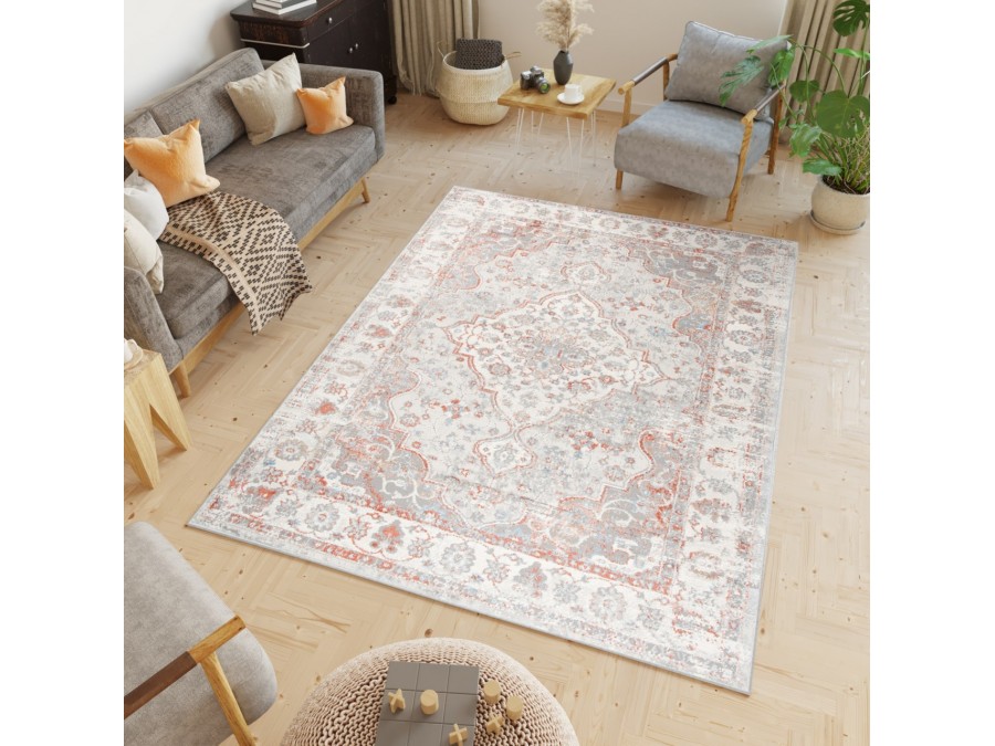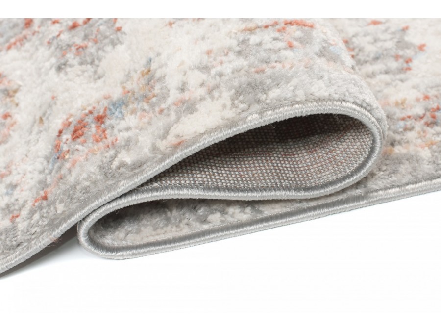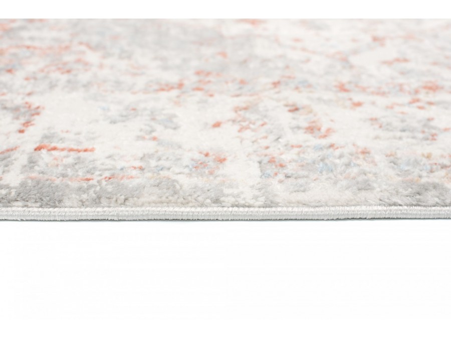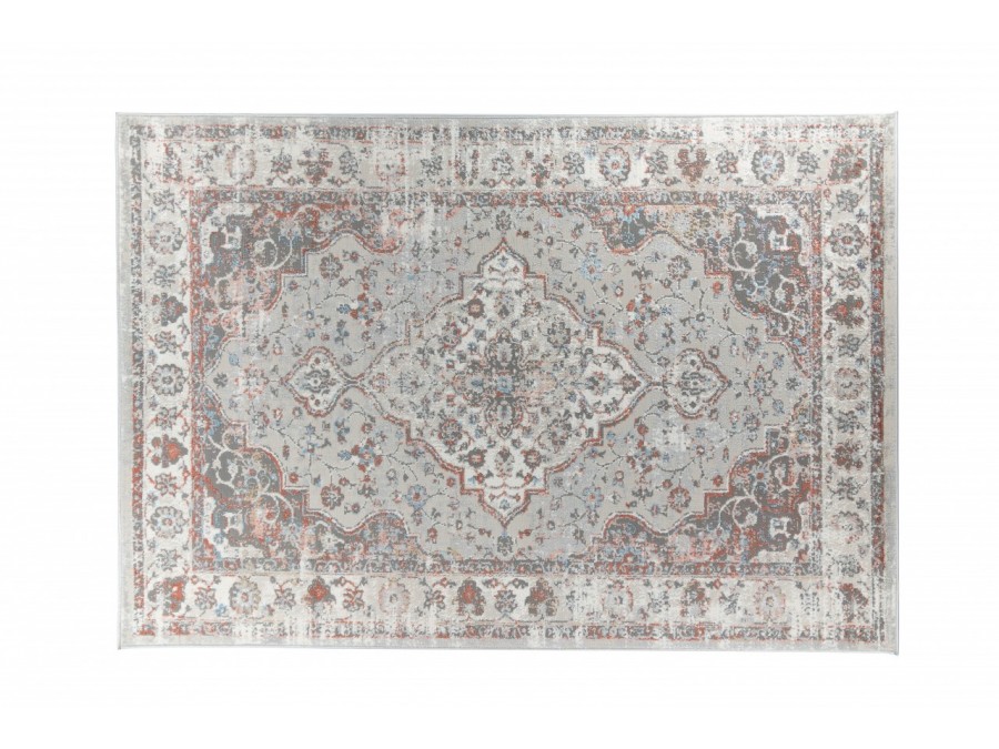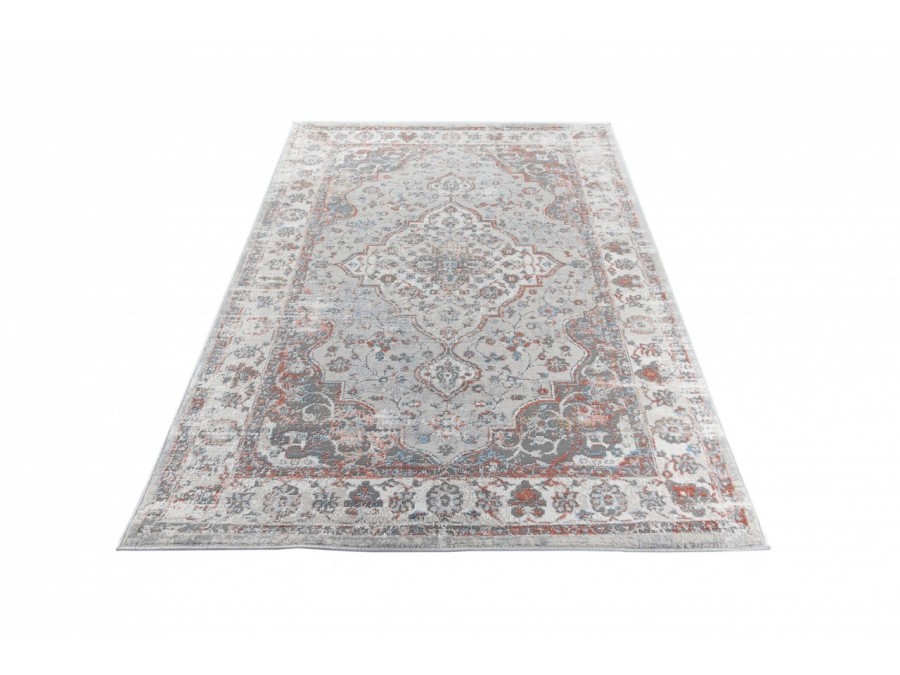 Dywan Villson 00.172c light gray z kolekcji Villson to prawdziwa perełka dla miłośników eleganckich i subtelnych wnętrz. Jego główny kolor to delikatny, jasnoszary, który nadaje dywanowi spokojny i harmonijny charakter. Kolory dodatkowe wprowadzają subtelne akcenty w postaci różnych odcieni beżu, kremu oraz delikatnych, przydymionych różów i brązów, które dodają dywanowi głębi i różnorodności. Wzór dywanu jest niezwykle bogaty i złożony, przypominając tradycyjne perskie dywany, jednak w nowoczesnym wydaniu. Centralnym motywem jest duży, symetryczny ornament w kształcie rozety, otoczony przez mniejsze, geometryczne wzory oraz kwiatowe motywy. Brzegi dywanu zdobią delikatne, powtarzające się wzory, które płynnie przechodzą w centralny motyw, tworząc spójną całość.