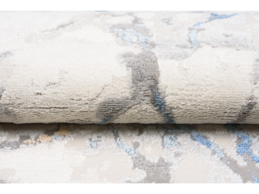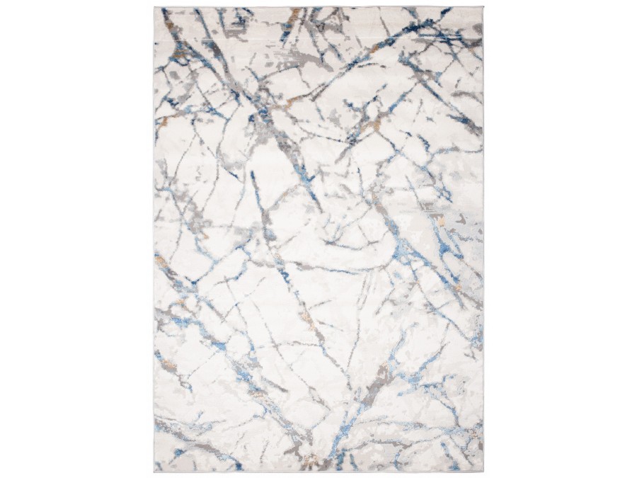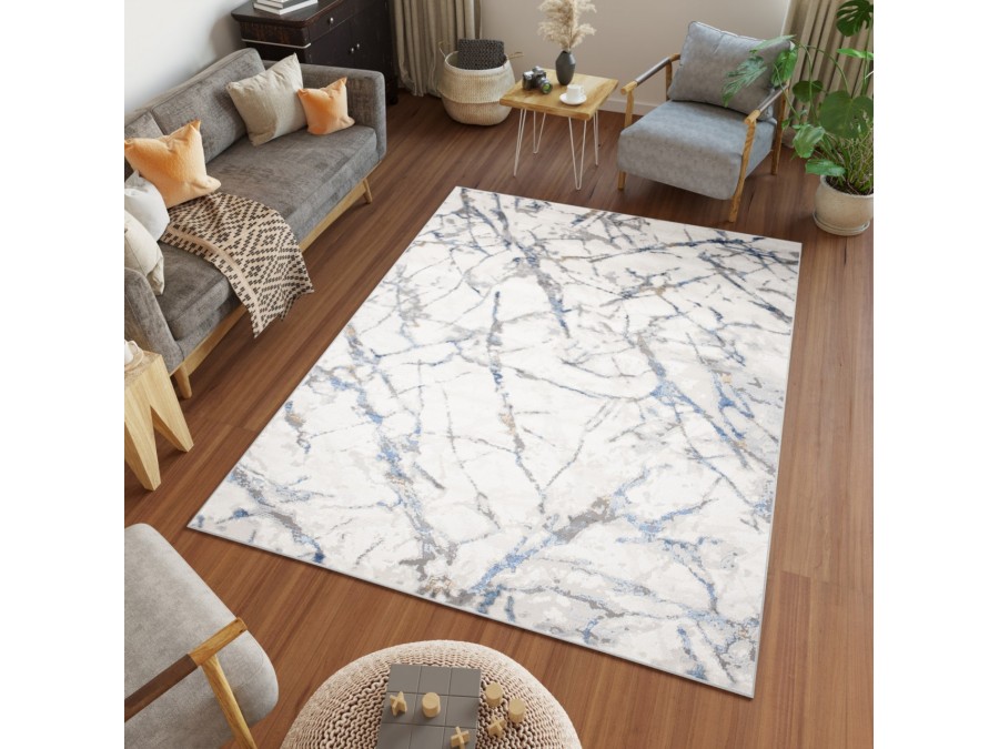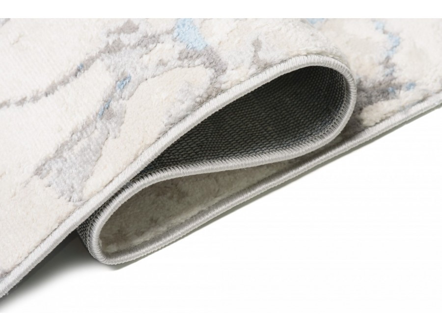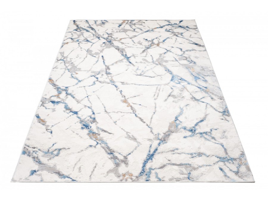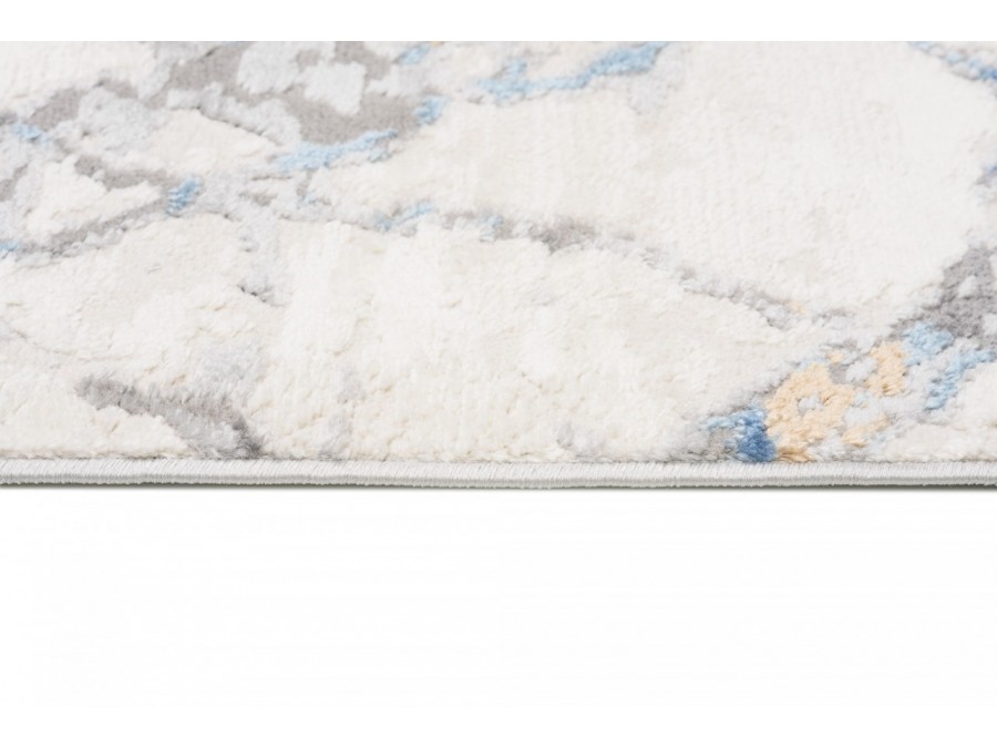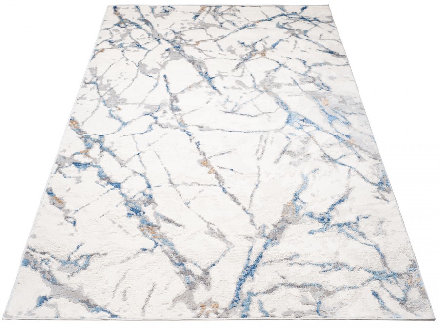 Dywan Villson 00.681b dark blue z kolekcji Villson to prawdziwa perełka dla miłośników eleganckiego i nowoczesnego designu. Jego głównym kolorem jest delikatny, niemalże kremowy odcień bieli, który tworzy tło dla dynamicznego wzoru. Wzór dywanu przypomina naturalne żyłki marmuru, co nadaje mu wyjątkowo luksusowy wygląd. Dodatkowe kolory, takie jak ciemny błękit, szary oraz subtelne beżowe i brązowe akcenty, dodają głębi i kontrastu, sprawiając, że dywan jest niezwykle interesujący wizualnie. Linie i plamy kolorów są rozrzucone w sposób, który przypomina naturalne formacje skalne, co czyni dywan nie tylko pięknym, ale i unikatowym elementem dekoracyjnym. Dywan ma kształt prostokąta, co sprawia, że idealnie wpasuje się w większość pomieszczeń, niezależnie od ich wielkości. Nie posiada frędzli, co dodaje mu nowoczesnego charakteru i ułatwia utrzymanie w czystości.