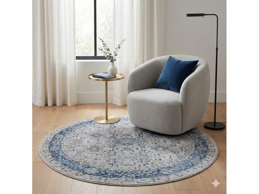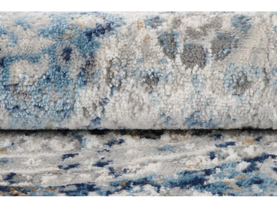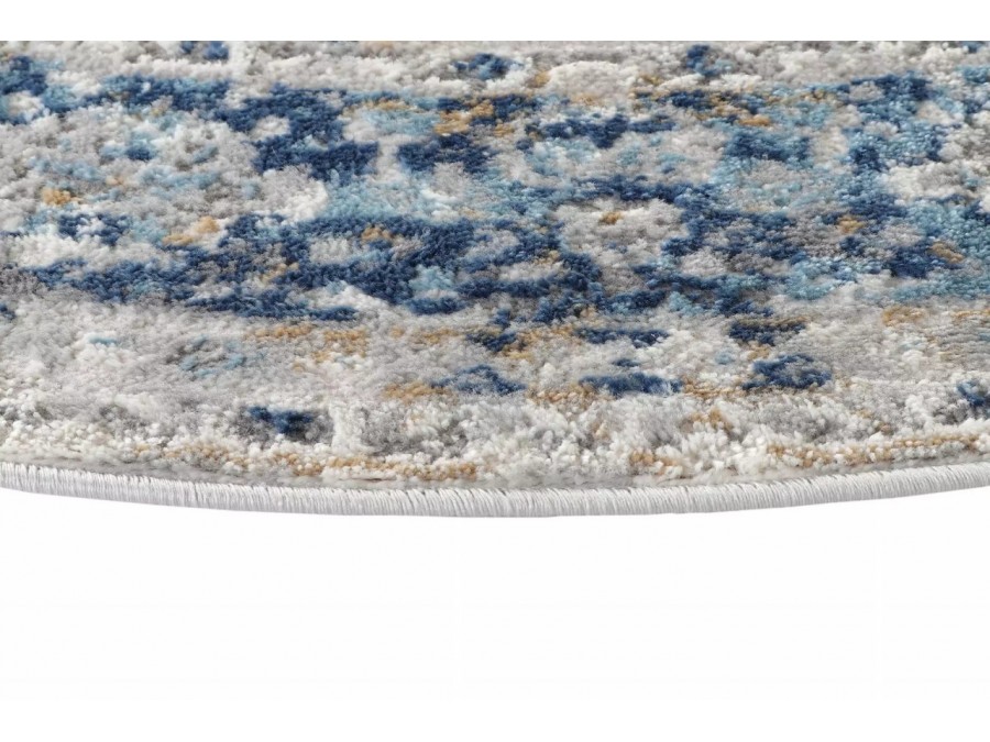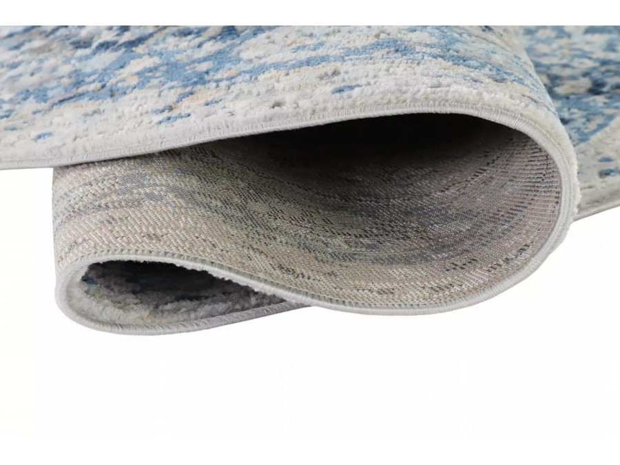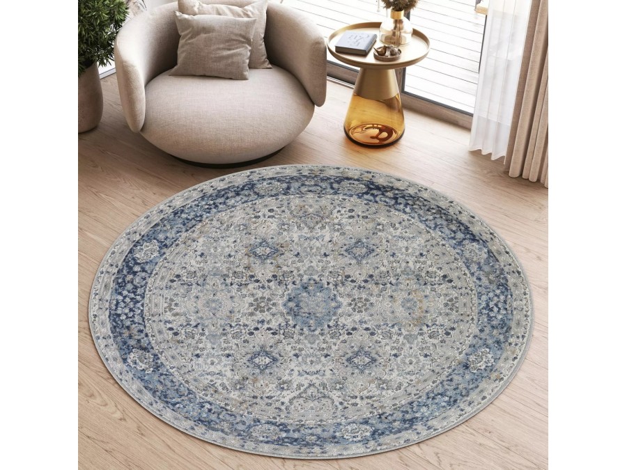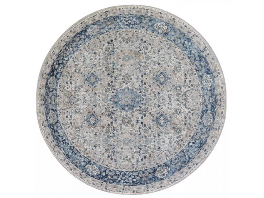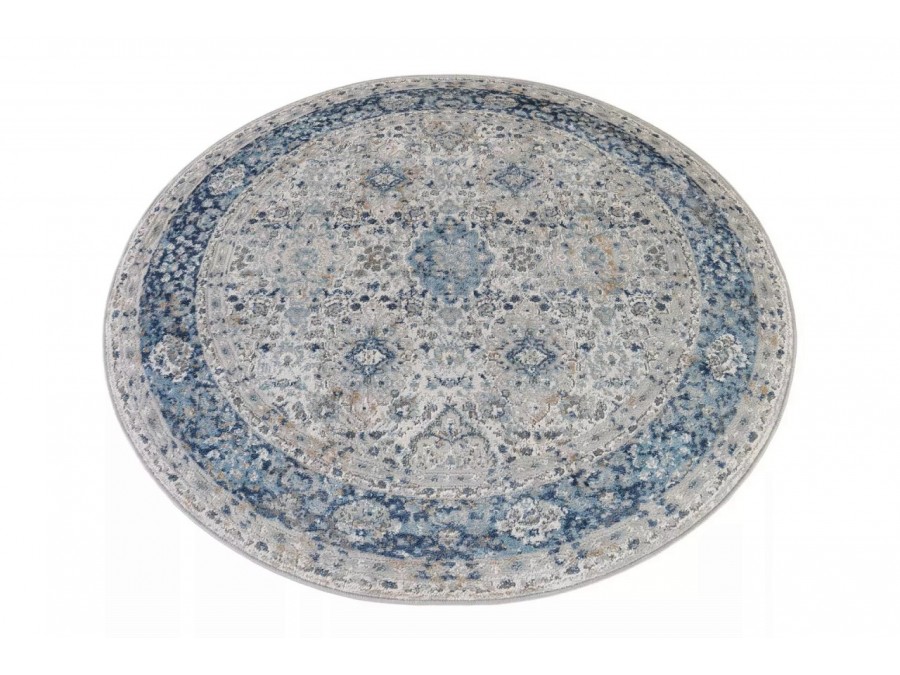 Dywan koło Villson 00.713b blue z kolekcji Villson to prawdziwe dzieło sztuki, które przyciąga wzrok swoją niezwykłą estetyką. Głównym kolorem tego dywanu jest delikatny, pastelowy błękit, który nadaje mu spokojnego i harmonijnego charakteru. Dodatkowe kolory to odcienie szarości, beżu oraz subtelne akcenty bieli, które tworzą razem harmonijną kompozycję. Wzór dywanu jest niezwykle bogaty i złożony, przypominający tradycyjne perskie motywy. Centralnym punktem jest duży, okrągły medalion, otoczony przez misterne, kwiatowe ornamenty oraz geometryczne kształty, które rozchodzą się promieniście na całą powierzchnię dywanu. Brzeg dywanu zdobi szeroki pas z delikatnym, roślinnym motywem, który płynnie przechodzi w ciemniejszy odcień błękitu, tworząc piękną ramę dla całości.