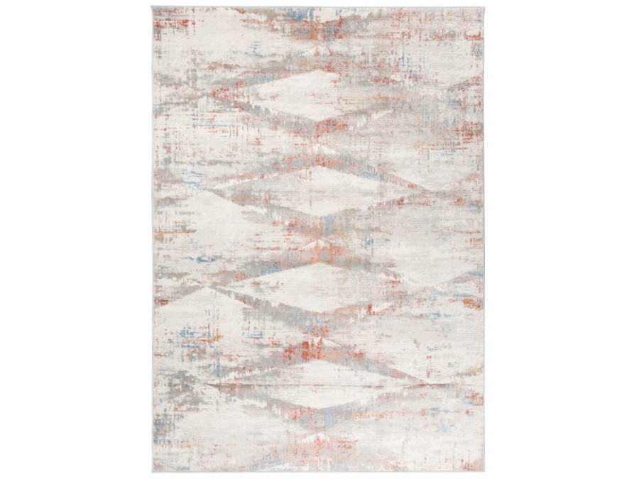Wzór dywanu jest niezwykle interesujący - składa się z geometrycznych kształtów, które przypominają romby lub trapezy, ułożone w sposób, który przywodzi na myśl abstrakcyjne malarstwo. Każdy z tych kształtów jest wypełniony delikatnymi przejściami kolorów, co sprawia, że dywan wygląda jak dzieło sztuki. Kształt dywanu jest klasyczny, prostokątny, co czyni go uniwersalnym dodatkiem do różnych pomieszczeń. Nie posiada frędzli, co dodaje mu nowoczesnego charakteru, a jednocześnie sprawia, że jest łatwiejszy w utrzymaniu.