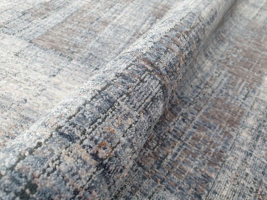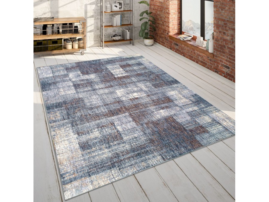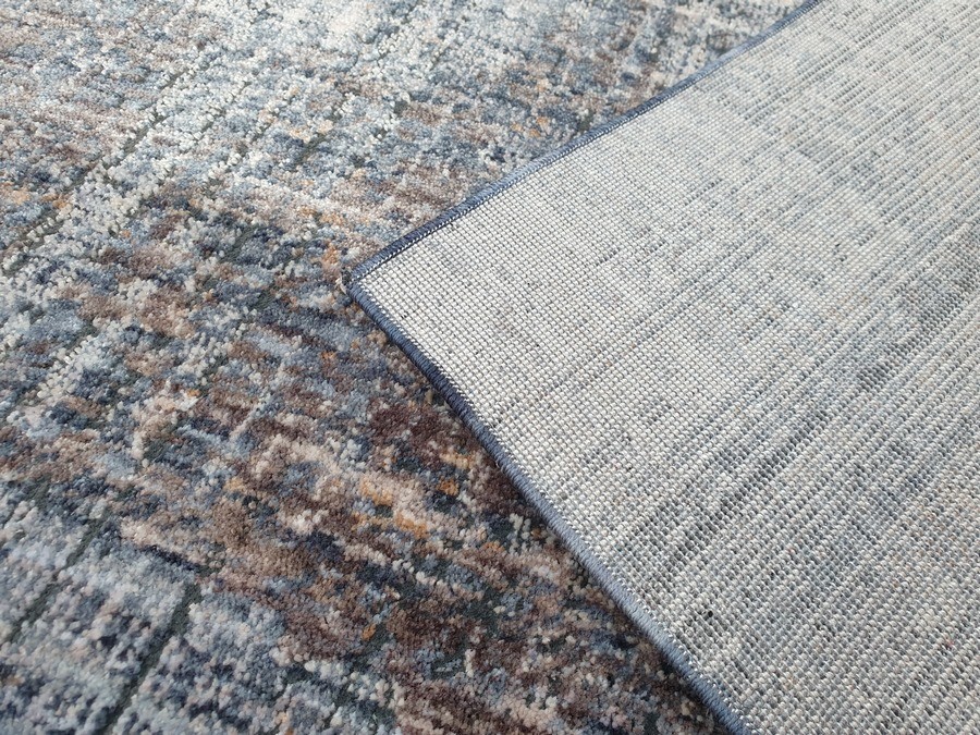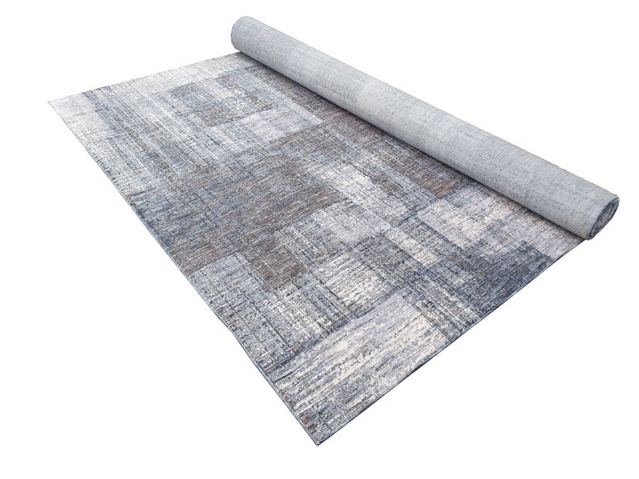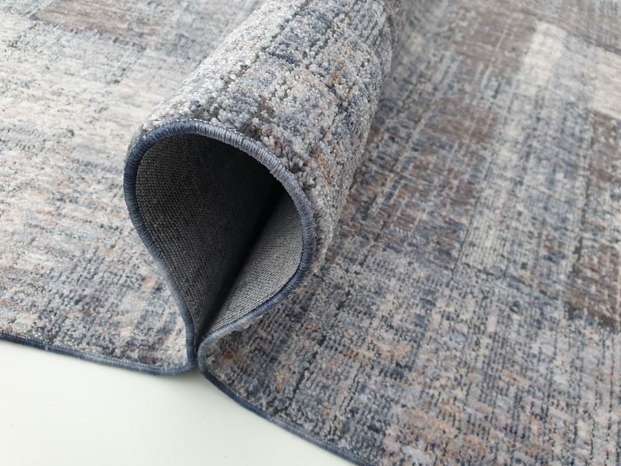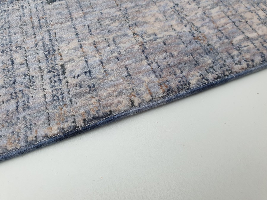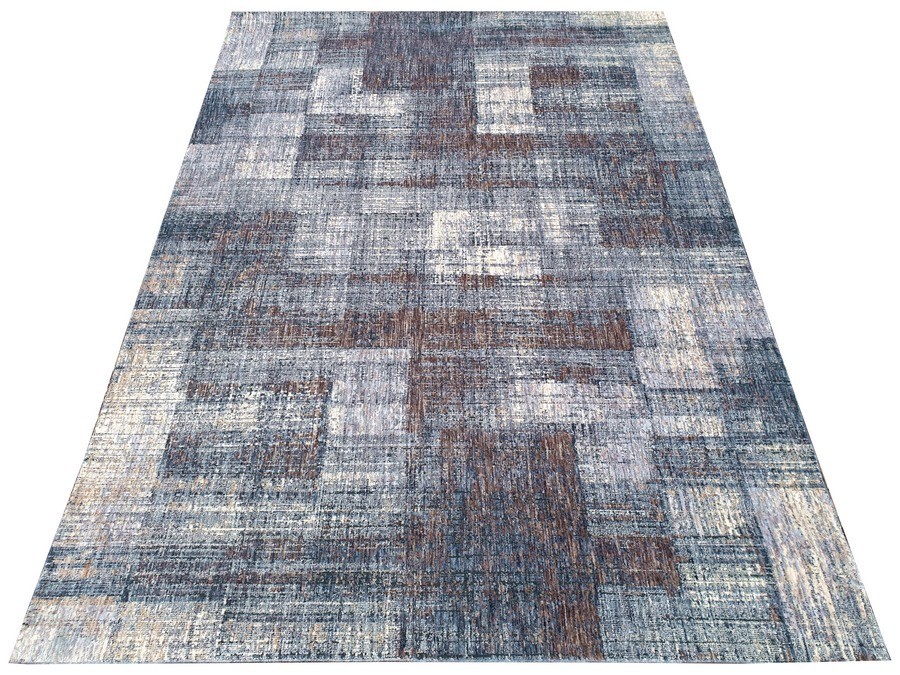 Dywan Kentucky 510 blue z kolekcji Kentucky to prawdziwa perełka dla miłośników nowoczesnego designu. Jego głównym kolorem jest głęboki, stonowany niebieski, który nadaje wnętrzu spokoju i elegancji. Kolory dodatkowe, takie jak odcienie szarości, beżu oraz subtelne akcenty brązu, tworzą harmonijną kompozycję, która nie przytłacza, a jednocześnie dodaje charakteru. Wzór dywanu jestgeometryczny, składający się z nieregularnych prostokątów i kwadratów, które zachodzą na siebie, tworząc efekt trójwymiarowości. Każdy z tych kształtów ma różną intensywność koloru, co sprawia, że dywan jest dynamiczny i przyciąga wzrok. Kształt dywanu jest prostokątny, co sprawia, że idealnie wpasuje się w różne przestrzenie, zarówno te małe, jak i duże. Dywan nie posiada frędzli, co dodaje mu minimalistycznego, współczesnego wyglądu.