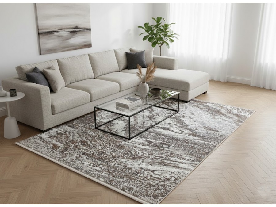 Dywan Exclusive 100 dark vizion gold z kolekcji Exclusive to prawdziwe dzieło sztuki, które przyciąga uwagę swoją głębią i wyrazistością. Dominującym kolorem jest ciemny brąz, który nadaje dywanowi elegancki i luksusowy charakter. Kolor ten jest przełamany subtelnymi odcieniami szarości i beżu, które tworzą harmonijną kompozycję. Wzór dywanu jest niezwykle dynamiczny i przypomina naturalne formacje skalne lub abstrakcyjne malowidła, co dodaje mu unikalności i artystycznego wyrazu. Linie i kształty na dywanie są płynne, tworząc wrażenie ruchu i głębi, co sprawia, że dywan ten może stać się centralnym punktem każdego wnętrza. Kształt dywanu jest klasycznie prostokątny, co czyni go uniwersalnym dodatkiem do różnych pomieszczeń. Dywan posiada frędzle na krótszych bokach, które dodają mu tradycyjnego uroku i podkreślają jego rękodzielniczy charakter.