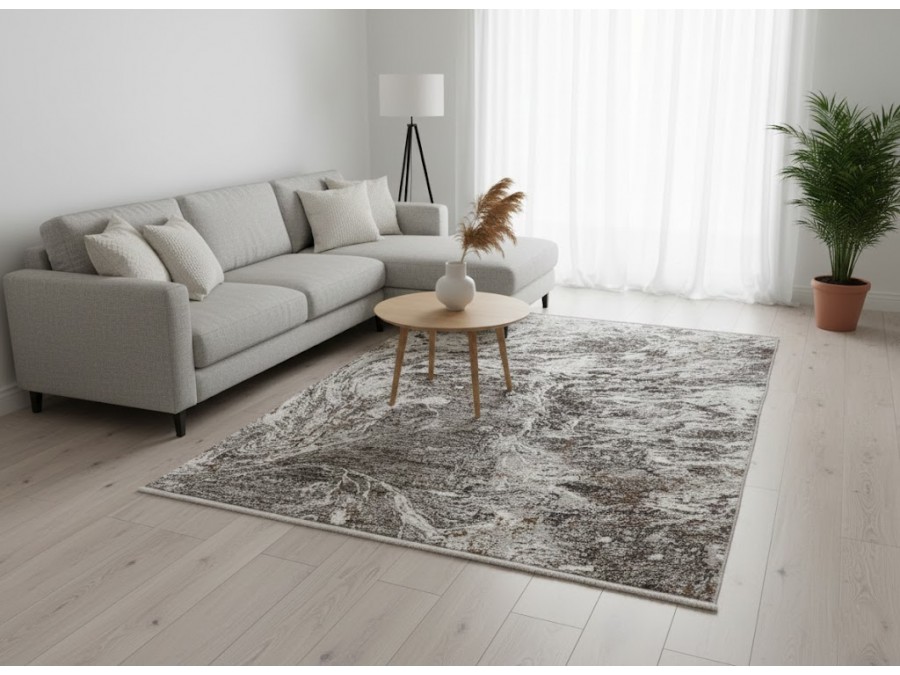 Dywan Exclusive 101 dark vizion gold z kolekcji Exclusive to prawdziwe dzieło sztuki, które zachwyca swoją głębią i elegancją. Dominującym kolorem jest ciemny, niemal czarny odcień, który nadaje dywanowi tajemniczego i luksusowego charakteru. Kolorami dodatkowymi są różne odcienie szarości, które tworzą delikatne przejścia i kontrasty, oraz subtelne złote akcenty, które dodają dywanowi blasku i wyjątkowości. Wzór dywanu jest niezwykle intrygujący - przypomina abstrakcyjne, organiczne formy, które mogą kojarzyć się z naturalnymi formacjami skalnymi lub falami morskimi. Te wzory są dynamiczne, pełne ruchu, co sprawia, że dywan przyciąga wzrok i staje się centralnym punktem każdego wnętrza. Dywan ma kształt prostokąta, a jego brzegi zdobią delikatne frędzle, które dodają mu klasycznego uroku.