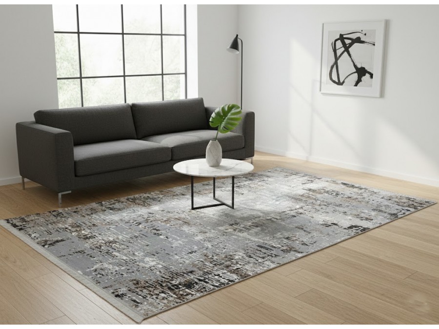 Dywan Exclusive 200 gray black z kolekcji Exclusive to prawdziwa perełka dla miłośników nowoczesnego designu. Jego głównym kolorem jest szary, który tworzy harmonijną bazę dla całego wzoru. Kolory dodatkowe, takie jak czarny, beżowy i biały, dodają dywanowi głębi i dynamiki. Wzór dywanu jest abstrakcyjny, przypominający nieco przypadkowe smugi i plamy, co nadaje mu artystycznego charakteru. Można w nim dostrzec nawiązania do industrialnego stylu, gdzie surowe, nieregularne kształty są mile widziane. Dywan ma kształt prostokąta, co sprawia, że jest uniwersalny i łatwy do dopasowania do różnych przestrzeni. Dodatkowo, posiada frędzle na krótszych bokach, które dodają mu klasycznego akcentu, łącząc w ten sposób nowoczesność z tradycją.