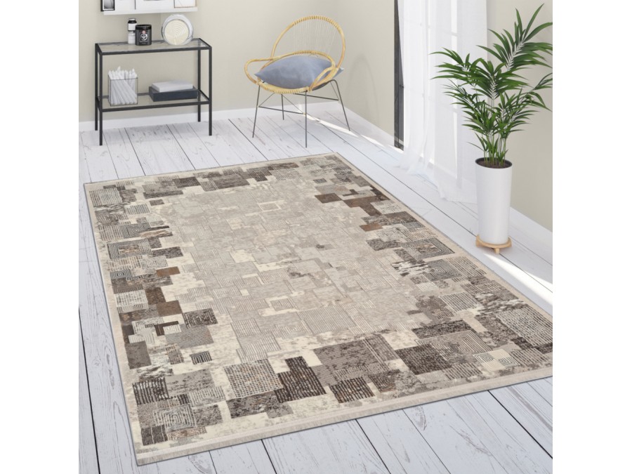 Dywan Exclusive 234 dark vizion gold z kolekcji Exclusive to prawdziwa perełka dla miłośników eleganckiego i nowoczesnego designu. Jego głównym kolorem jest głęboki, stonowany beż, który nadaje wnętrzu subtelną elegancję. Kolory dodatkowe, takie jak odcienie szarości, brązu oraz delikatne akcenty złota, tworzą harmonijną kompozycję, która przyciąga wzrok i dodaje głębi. Wzór dywanu jest wyjątkowo intrygujący - centralna część jest delikatnie geometryczna, z subtelnymi, nieregularnymi liniami, które przypominają mapę lub abstrakcyjny plan miasta. Otoczona jest ramą z większych, prostokątnych i kwadratowych kształtów, które różnią się odcieniami i fakturami, co dodaje dywanowi dynamiki i nowoczesnego charakteru. Kształt dywanu jest prostokątny, a jego krawędzie zdobią delikatne frędzle, które dodają mu klasycznego uroku.