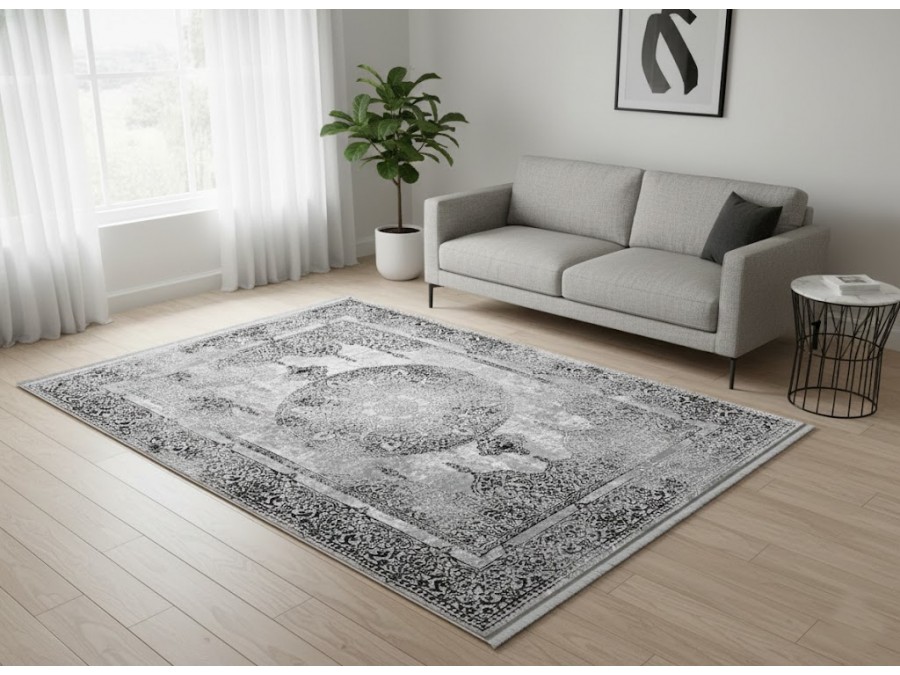Dywan Exclusive 249 grey z kolekcji Exclusive to prawdziwa perełka dla miłośników eleganckiego i klasycznego designu w nowoczesnym wydaniu. Jego głównym kolorem jest głęboki, szlachetny szary, który wnosi do wnętrza spokój, elegancję i ponadczasowy styl. Dodatkowe odcienie popielu, grafitu oraz subtelne, złote akcenty tworzą harmonijną kompozycję, która przyciąga wzrok i nadaje pomieszczeniu wyrafinowanego charakteru. Wzór dywanu nawiązuje do klasyki, przypominając bogato zdobione, tradycyjne perskie kobierce. Centralna część zdobiona jest misternym, ornamentalnym motywem, który rozchodzi się promieniście ku brzegom, tworząc efekt głębi i dynamiki. Całość otacza elegancka bordiura, która podkreśla kunszt wykonania i dopełnia wzór. Prostokątny kształt czyni go uniwersalnym dodatkiem do różnych przestrzeni – zarówno tych bardziej klasycznych, jak i nowoczesnych. Brak frędzli dodaje całości współczesnego sznytu i minimalizmu, nie odbierając dywanowi jego dekoracyjnej wartości.