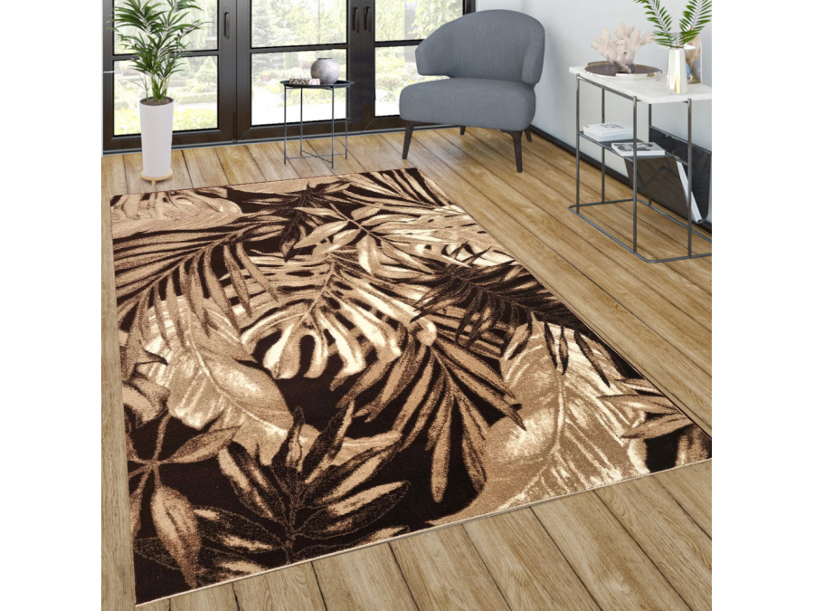 Dywan Lapiso SOFT 404 brown z kolekcji Lapiso zachwyca swoim unikalnym wzorem oraz głębią kolorów. Dominującym kolorem jest brąz, który nadaje dywanowi elegancki i klasyczny wygląd. Brąz ten jest niejednolity, pełen różnych odcieni, od jasnych, niemal beżowych tonów, po ciemne, niemal czarne akcenty. Wzór dywanu jest inspirowany naturą, przedstawia bowiem duże, tropikalne liście, które są rozrzucone w dynamiczny sposób. Liście te są w różnych odcieniach brązu, co tworzy efekt głębi i trójwymiarowości. Kształt dywanu jest prostokątny, co sprawia, że idealnie wpasuje się w różne przestrzenie, zarówno te nowoczesne, jak i bardziej tradycyjne. Dywan nie posiada frędzli, co dodaje mu nowoczesnego charakteru i ułatwia jego pielęgnację.