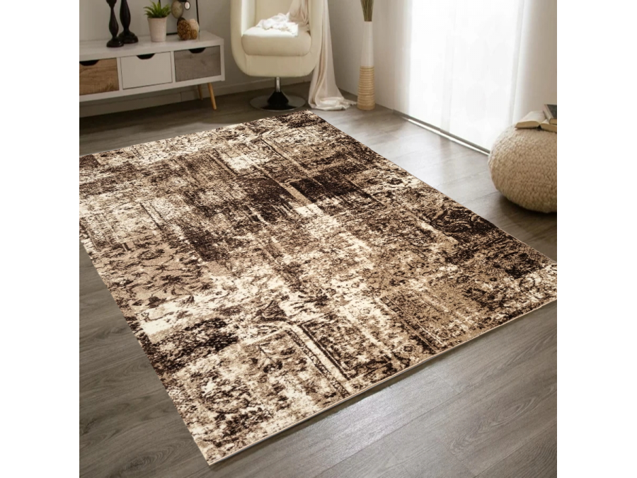 Dywan Lapiso SOFT 408 brown z kolekcji Lapiso to prawdziwa perełka dla miłośników klasycznego wzornictwa z nutą nowoczesności. Dominującym kolorem tego dywanu jest głęboki, ciepły brąz, który nadaje wnętrzu przytulności i elegancji. Kolor ten jest przełamany subtelnymi odcieniami beżu, szarości oraz czerni, tworząc harmonijną kompozycję, która doskonale wpasuje się w różnorodne aranżacje. Wzór dywanu jest niezwykle bogaty i złożony, przypominając nieco stare, zabytkowe gobeliny, które z biegiem czasu nabrały patyny. Centralna część dywanu zdobiona jest dużymi, abstrakcyjnymi plamami w ciemniejszych odcieniach brązu i czerni, które kontrastują z jaśniejszymi, bardziej zdobionymi fragmentami. Te jaśniejsze obszary są wypełnione delikatnymi, roślinnymi motywami oraz geometrycznymi wzorami, które dodają dywanowi lekkości i finezji. Dywan ma kształt prostokąta, co sprawia, że jest bardzo uniwersalny i łatwy do dopasowania do różnych przestrzeni. Nie posiada frędzli, co nadaje mu nowoczesny, minimalistyczny wygląd.