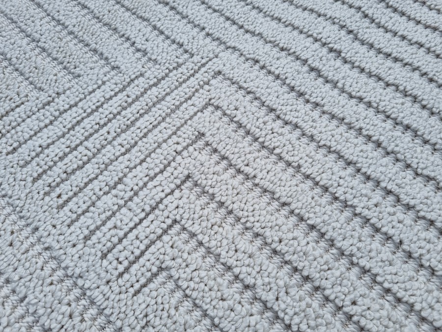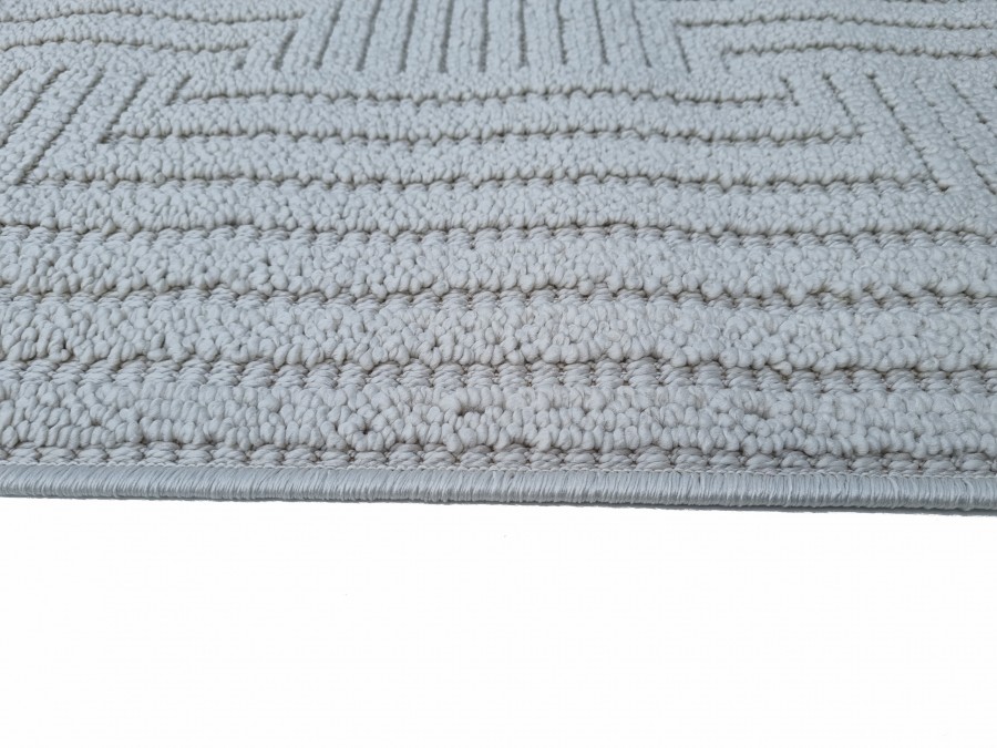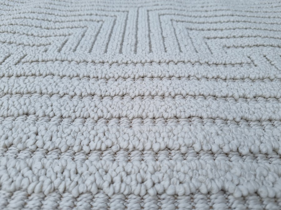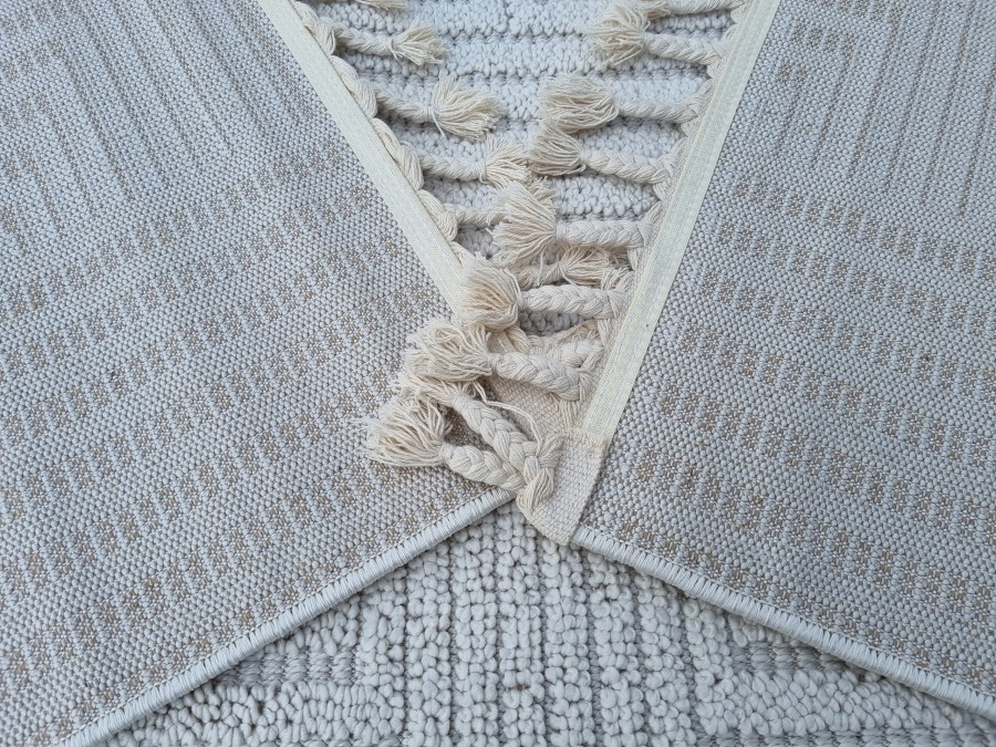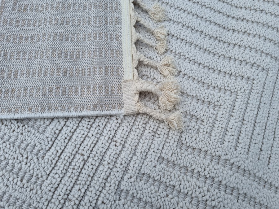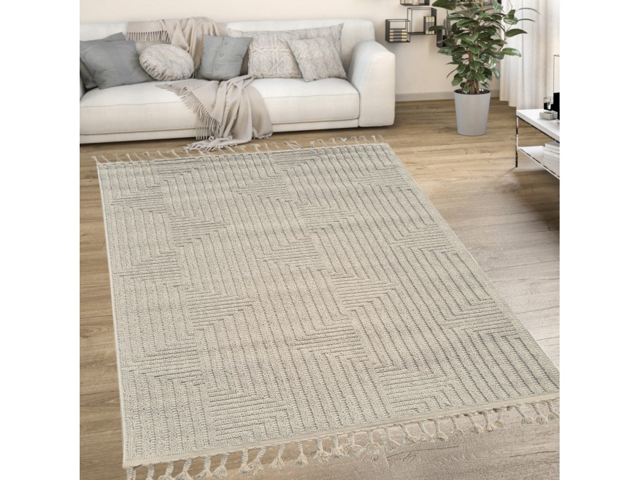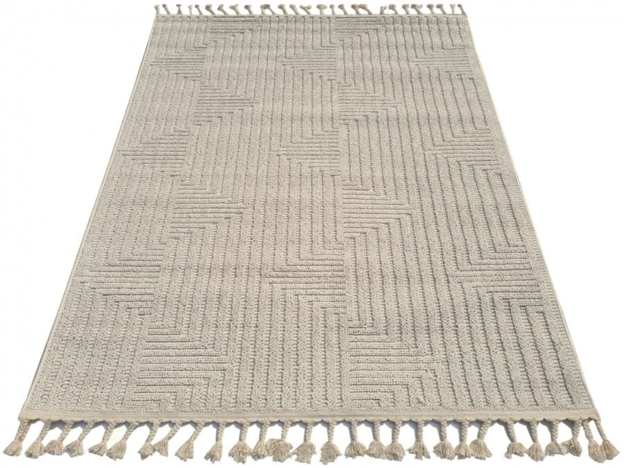 Wzór dywanu jest geometryczny, składający się z powtarzających się, trójkątnych kształtów, które tworzą harmonijną, ale zarazem dynamiczną kompozycję. Te trójkąty są ułożone w taki sposób, że tworzą iluzję ruchu, co dodaje dywanowi nowoczesnego charakteru. Kształt dywanu jest prostokątny, co sprawia, że jest on uniwersalny i łatwy do dopasowania do różnych pomieszczeń. Dodatkowym atutem są frędzle na obu krótszych bokach, które nadają dywanowi tradycyjnego, rękodzielniczego wyglądu, jednocześnie dodając mu uroku i oryginalności.