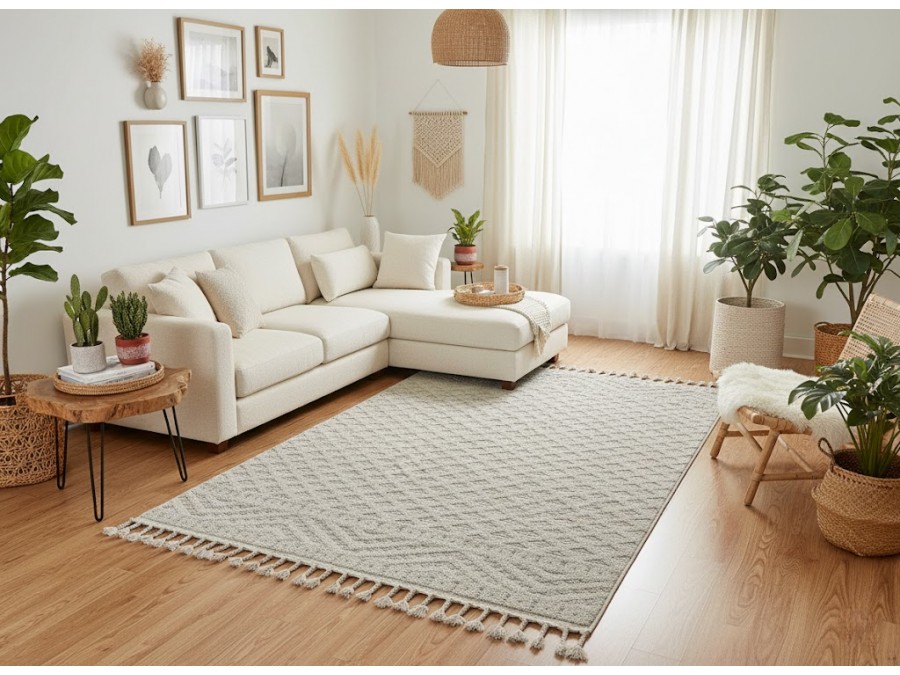 Jeśli szukasz inspiracji na urządzenie wnętrza z dywanem Milano 027 cream, wyobraź sobie salon w stylu skandynawskim, gdzie ściany są w pastelowych odcieniach, a meble w naturalnym drewnie. Dywan ten może być centralnym punktem tego pomieszczenia, na którym ustawisz jasną sofę i fotele, tworząc przytulną strefę relaksu. Dodaj do tego kilka poduszek w odcieniach beżu i bieli oraz lniane zasłony, a całość dopełnij minimalistycznymi dekoracjami, jak wazon z suszonymi kwiatami czy świece. W sypialni dywan ten może leżeć przy łóżku, dodając miękkości i ciepła, zwłaszcza jeśli pościel będzie w podobnych tonacjach. W przestrzeni biurowej, gdzie dominuje minimalizm, dywan Milano 027 cream może złagodzić surowość nowoczesnych mebli, wprowadzając przytulną atmosferę.