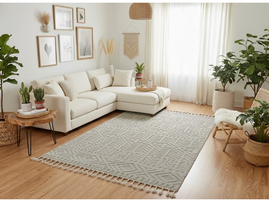 Dywan Milano 031 cream posiada dodatkowo frędzle na obu krótszych bokach, które dodają mu rustykalnego uroku i nawiązują do tradycyjnych, ręcznie tkanych dywanów. Frędzle te są w tym samym kremowym odcieniu, co całość, co sprawia, że dywan wygląda spójnie i elegancko. Inspiracją do aranżacji wnętrza z tym dywanem może być minimalistyczny salon w stylu skandynawskim, gdzie jego delikatny kolor i geometryczny wzór będą idealnie współgrać z jasnymi meblami i naturalnymi materiałami, takimi jak drewno czy len. Można go również wykorzystać w sypialni, gdzie jego uspokajające barwy i wzór wprowadzą atmosferę relaksu i spokoju. Dla kontrastu, dywan ten świetnie sprawdzi się w nowoczesnym biurze, gdzie jego wzór będzie stanowić ciekawy akcent na tle surowych, industrialnych elementów.