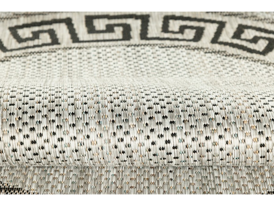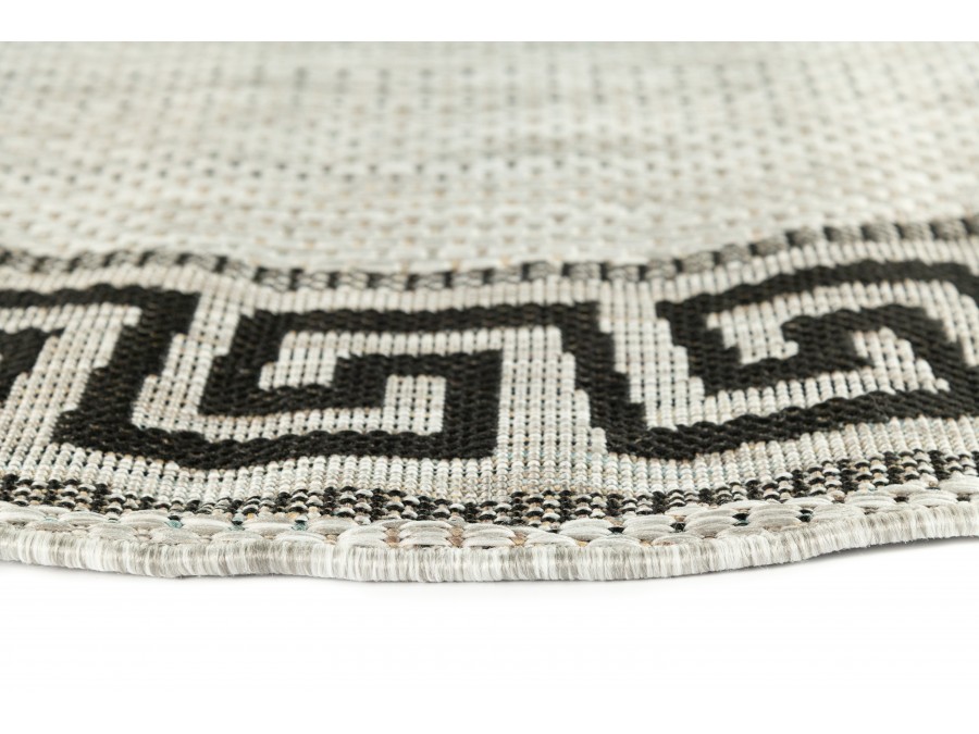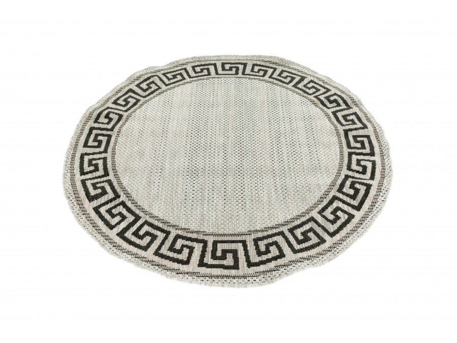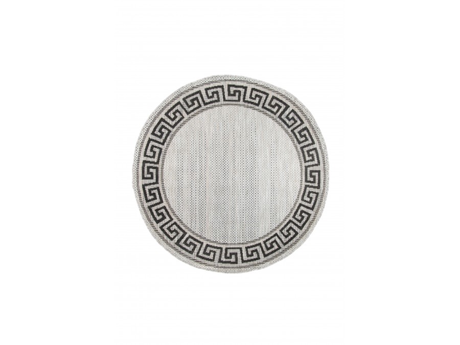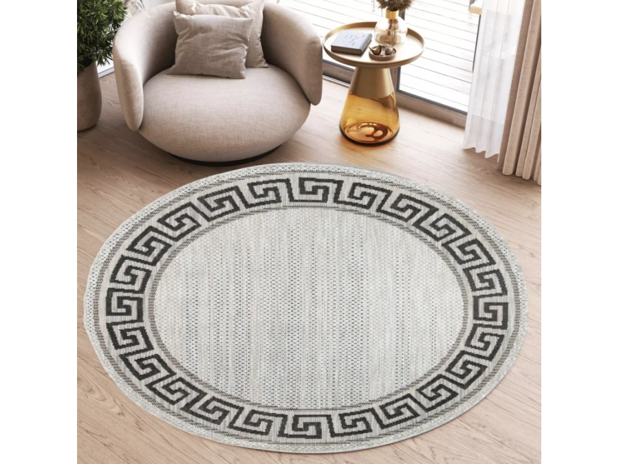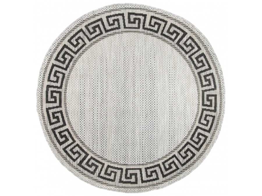 Dywan okrągły sznurkowy Meli 00.91 gray z kolekcji sznurkowy to prawdziwa perełka dla miłośników klasycznego designu z nutą nowoczesności. Jego głównym kolorem jest szary , który nadaje wnętrzu przytulności i ciepła. Brąz ten jest delikatny, niemal beżowy, co sprawia, że dywan jest bardzo uniwersalny i łatwo dopasowuje się do różnych stylów aranżacji. Dodatkowymi kolorami są czarny i szary, które pojawiają się we wzorze obramowania dywanu. Wzór ten to klasyczny meander, znany również jako grecki klucz, który dodaje dywanowi elegancji i ponadczasowego charakteru. Meander jest symetryczny i równomiernie rozłożony wokół całego obwodu dywanu, co tworzy harmonijną ramę dla centralnej części dywanu, która jest gładka i pozbawiona dodatkowych wzorów.