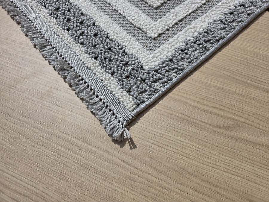 Wzór dywanu jest wyjątkowo interesujący i przyciąga uwagę. Centralna część dywanu zdobiona jest geometrycznym wzorem przypominającym delikatne fale lub łuski, co nadaje mu nowoczesny, a zarazem ponadczasowy wygląd. Wzór ten jest subtelny, nie przytłacza, a jednocześnie dodaje dywanowi głębi i tekstury. Otaczające dywan pasy są gładkie, co kontrastuje z centralnym wzorem, tworząc harmonijną kompozycję. Dywan ma prostokątny kształt, co czyni go idealnym do różnych pomieszczeń, od salonów po sypialnie. Dodatkowo, dywan posiada frędzle na krótszych bokach, które dodają mu rustykalnego uroku i nawiązują do tradycyjnych wzorów, jednocześnie nie tracąc na nowoczesności.