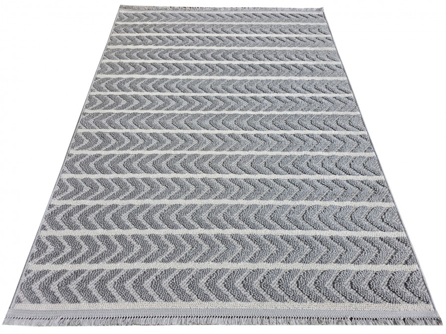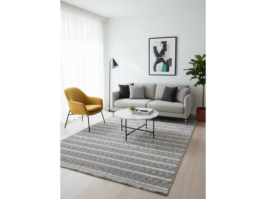 Wyobraź sobie wnętrze, w którym dywan Milano 026 gray cream staje się centralnym punktem aranżacji. W salonie, gdzie dominują neutralne barwy, dywan ten może być położony pod nowoczesną sofą w odcieniach szarości, a na ścianach zawieszone obrazy w czarno-białych tonacjach. Kremowe akcenty dywanu mogą znaleźć swoje odbicie w poduszkach dekoracyjnych czy pledach, tworząc harmonijną całość. W sypialni, dywan ten może leżeć obok łóżka, dodając przytulności i komfortu, a jego frędzle mogą nawiązywać do zasłon czy narzuty. W biurze domowym, dywan może być umieszczony pod biurkiem, wprowadzając spokój i koncentrację. Dzięki swojej uniwersalności, dywan Milano 026 gray cream doskonale sprawdzi się w różnych stylach wnętrz, od skandynawskiego po industrialny, zawsze dodając im klasy i elegancji.