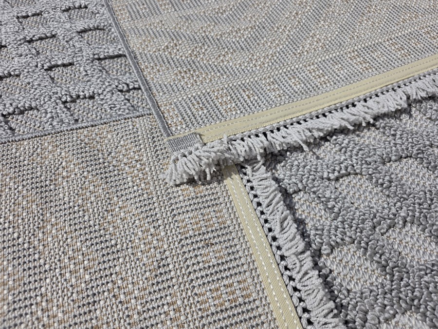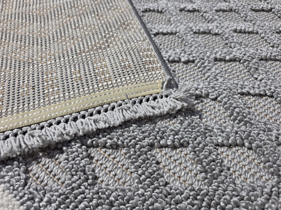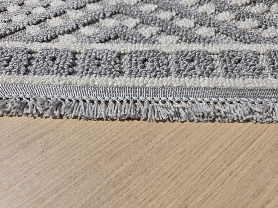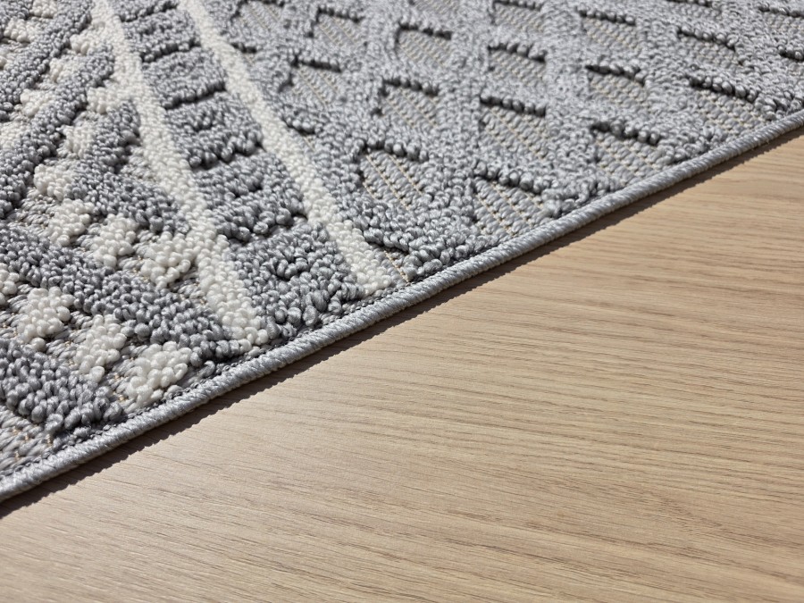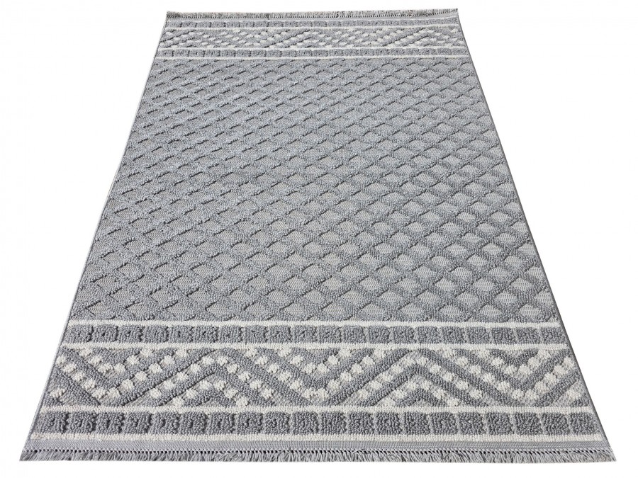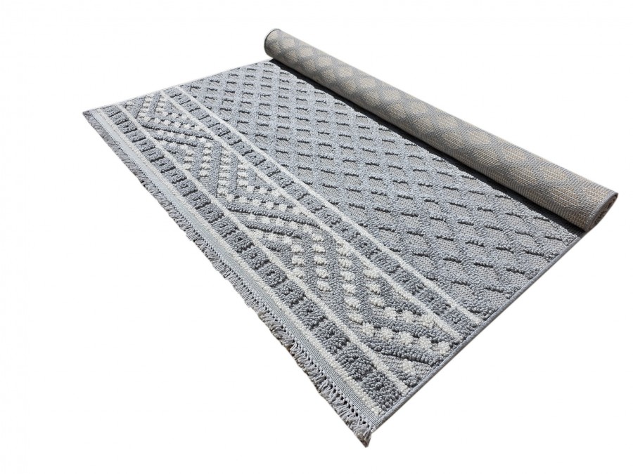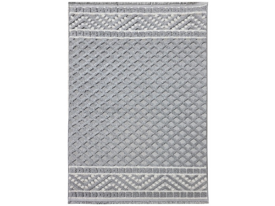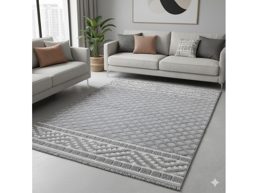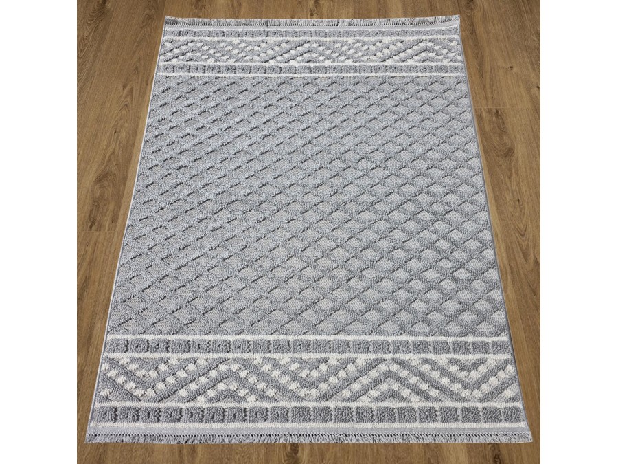 Dywan Milano 027 gray cream z kolekcji Milano to prawdziwa perełka dla miłośników eleganckiego i subtelnego designu. Jego głównym kolorem jest szary, który nadaje mu stonowany i uniwersalny charakter, idealny do różnorodnych aranżacji wnętrz. Kolorem dodatkowym jest kremowy, który pojawia się w delikatnych akcentach, dodając dywanowi lekkości i klasy. Wzór dywanu jest wyjątkowo interesujący - centralna część składa się z geometrycznego, romboidalnego motywu, który przywodzi na myśl tradycyjne, ręcznie tkane dywany, jednocześnie zachowując nowoczesny styl. Brzegi dywanu zdobią pasy z bardziej skomplikowanymi, geometrycznymi wzorami, które przypominają tradycyjne ornamenty, ale w minimalistycznym wydaniu. Dywan ma kształt prostokąta, co sprawia, że jest bardzo praktyczny i łatwy do dopasowania do różnych pomieszczeń. Dodatkowo, dywan posiada frędzle na krótszych bokach, które dodają mu rustykalnego uroku i Vintage’owego charakteru.