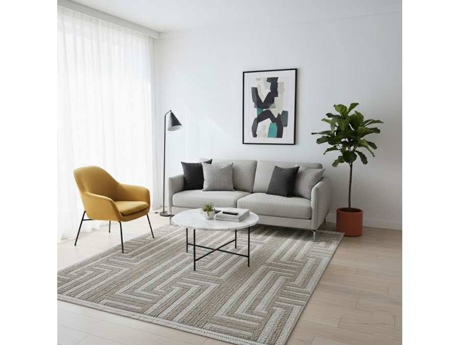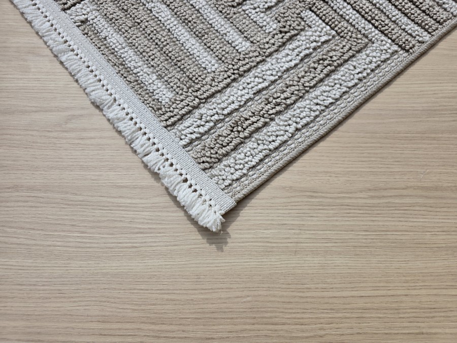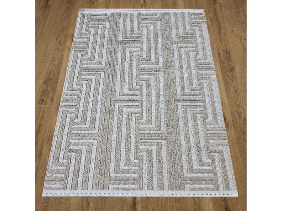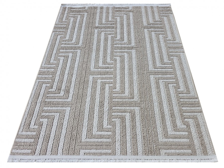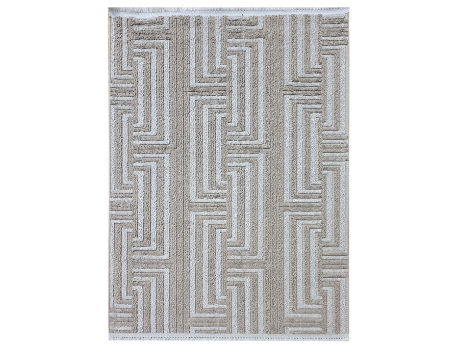 Dywan Milano 011 vizon beige z kolekcji Milano to prawdziwa perełka dla miłośników eleganckiego i nowoczesnego designu. Dominującym kolorem tego dywanu jest delikatny beż, który nadaje wnętrzu subtelną elegancję i ciepło. Beż ten jest idealnie zbalansowany, nie za jasny, nie za ciemny, co sprawia, że dywan ten jest uniwersalny i pasuje do wielu aranżacji. Dodatkowymi kolorami są odcienie szarości oraz bieli, które tworzą geometryczny wzór na powierzchni dywanu. Wzór ten składa się z powtarzających się, zgeometryzowanych kształtów, przypominających labirynt lub sieć uliczek w nowoczesnym mieście. Linie są proste, a kształty regularne, co dodaje dywanowi współczesnego charakteru. Dywan ma kształt prostokąta, co sprawia, że jest łatwy do wkomponowania w różne przestrzenie, zarówno te małe, jak i duże. Dodatkowym atutem są frędzle na krótszych bokach, które dodają dywanowi klasycznego akcentu, łącząc w ten sposób nowoczesność z tradycją.