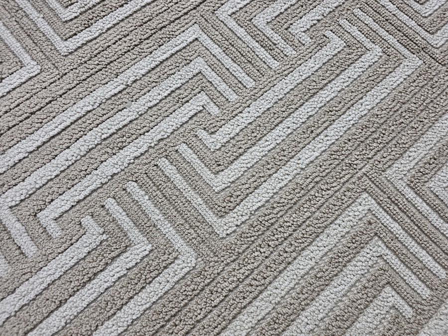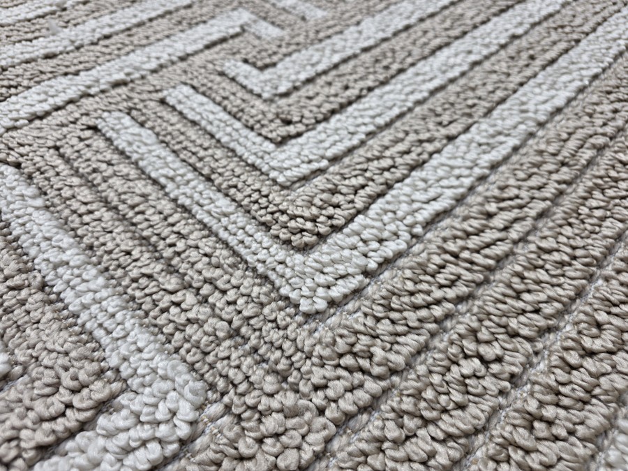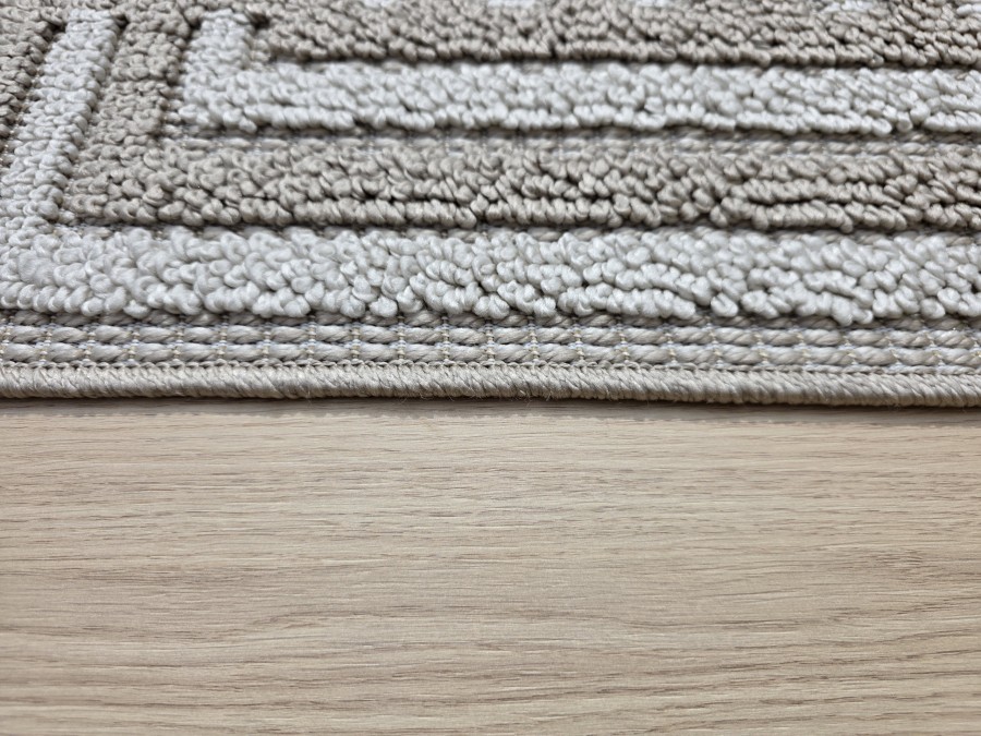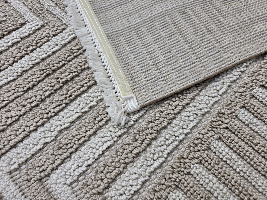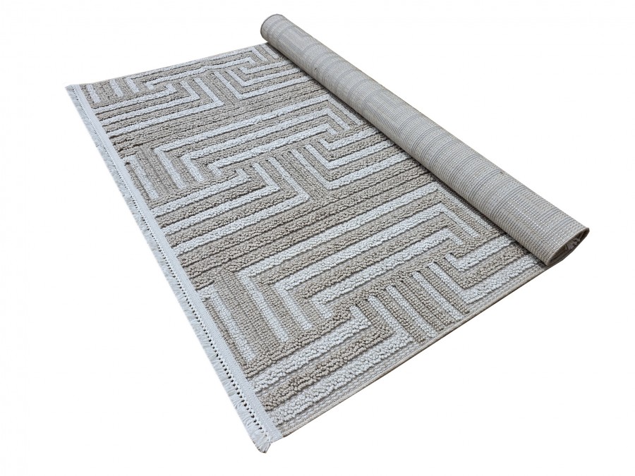 Dywan Milano 011 vizon beige z kolekcji Milano to prawdziwa perełka dla miłośników eleganckiego i nowoczesnego designu. Dominującym kolorem tego dywanu jest delikatny beż, który nadaje wnętrzu subtelną elegancję i ciepło. Beż ten jest idealnie zbalansowany, nie za jasny, nie za ciemny, co sprawia, że dywan ten jest uniwersalny i pasuje do wielu aranżacji. Dodatkowymi kolorami są odcienie szarości oraz bieli, które tworzą geometryczny wzór na powierzchni dywanu. Wzór ten składa się z powtarzających się, zgeometryzowanych kształtów, przypominających labirynt lub sieć uliczek w nowoczesnym mieście. Linie są proste, a kształty regularne, co dodaje dywanowi współczesnego charakteru. Dywan ma kształt prostokąta, co sprawia, że jest łatwy do wkomponowania w różne przestrzenie, zarówno te małe, jak i duże. Dodatkowym atutem są frędzle na krótszych bokach, które dodają dywanowi klasycznego akcentu, łącząc w ten sposób nowoczesność z tradycją.