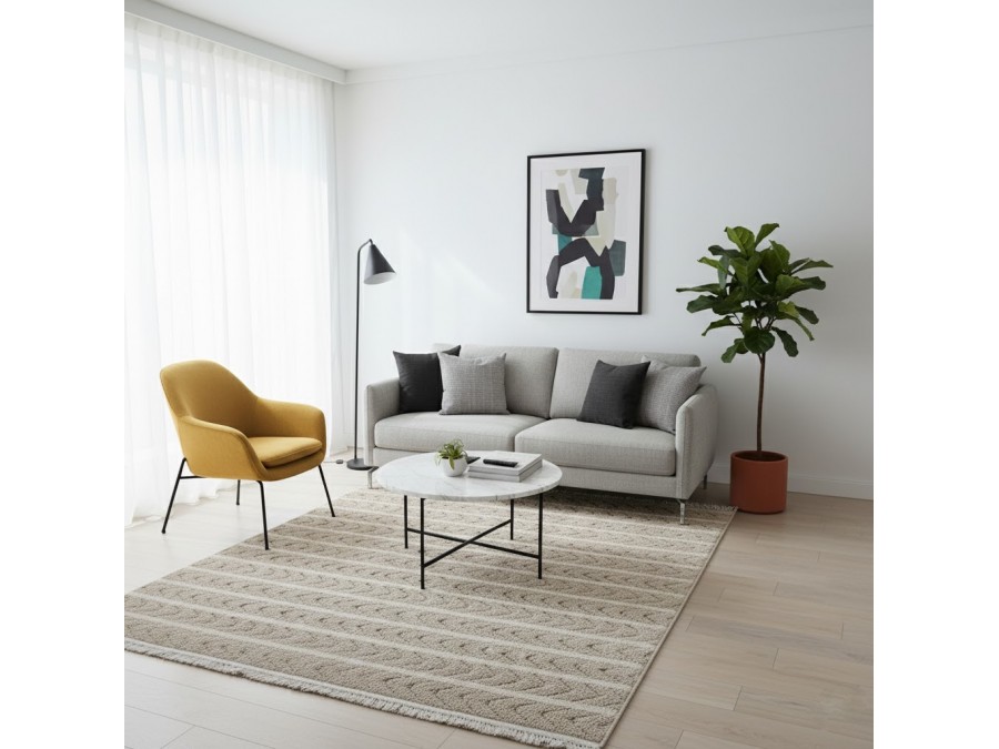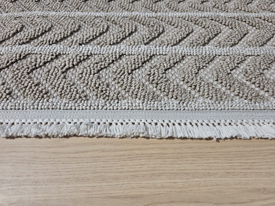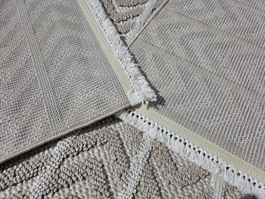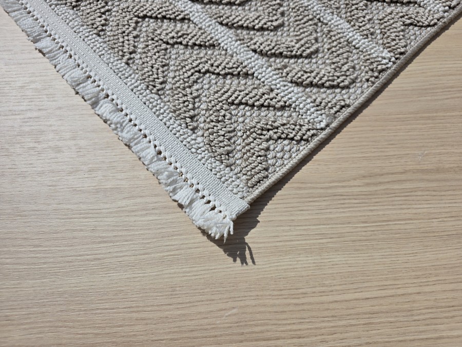 Dodatkowym atutem dywanu Milano 026 vizon beige są frędzle na obu krótszych bokach, które nadają mu klasycznego, a zarazem rustykalnego wyglądu. Frędzle te nie tylko dodają dywanowi uroku, ale również wprowadzają element tradycji, co może być szczególnie atrakcyjne dla miłośników vintage czy stylu boho. Jeśli chodzi o inspiracje aranżacyjne, ten dywan doskonale sprawdzi się w nowoczesnych wnętrzach, gdzie jego neutralne barwy będą stanowić doskonałe tło dla mebli w odważniejszych kolorach, takich jak granat czy butelkowa zieleń. Można go również wykorzystać w bardziej klasycznych wnętrzach, gdzie jego wzór będzie współgrał z drewnianymi meblami i dekoracjami w stylu retro. Wyobraź sobie salon z dużym oknem, przez które wpada naturalne światło, oświetlając dywan i wydobywając z niego wszystkie subtelne odcienie. Na dywanie ustawiona jest wygodna sofa w kolorze głębokiej zieleni, a obok niej designerski fotel w odcieniach szarości. Na ścianie za sofą wisi obraz w tonacji ziemi, a na stoliku kawowym stoją dekoracyjne świeczniki i książki w pastelowych okładkach. Całość tworzy spójną, przytulną i elegancką przestrzeń.