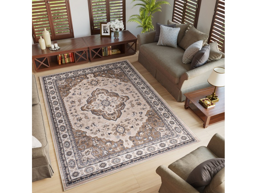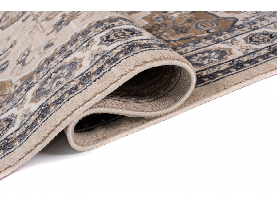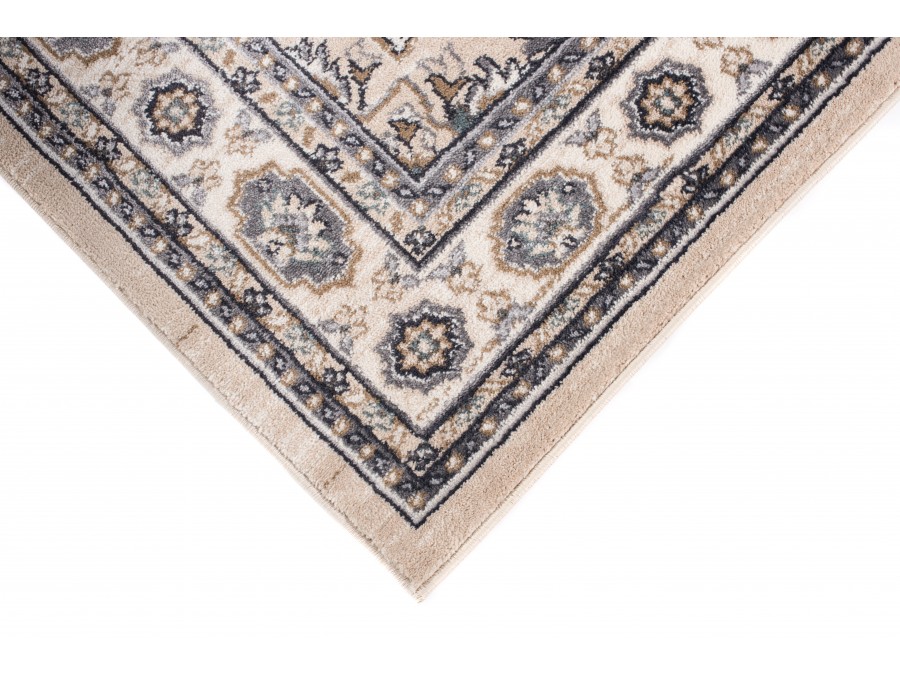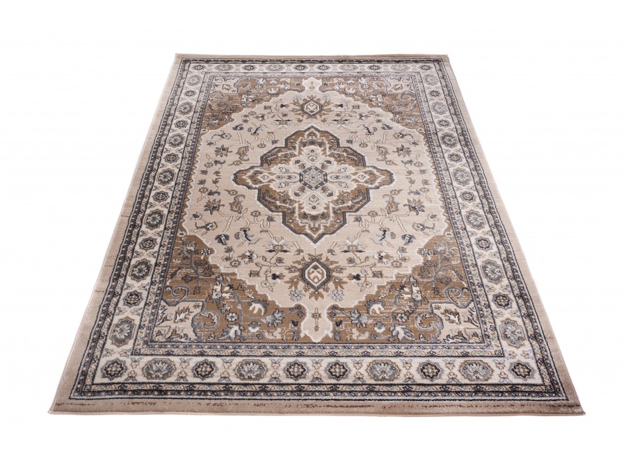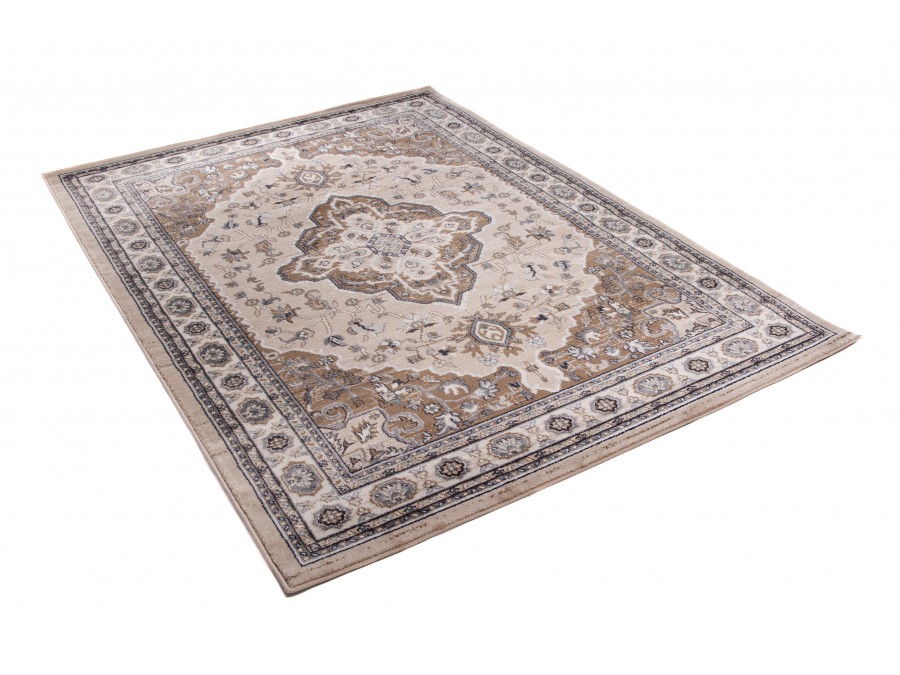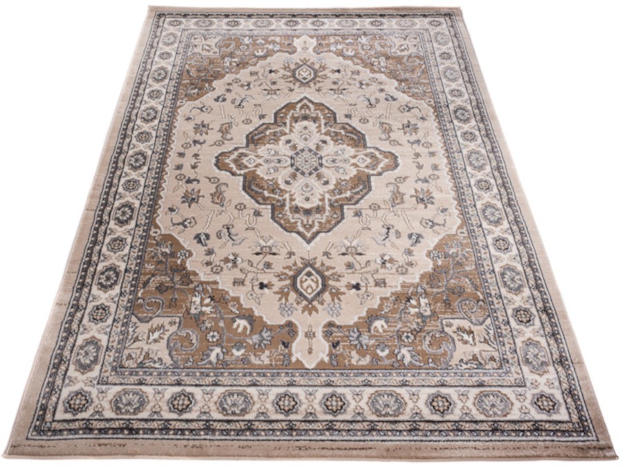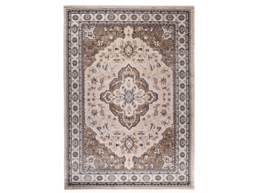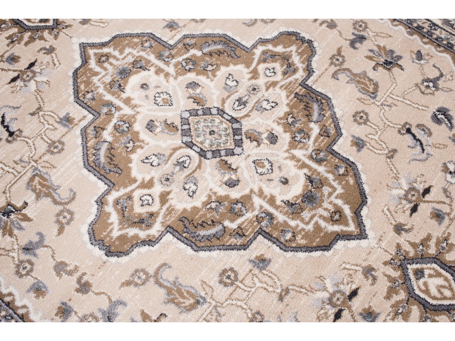 Dywan tradycyjny Colorino 00.468 light beige z kolekcji Colorino to prawdziwa perełka dla miłośników klasycznego wzornictwa. Jego głównym kolorem jest delikatny, jasny beż, który nadaje wnętrzu subtelności i elegancji. Dodatkowe kolory, takie jak brąz, szary oraz delikatne odcienie niebieskiego i zielonego, wzbogacają wzór, dodając mu głębi i charakteru. Wzór dywanu jest niezwykle bogaty i szczegółowy, centralnie umieszczony medalion w kształcie rozety przyciąga uwagę swoją złożonością. Medalion ten otoczony jest przez mniejsze, powtarzające się motywy kwiatowe i geometryczne, które tworzą harmonijną kompozycję. Brzegi dywanu zdobią delikatne, ornamentowe bordiury, które dodają całości klasycznego szyku.