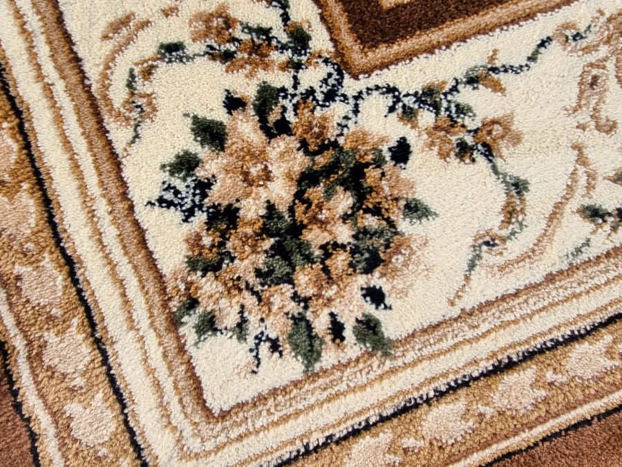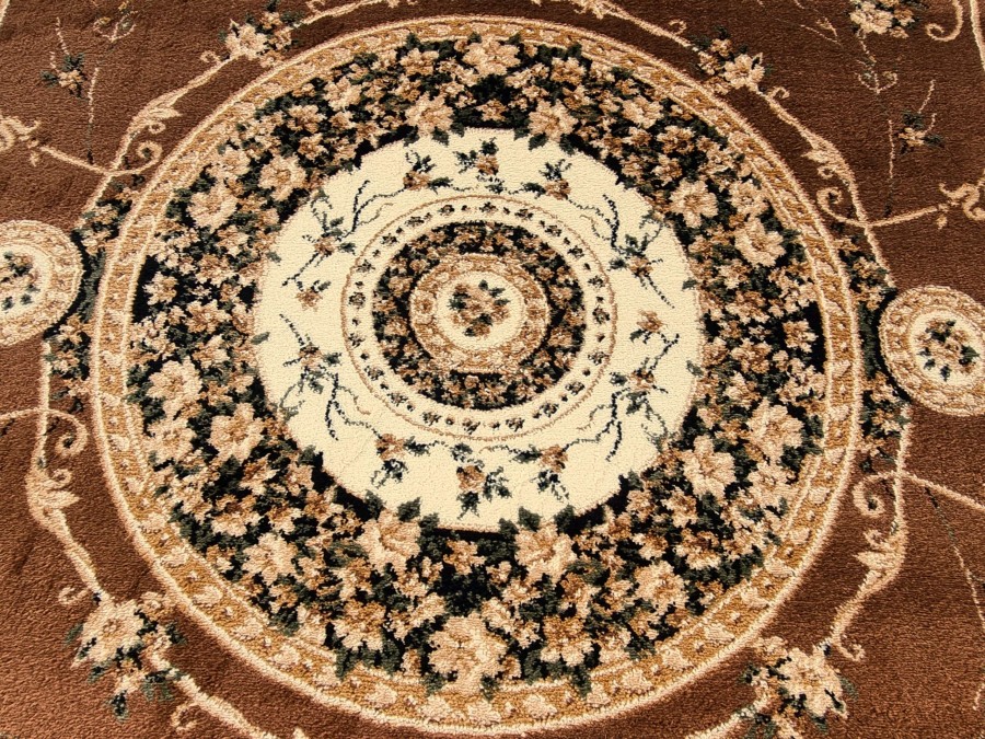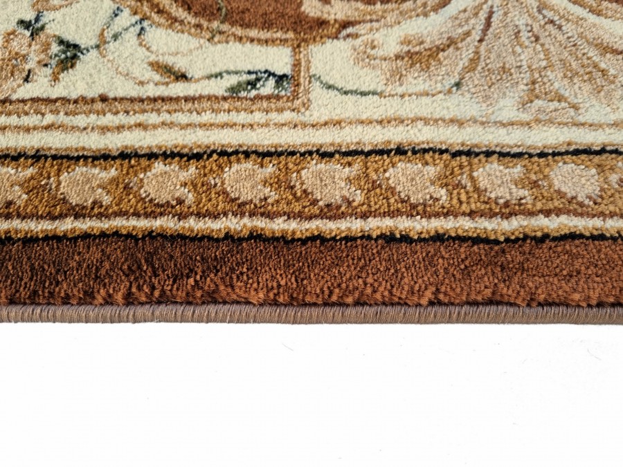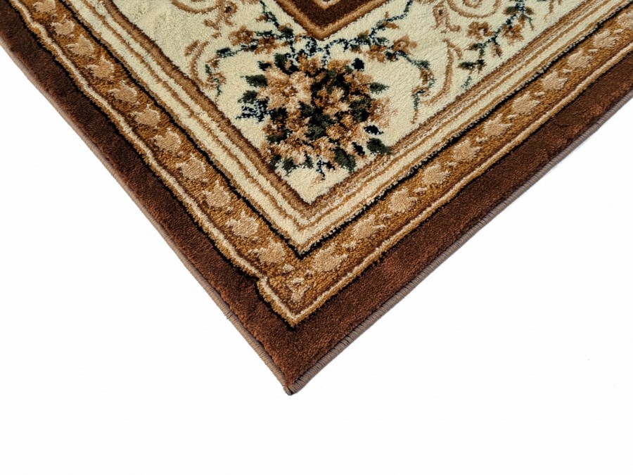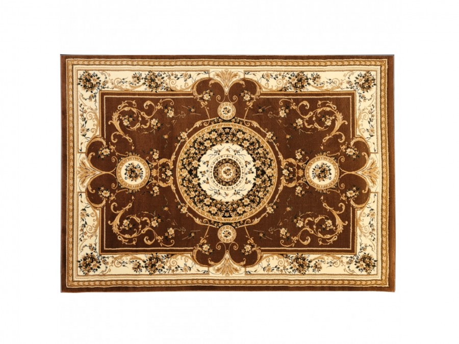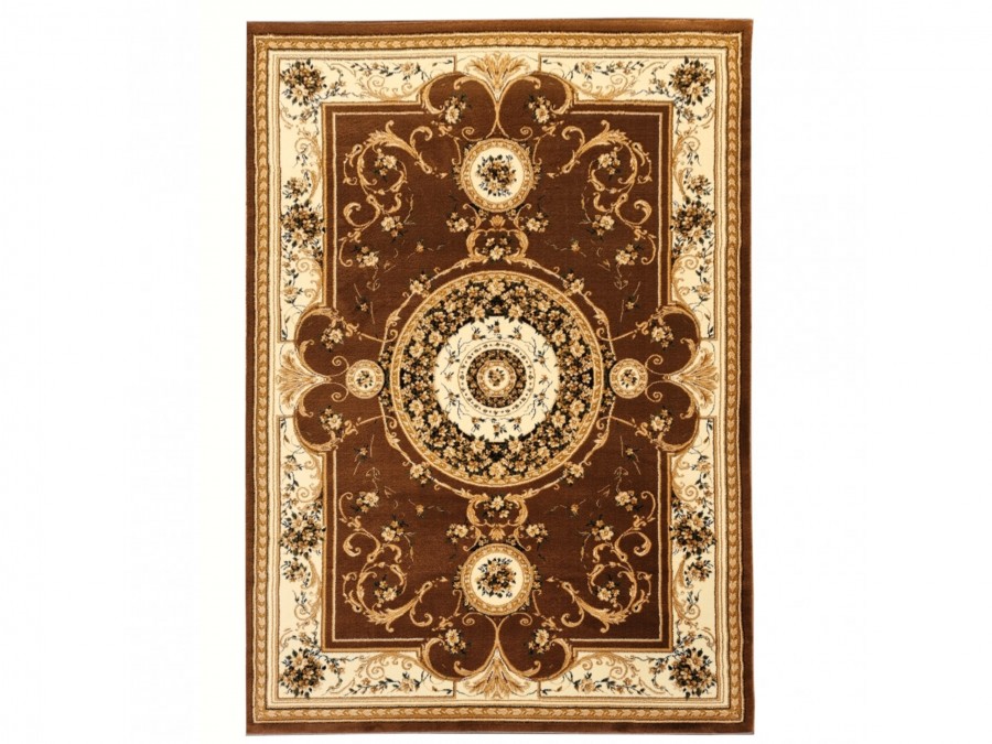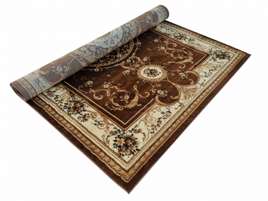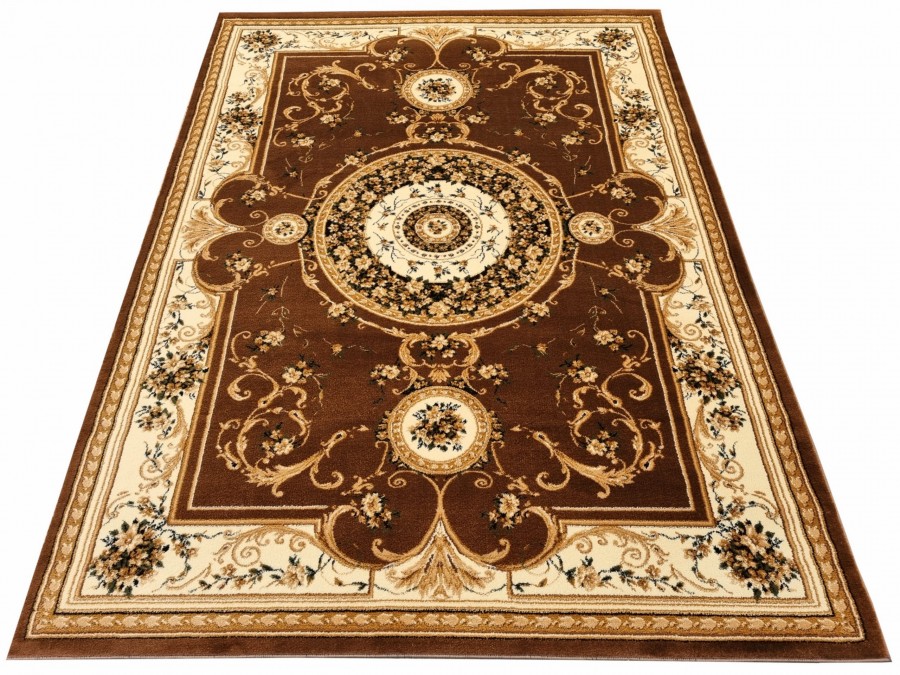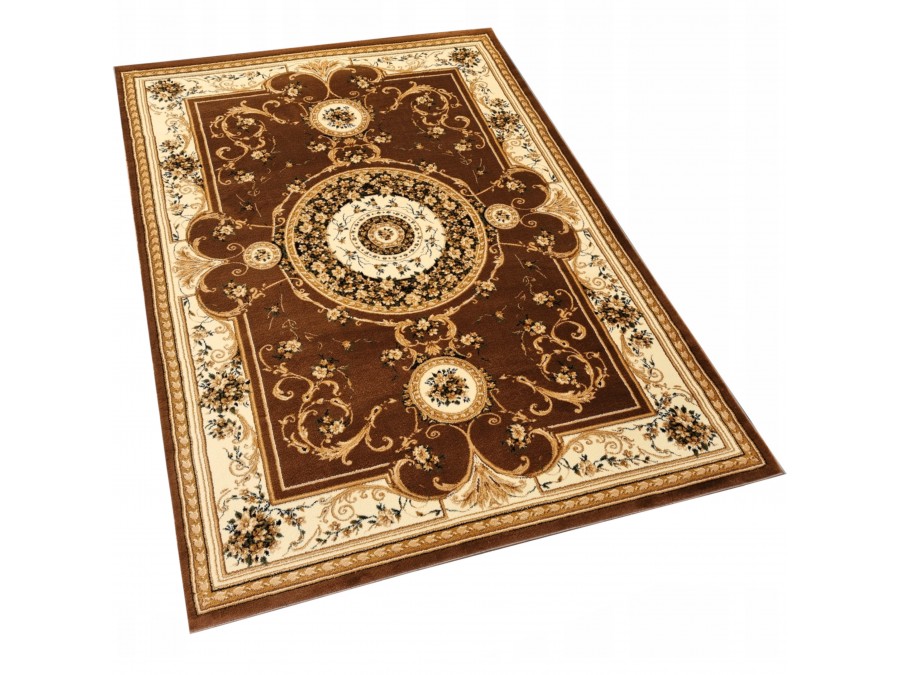 Dywan Orient 003 brown z kolekcji Orient to prawdziwa perełka dla miłośników klasycznego wzornictwa. Dominującym kolorem tego dywanu jest głęboki, ciepły brąz, który nadaje wnętrzu elegancji i przytulności. Kolory dodatkowe, takie jak beż, kremowy, złoty oraz subtelne odcienie zieleni i różu, tworzą harmonijną kompozycję, która przyciąga wzrok i dodaje wnętrzu wyrafinowania. Wzór dywanu jest niezwykle bogaty i złożony, inspirowany tradycyjną sztuką orientalną. Centralnym motywem jest okrągły medalion, otoczony misternie wykonanymi ornamentami i kwiatowymi motywami, które rozchodzą się promieniście na całą powierzchnię dywanu. Brzegi dywanu zdobią delikatne, roślinne motywy, które płynnie przechodzą w bordiurę, dodając całości spójności i elegancji. Dywan ma kształt prostokąta, a jego brzegi są wykończone równo, bez frędzli, co podkreśla jego nowoczesne podejście do klasycznego wzornictwa.