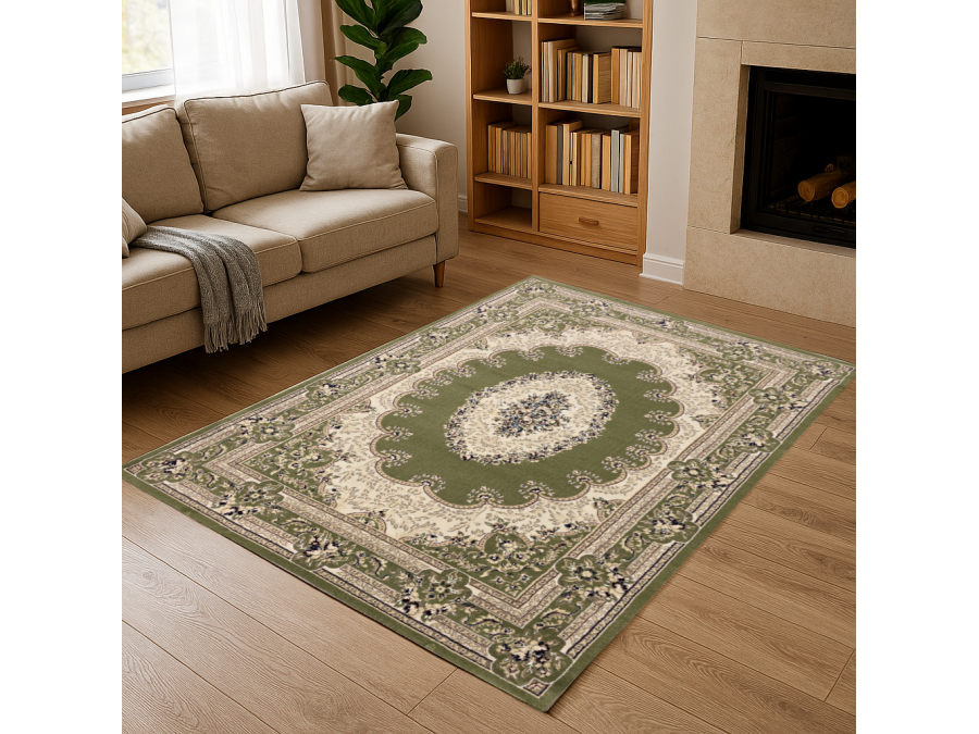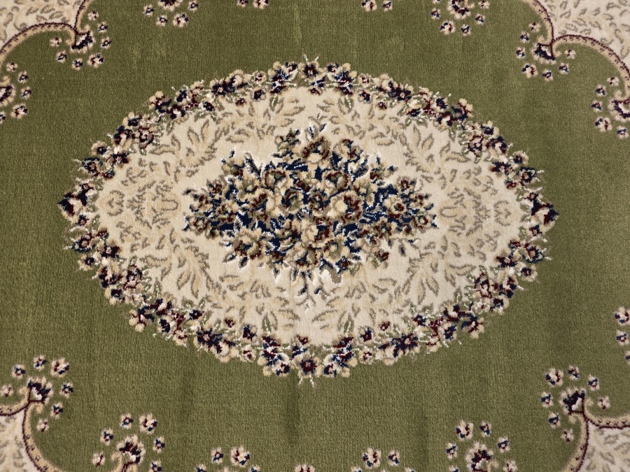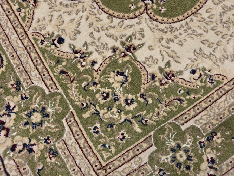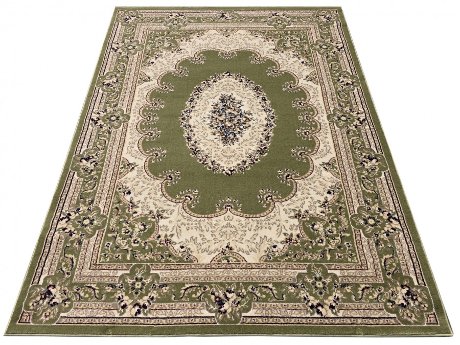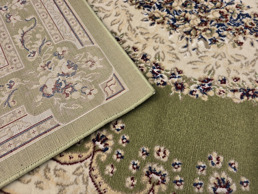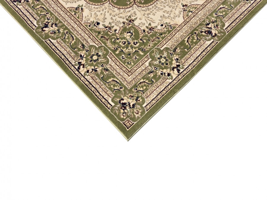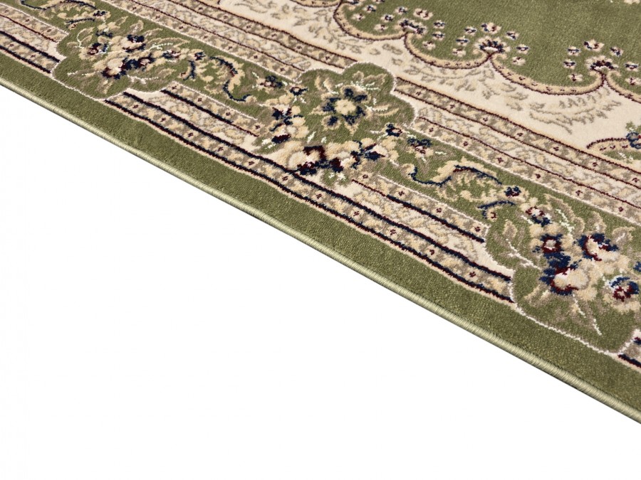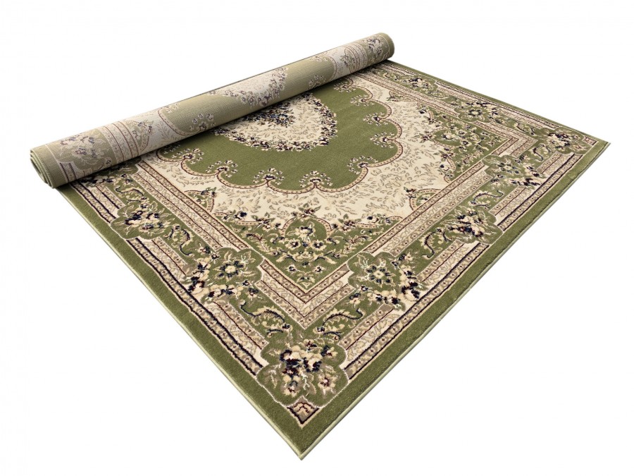 Dywan Orient S002 green z kolekcji Orient to prawdziwa perełka dla miłośników klasycznego wzornictwa i subtelnej elegancji. Jego głównym kolorem jest głęboka, uspokajająca zieleń, która nadaje wnętrzu spokoju i harmonii. Kolory dodatkowe to beż oraz odcienie szarości, które w subtelny sposób kontrastują z zielenią, tworząc elegancki i wyważony efekt. Wzór dywanu jest niezwykle bogaty i złożony, nawiązujący do tradycyjnych perskich motywów. Centralnym punktem jest medalion w kształcie owalu, wypełniony misternymi, kwiatowymi ornamentami, które przypominają delikatne hafty. Otaczający go border jest równie bogato zdobiony, złożony z powtarzających się motywów roślinnych i geometrycznych, które dodają dywanowi głębi i dynamiki. Dywan ma kształt prostokąta, co sprawia, że idealnie wpasuje się w większość pomieszczeń. Nie posiada frędzli, co nadaje mu nowoczesny charakter, mimo tradycyjnego wzoru.