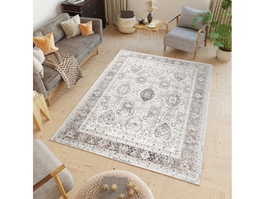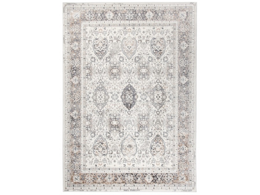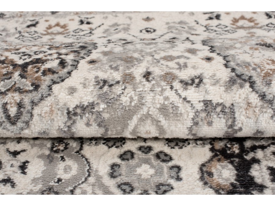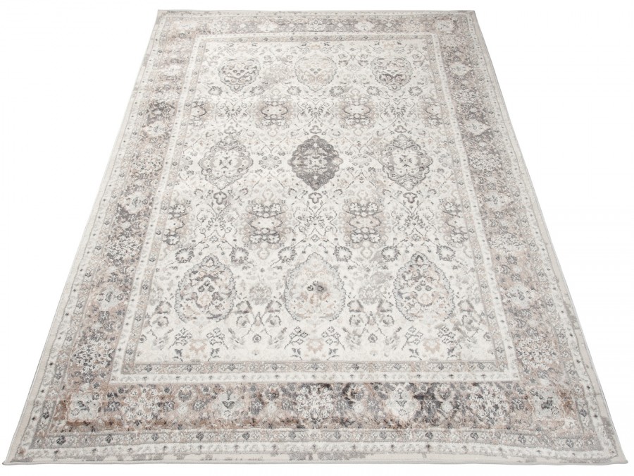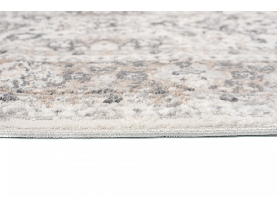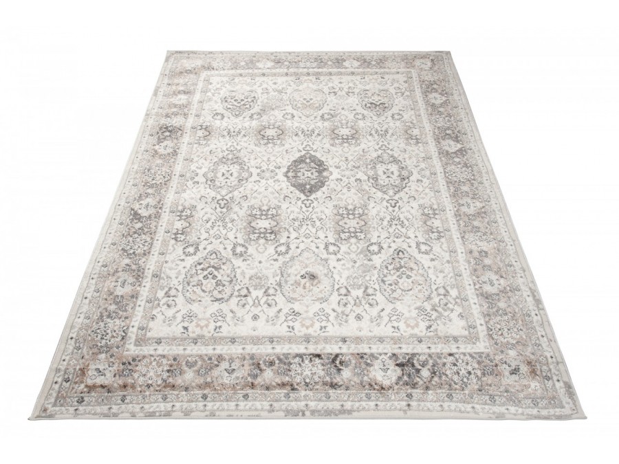 Dywan Villson 00.890a vizon z kolekcji Villson to prawdziwe dzieło sztuki, które zachwyca swoją subtelną elegancją i klasycznym wzornictwem. Dominującym kolorem dywanu jest delikatny beż, który nadaje mu stonowany i uniwersalny charakter. Beż ten jest idealnie zrównoważony przez dodatkowe odcienie, takie jak szarość, brąz oraz subtelne kremowe akcenty, które dodają głębi i wymiaru całej kompozycji. Wzór dywanu jest wyjątkowo bogaty i skomplikowany, nawiązując do tradycyjnych perskich motywów. Centralnym elementem jest duży, owalny medalion, otoczony przez symetryczne, kwiatowe ornamenty, które rozchodzą się promieniście na całą powierzchnię dywanu. Te detale są precyzyjnie wykonane, co sprawia, że dywan przyciąga wzrok i zachwyca swoją dbałością o szczegóły.