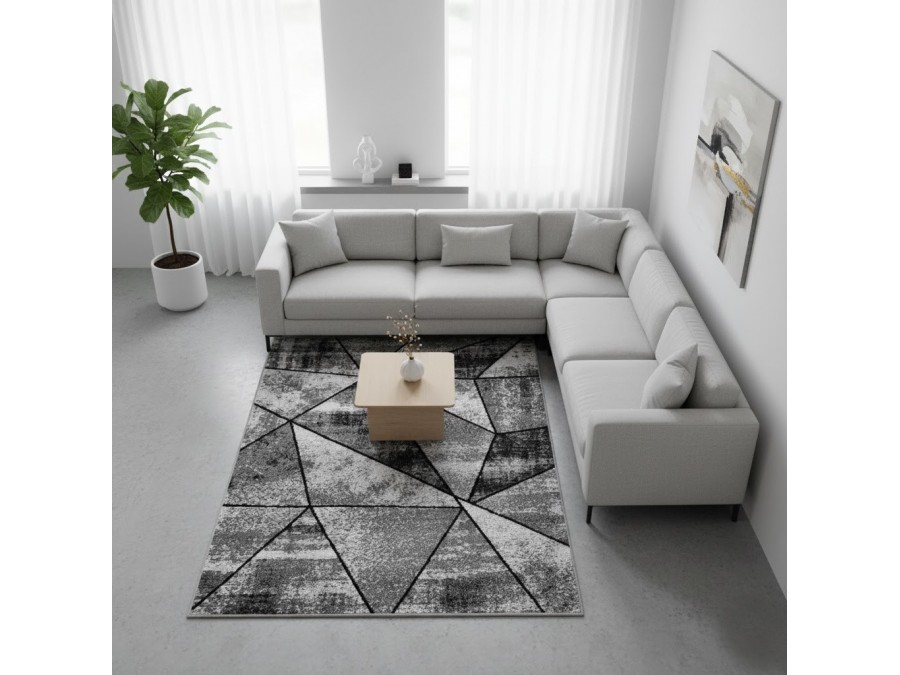 Dywan Dywan PP new 012 gray z kolekcji PP to prawdziwa perełka dla miłośników nowoczesnego designu. Jego głównym kolorem jest szary, który nadaje wnętrzu elegancji i stonowanej klasy. Kolor ten jest niezwykle uniwersalny, dzięki czemu dywan ten może znaleźć swoje miejsce w różnorodnych aranżacjach. Dodatkowe odcienie czerni i bieli w subtelny sposób przeplatają się z szarością, tworząc dynamiczny kontrast, który przyciąga wzrok. Wzór dywanu jest geometryczny, oparty na trójkątach o różnych rozmiarach, które układają się w harmonijną, ale zarazem intrygującą kompozycję. Trójkąty te są nieregularnie rozmieszczone, co dodaje dywanowi nowoczesnego charakteru i sprawia, że każdy fragment dywanu jest unikatowy. Kształt dywanu jest prostokątny, co czyni go idealnym do większości pomieszczeń, zarówno tych o klasycznym, jak i minimalistycznym wystroju. Dywan nie posiada frędzli, co dodaje mu współczesnego wyglądu, a jednocześnie ułatwia utrzymanie w czystości.