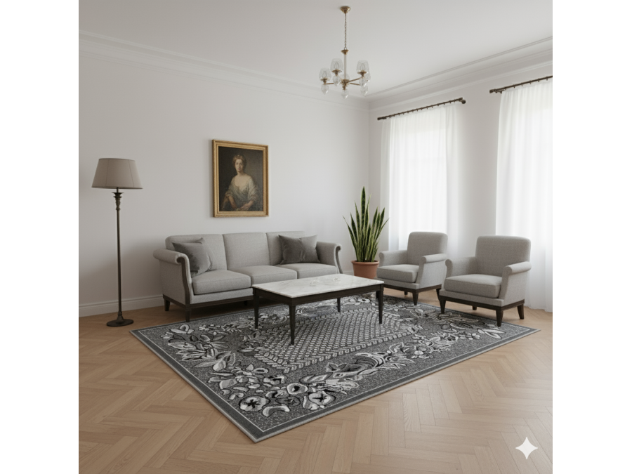 Jeśli szukasz inspiracji, jak urządzić wnętrze z tym dywanem, wyobraź sobie salon w stylu modern vintage. Dywan Dywan PP new 7192 gray idealnie pasuje pod ciemne drewniane meble z lekkimi, pastelowymi akcentami. Możesz go położyć pod okrągłym stołem z eleganckimi krzesłami, tworząc przytulną strefę jadalnianą. Na ścianach zawieś obrazy w czarno-białych ramach, które będą korespondować z kolorystyką dywanu. Dodaj kilka roślinnych dekoracji w donicach, które nawiążą do floralnego motywu dywanu. Taki dywan spodoba się osobom ceniącym harmonię, elegancję i ponadczasowe piękno. Zachęcamy do zakupu, bo Dywan PP new 7192 gray to nie tylko ozdoba, ale i inwestycja w styl i komfort Twojego domu.