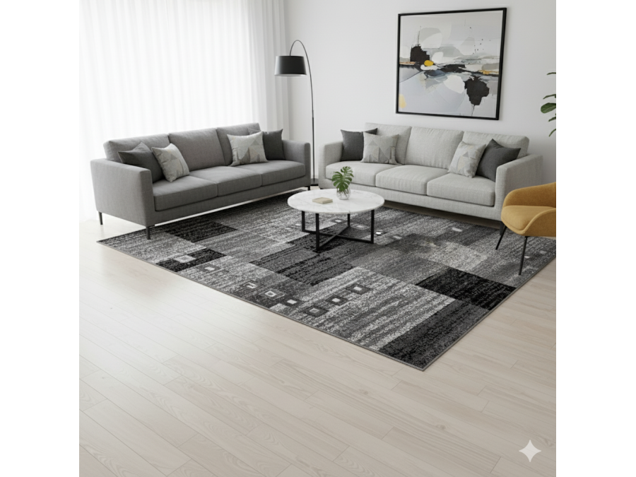 Dywan Dywan PP new 765 gray z kolekcji PP to prawdziwa perełka dla miłośników nowoczesnego designu. Jego głównym kolorem jest szary, który nadaje wnętrzu elegancji i spokoju. Szarość ta jest głęboka, ale nie przytłaczająca, co sprawia, że dywan doskonale komponuje się zarówno w minimalistycznych, jak i bardziej eklektycznych przestrzeniach. Dodatkowymi kolorami są odcienie ciemnoszarego i jasnoszarego, które tworzą dynamiczny, geometryczny wzór. Wzór ten składa się z dużych, prostokątnych pól, które są ułożone w sposób przypominający mozaikę. Każde z tych pól jest podzielone na mniejsze kwadraty, co dodaje dywanowi nowoczesnego, niemal industrialnego charakteru. Na niektórych polach znajdują się małe, kwadratowe wgłębienia, które dodają głębi i struktury, czyniąc dywan jeszcze bardziej interesującym wizualnie. Dywan ma kształt prostokąta, co sprawia, że jest uniwersalny i łatwy do dopasowania do różnych pomieszczeń. Nie posiada frędzli, co podkreśla jego minimalistyczny styl.